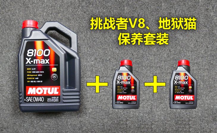 挑战者V8(包含5.7、6.4及地狱猫)的7L套装,采用的是8100 0W40 X-MAX系列,5L装一桶+1L装两小瓶
