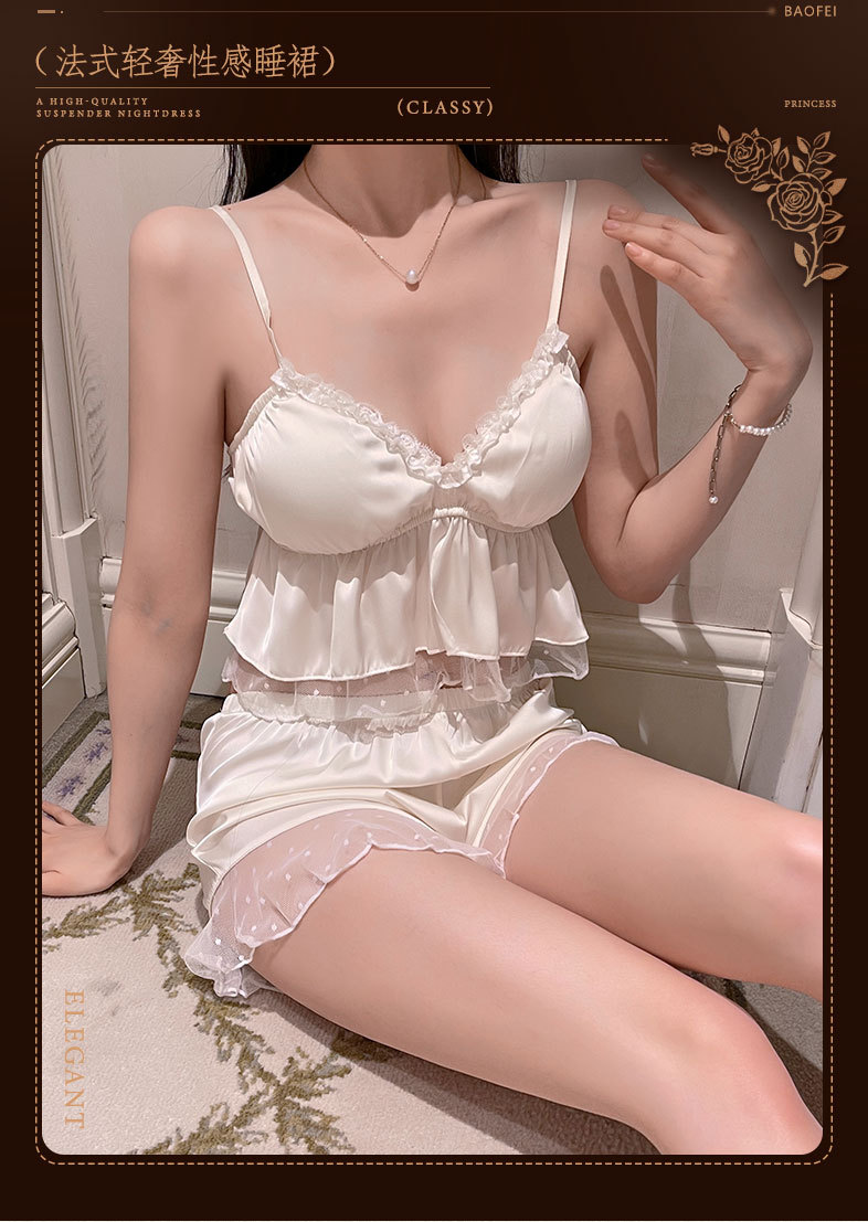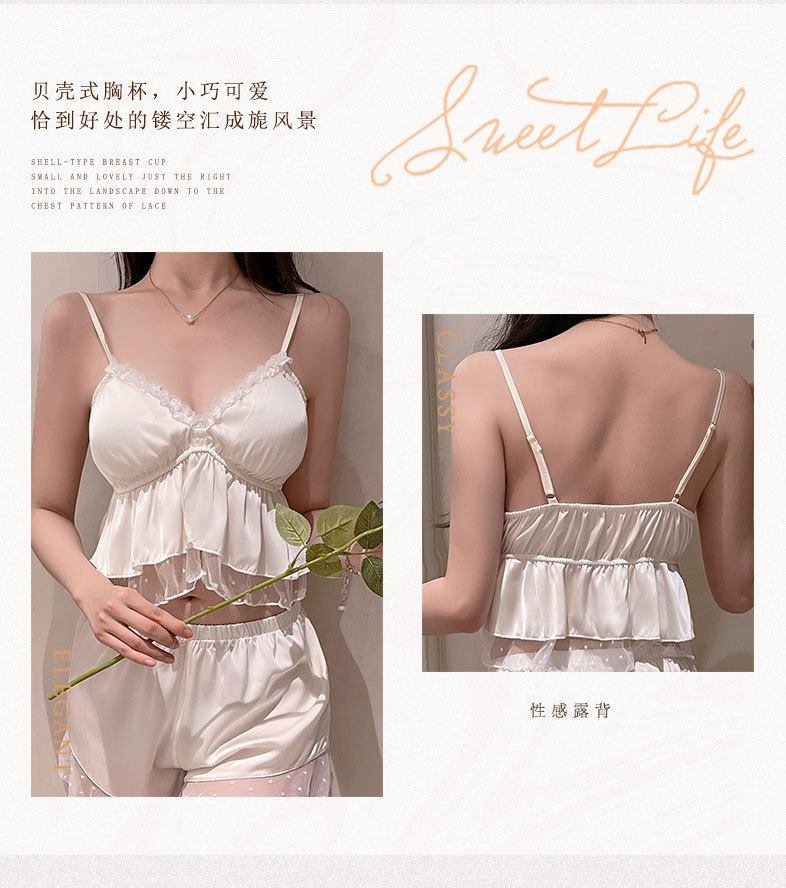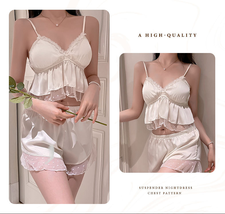 【又纯又欲!性感蕾丝家居服套装】吊带低胸,心机美背,好看又迷人!新款高级感性感睡衣纯欲蕾丝花边拼接吊带短裤两件家居套装女波点私房上衣休闲无袖短裤情趣