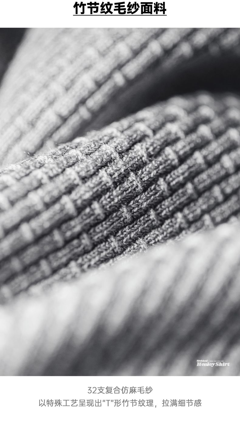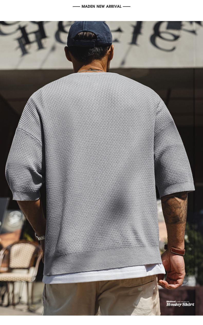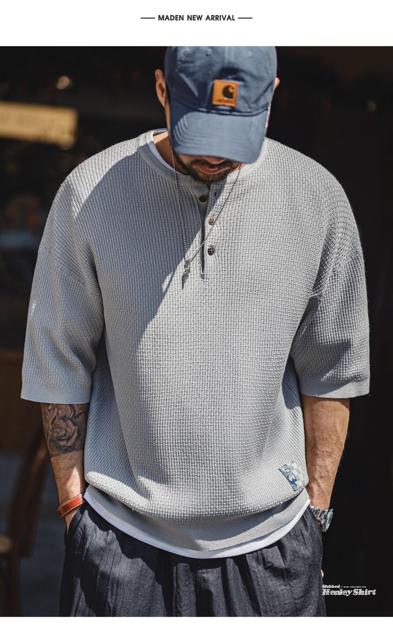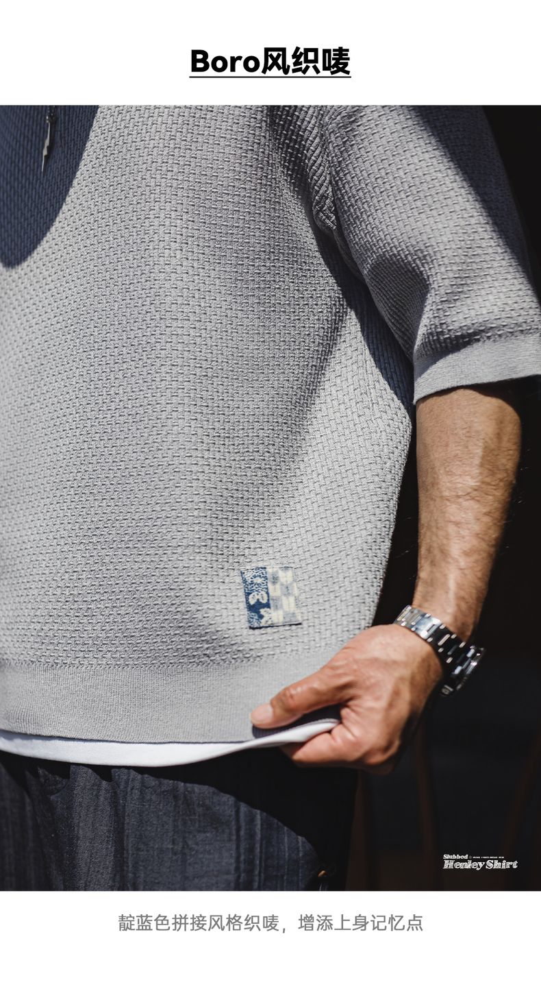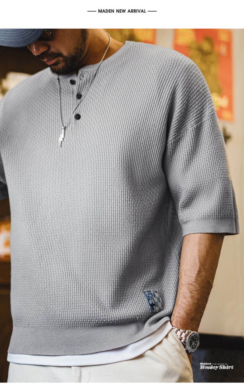 工装优选美式竹节纹亨利衫短袖老钱垂感针织灰色宽松半袖T恤男夏