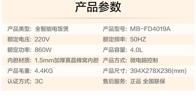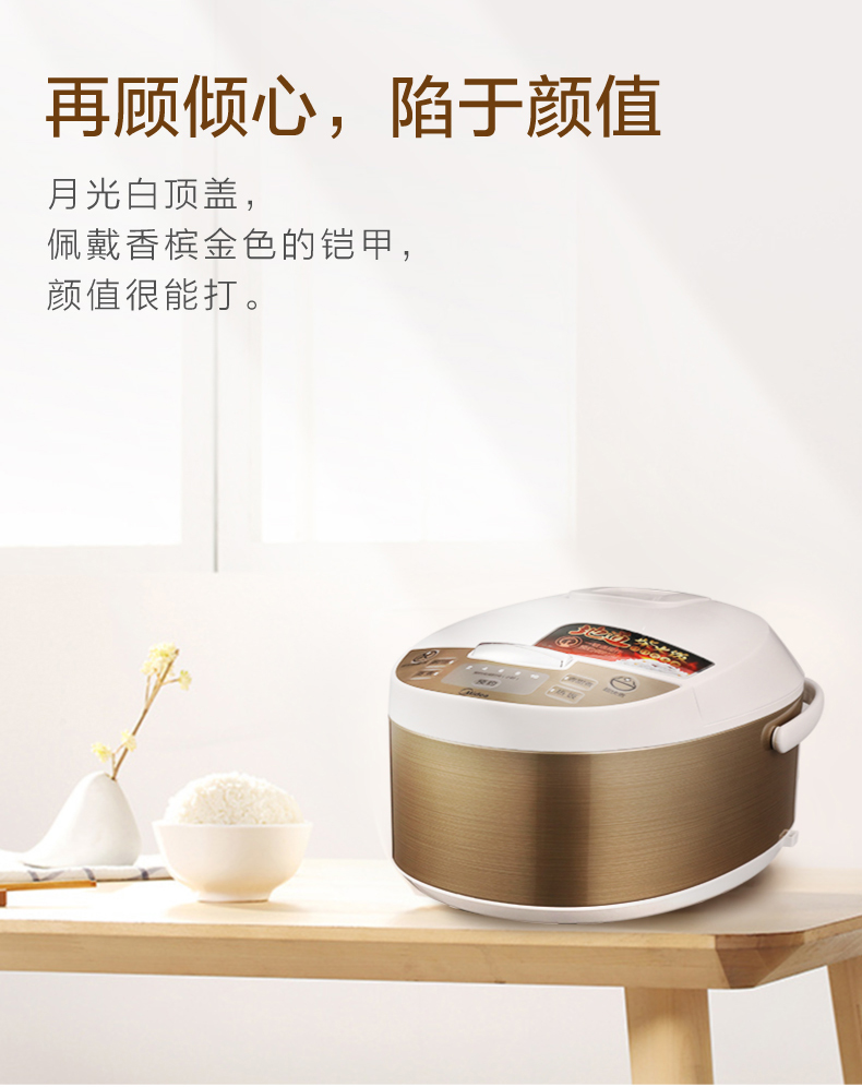 美的(Midea)电饭煲4L智能预约家用保温 黄晶内胆 10小时预约MB-FD4019A