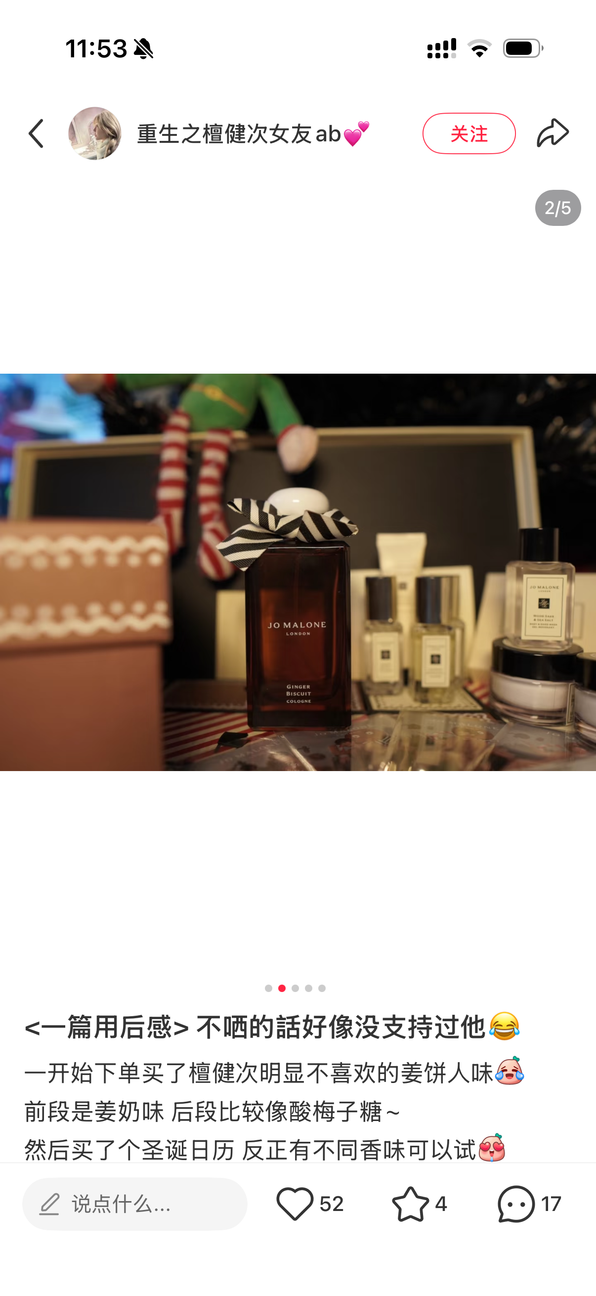 最后以温润的檀香木+柔和的香草收尾,木质调的沉稳中和了甜腻,留下绵长又安心的暖意,像被冬日毛毯轻轻裹住。