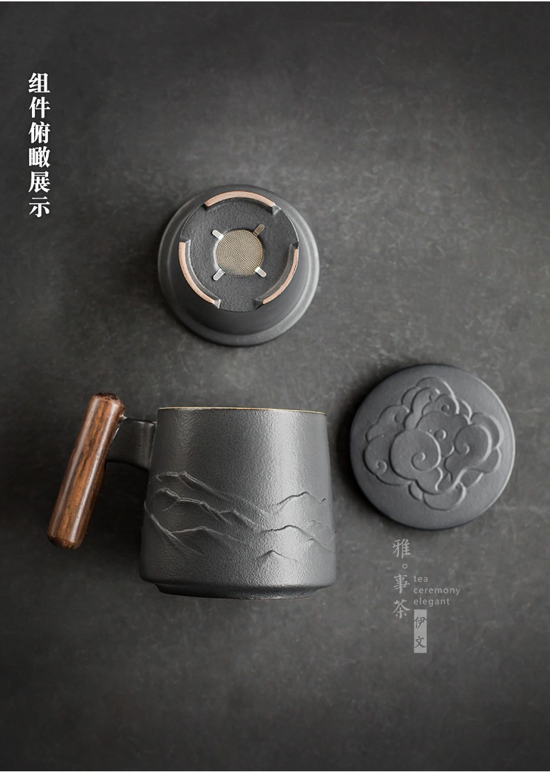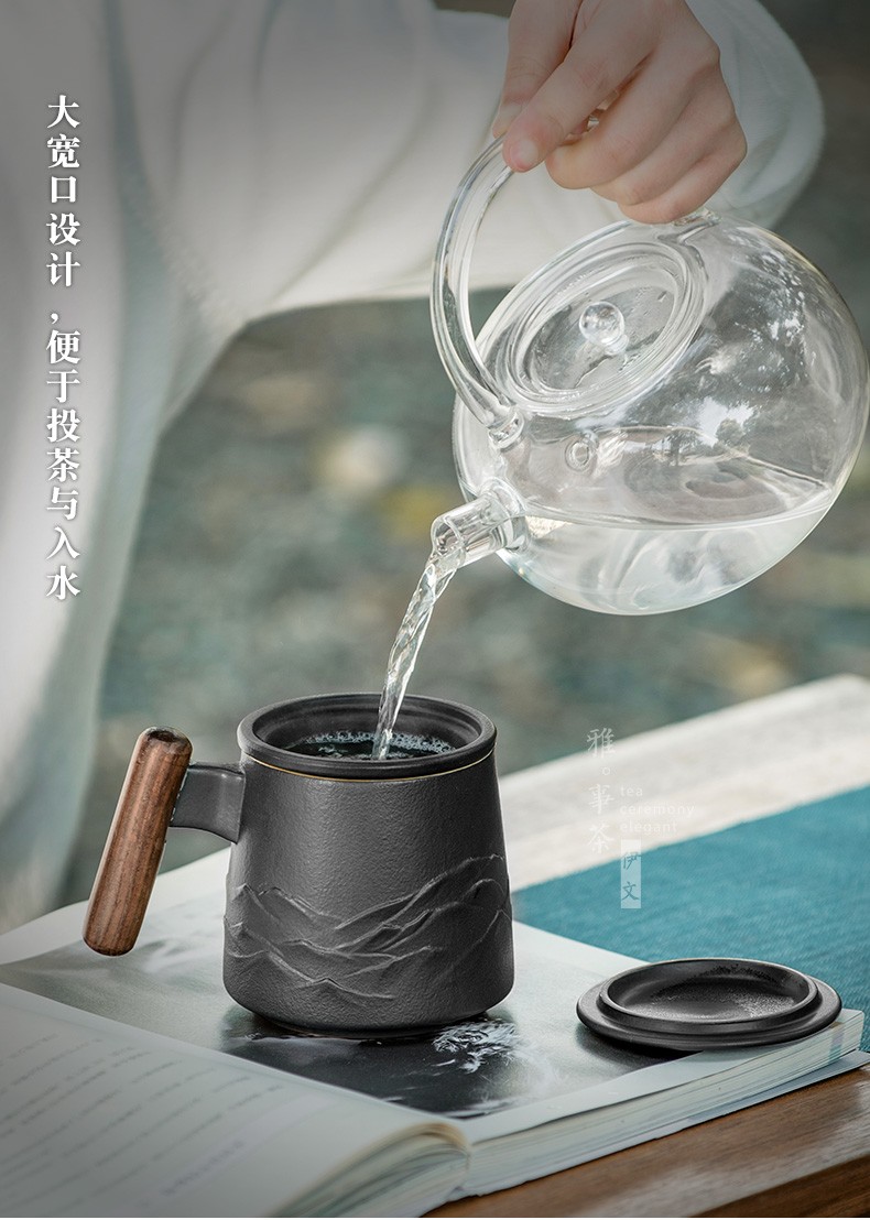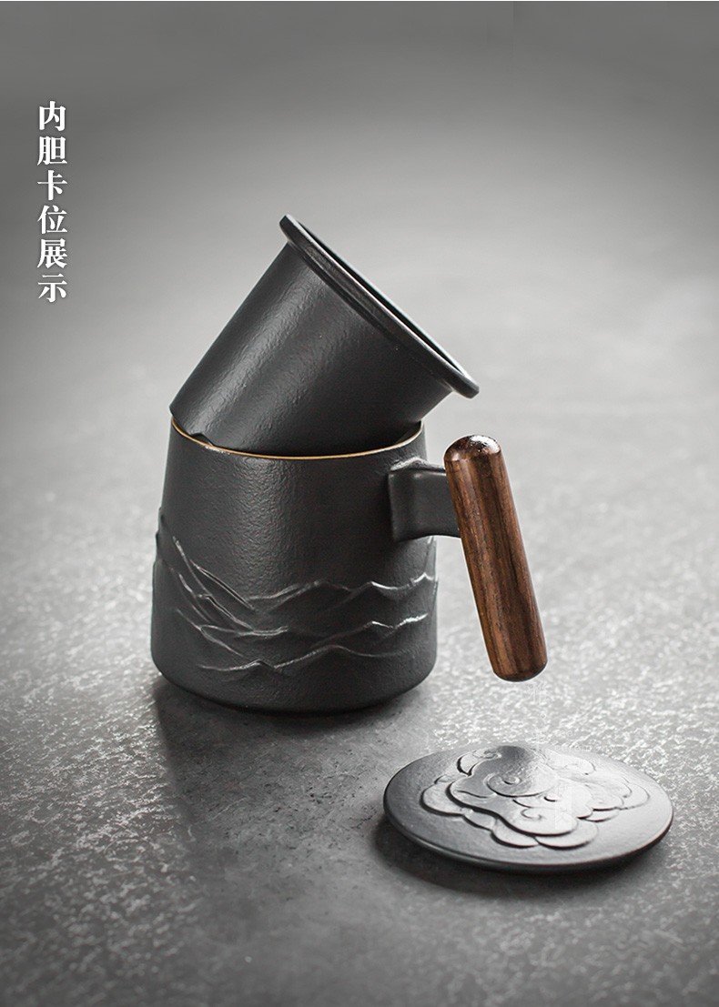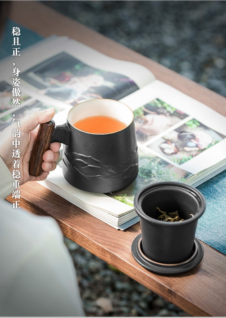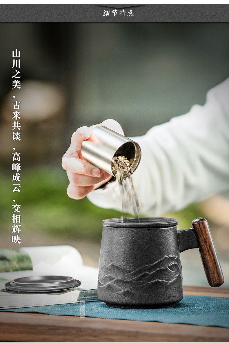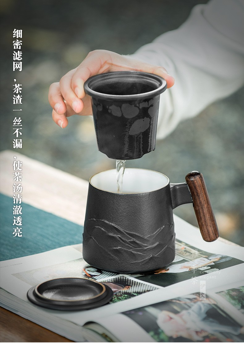 陶瓷过滤茶杯个人办公泡茶杯子家用带盖喝茶水杯茶水分离 山川矮款过滤杯(木柄)S1d