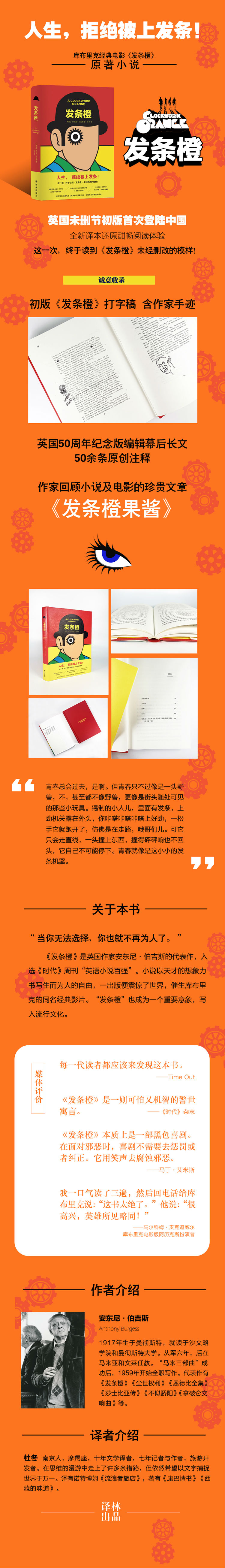 广告语:人生,拒绝被上发条!库布里克经典电影《发条橙》原著小说,未删节版,全新译本,收录初版打字稿(含作家手迹)、50余条原创注释