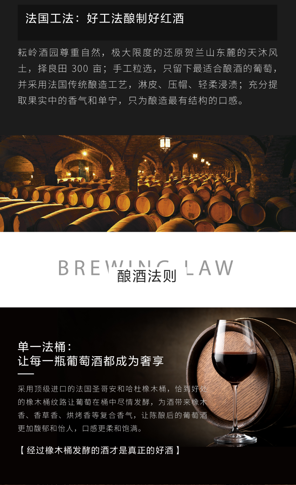 酿造工艺:发酵前冷浸渍,恒温控制发酵以更好的萃取果皮上的色泽和酚类物质,发酵完成后,带皮浸渍2-3周,最后在法国橡木桶中陈酿12个月,以确保葡萄酒呼吸后的柔和口感。
