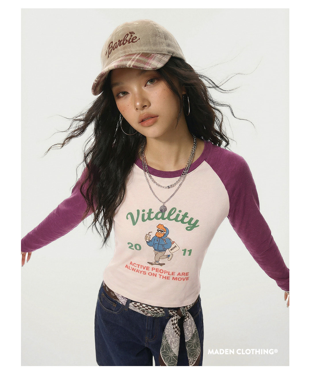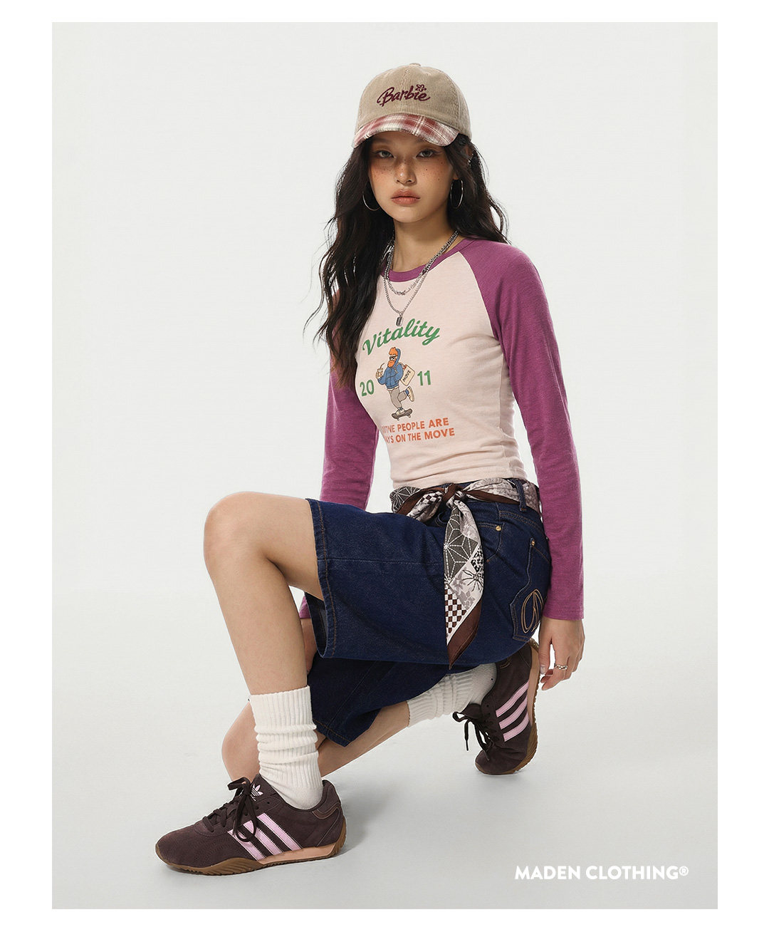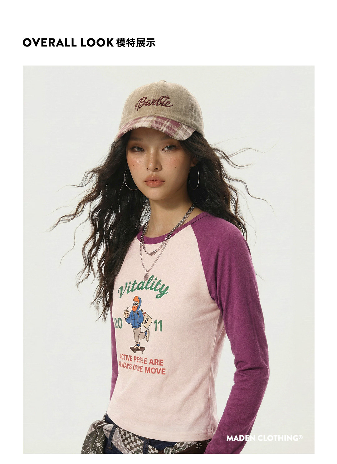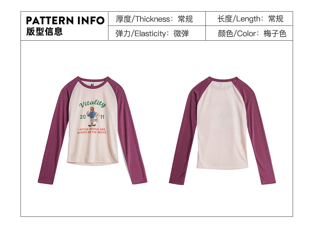 马登美式莱赛尔圆领撞色插肩修身显瘦印花长袖T恤打底衫上衣女春