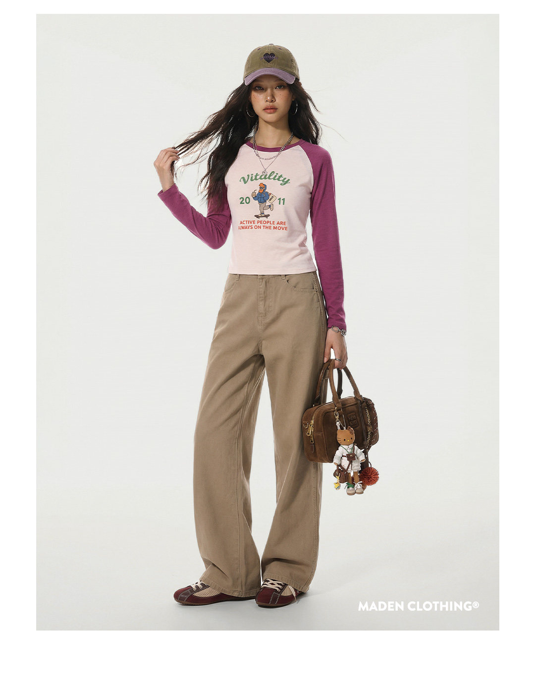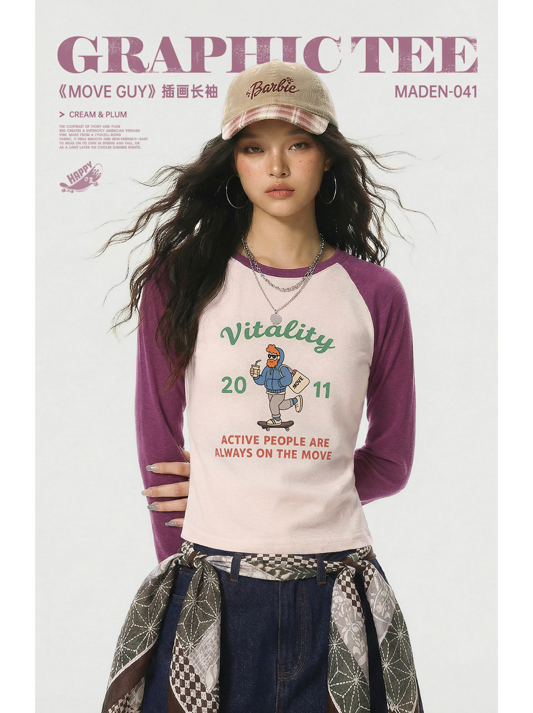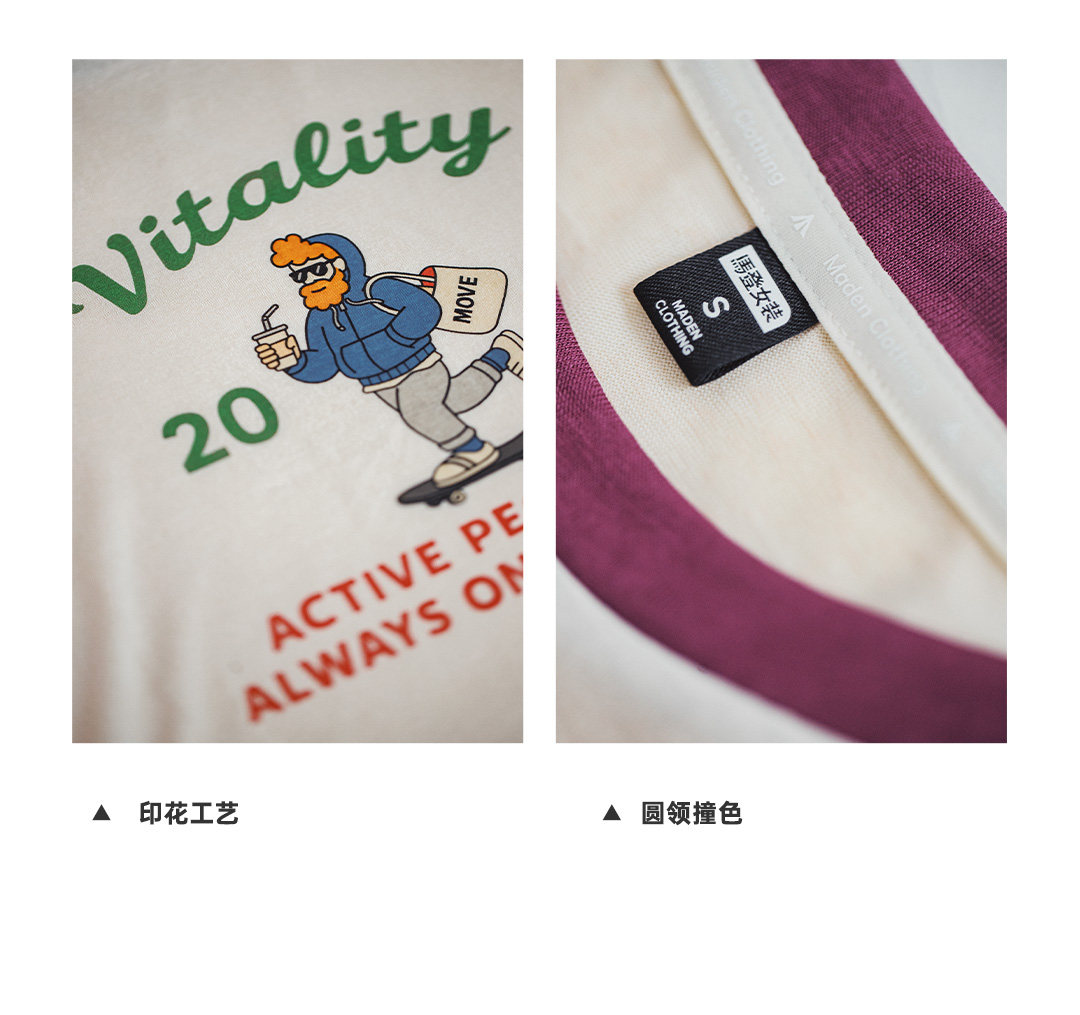 马登美式莱赛尔圆领撞色插肩修身显瘦印花长袖T恤打底衫上衣女春
