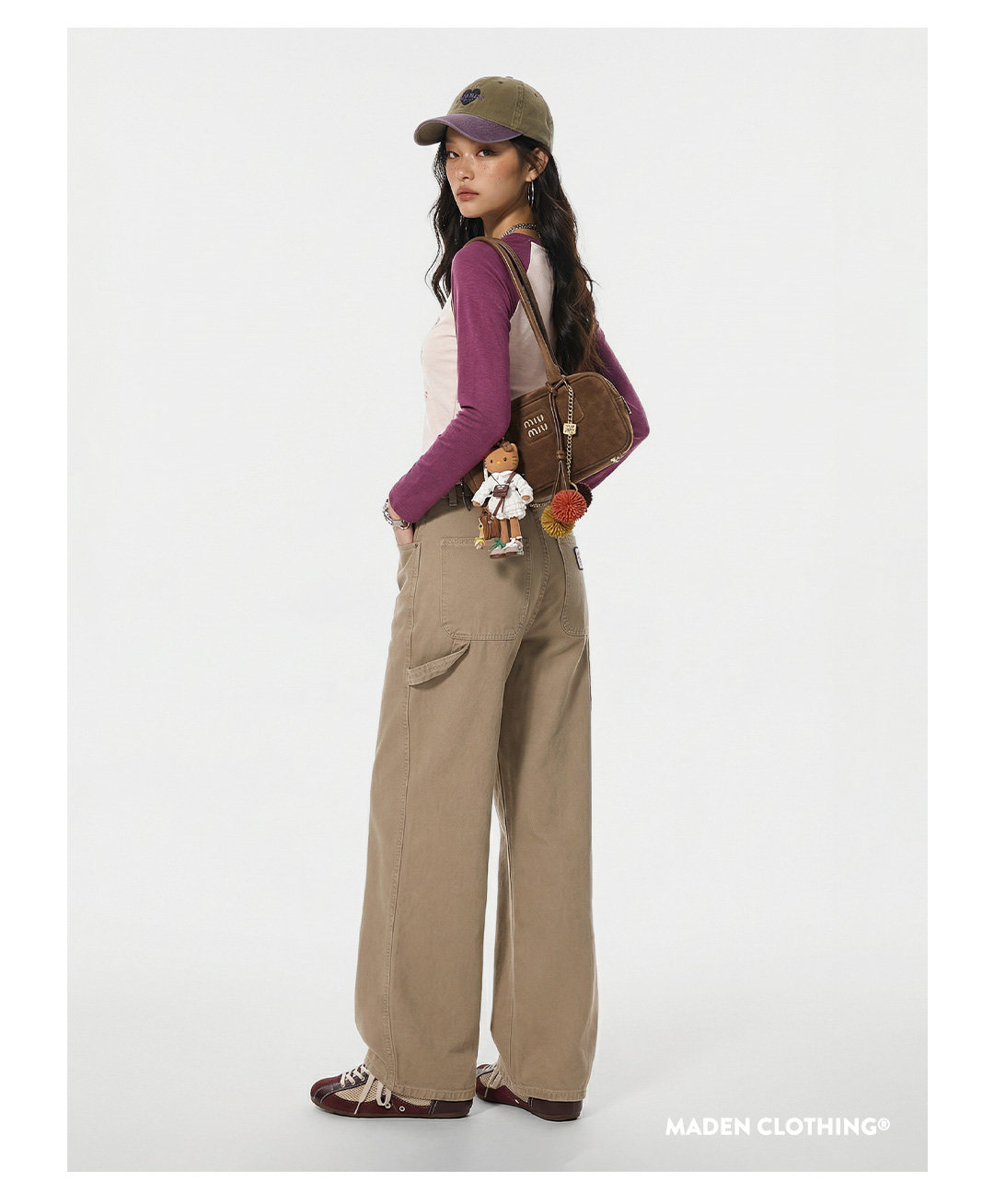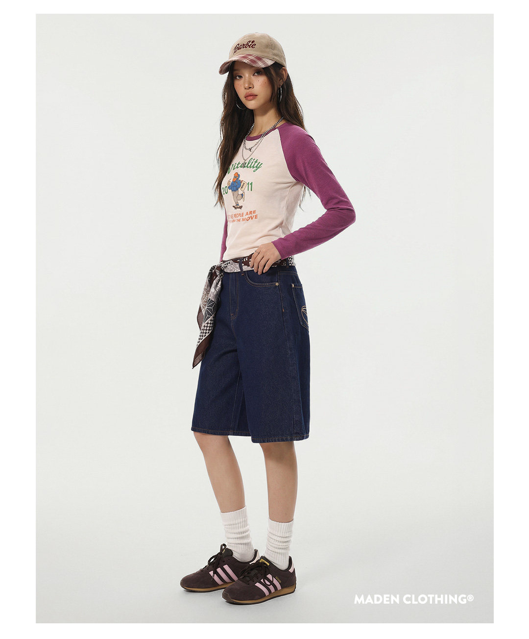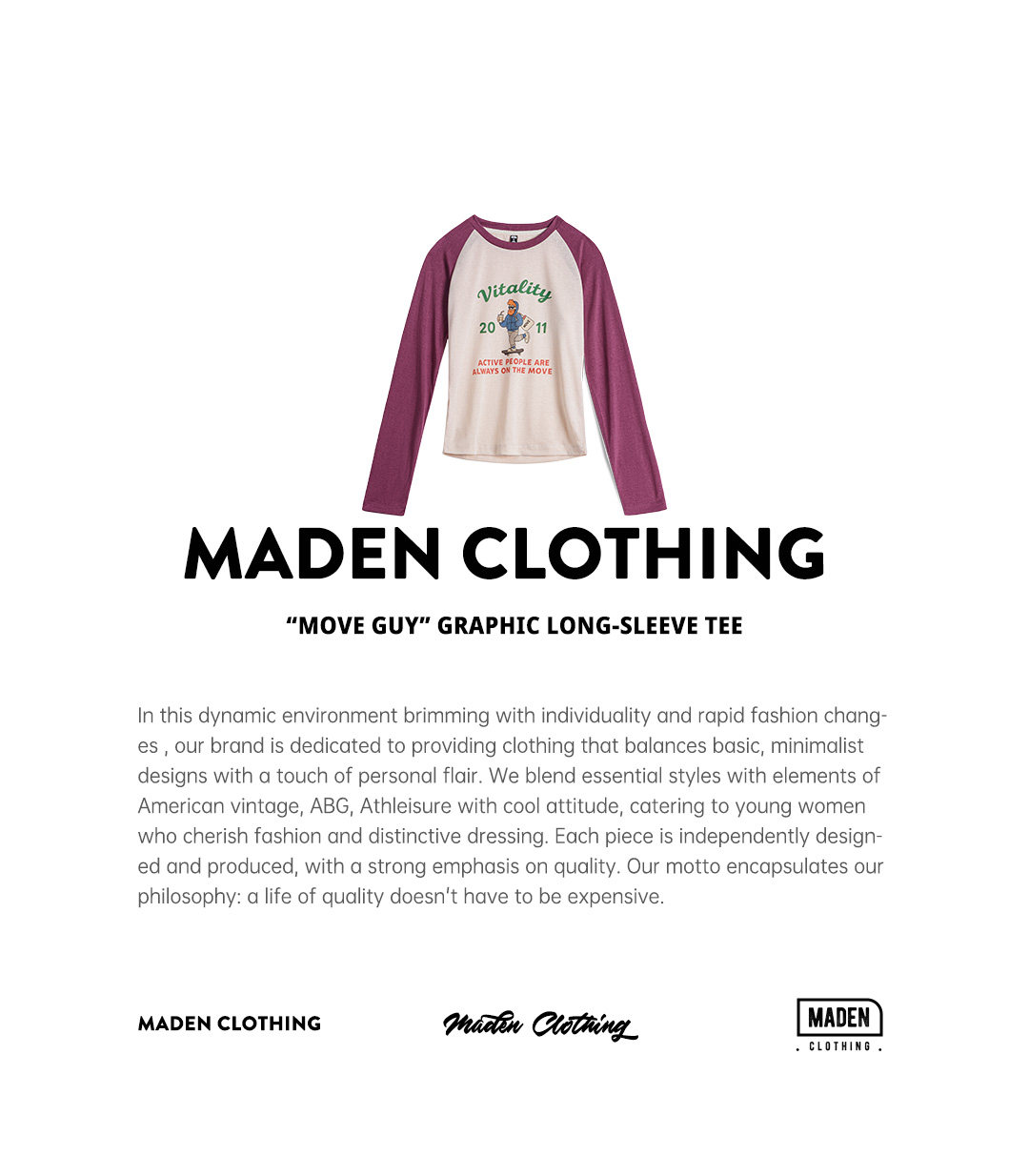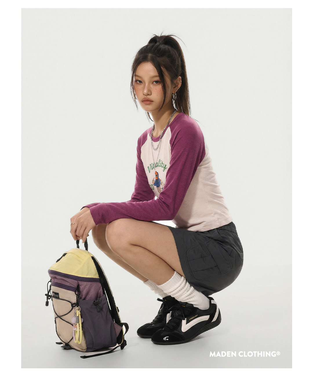马登美式莱赛尔圆领撞色插肩修身显瘦印花长袖T恤打底衫上衣女春