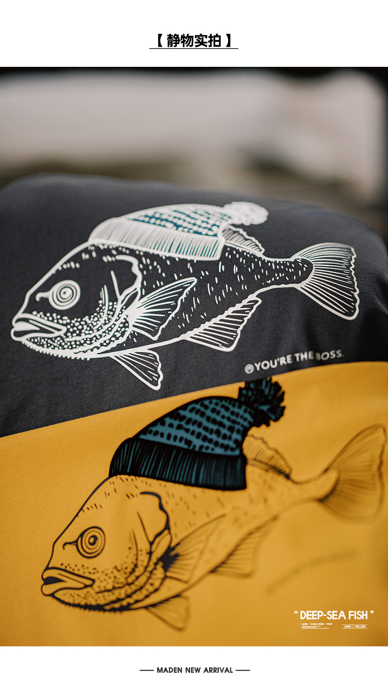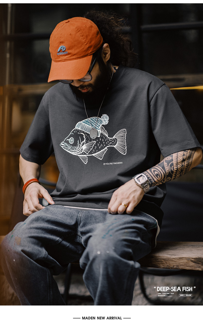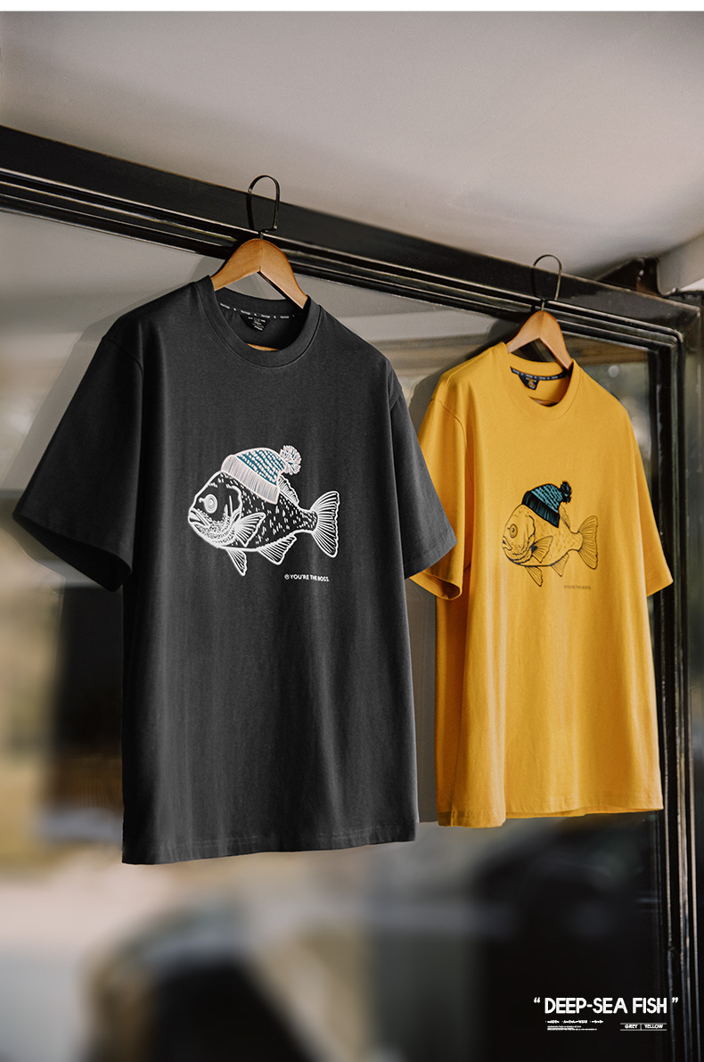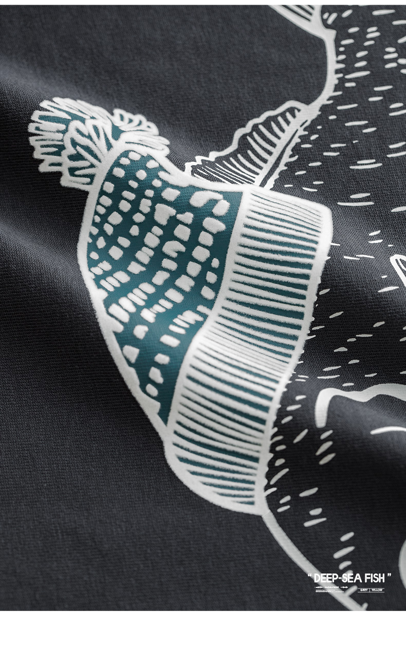 工装优选 美式复古深海鱼植绒印花T恤动物纯棉圆领短袖体恤男夏季