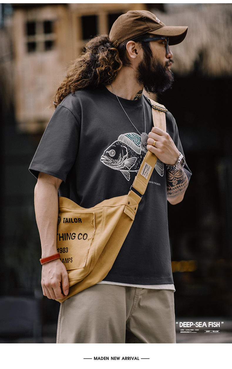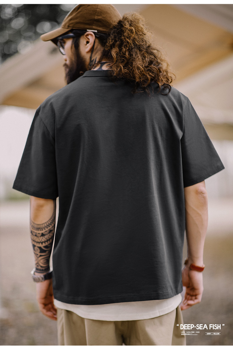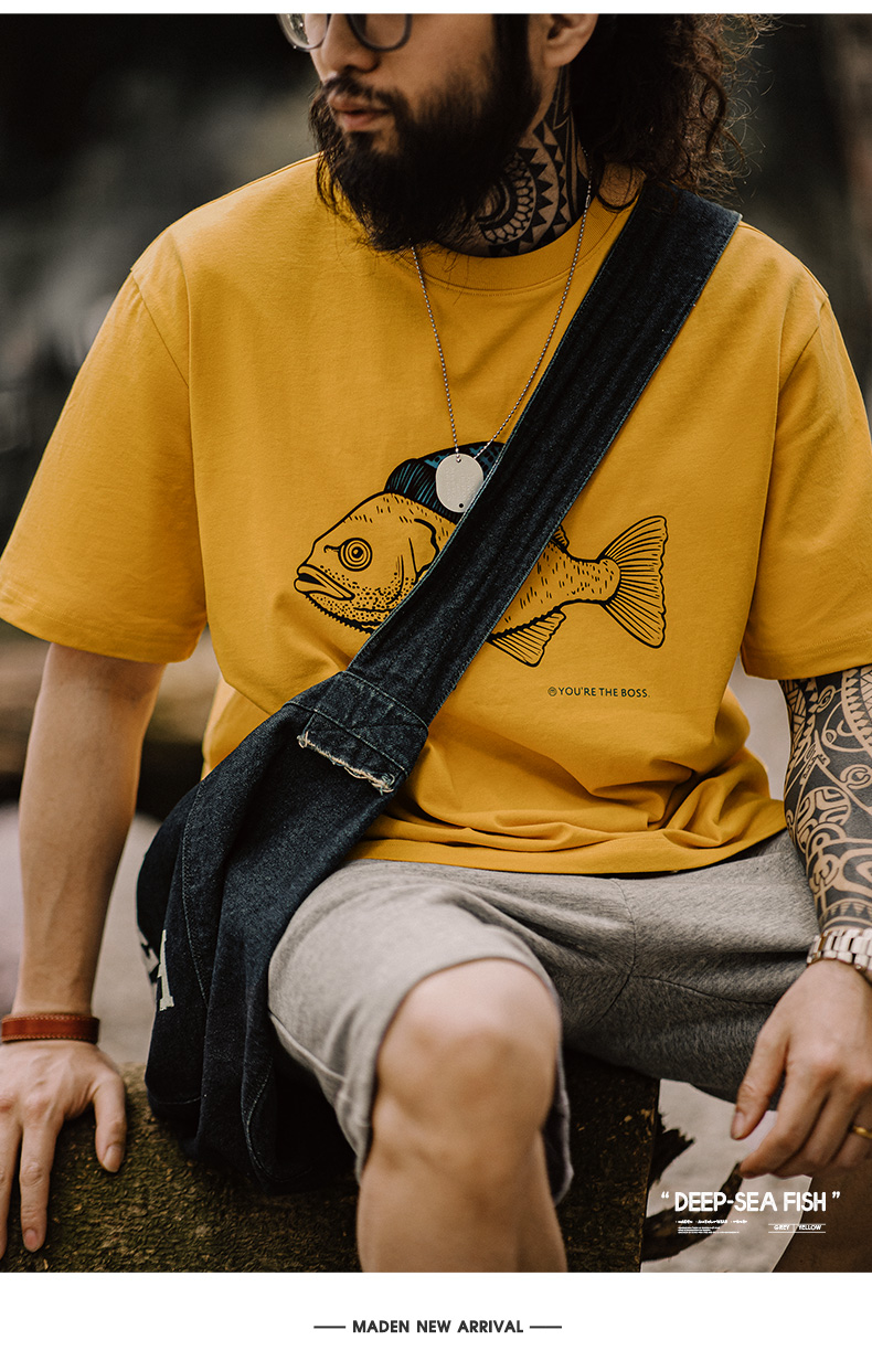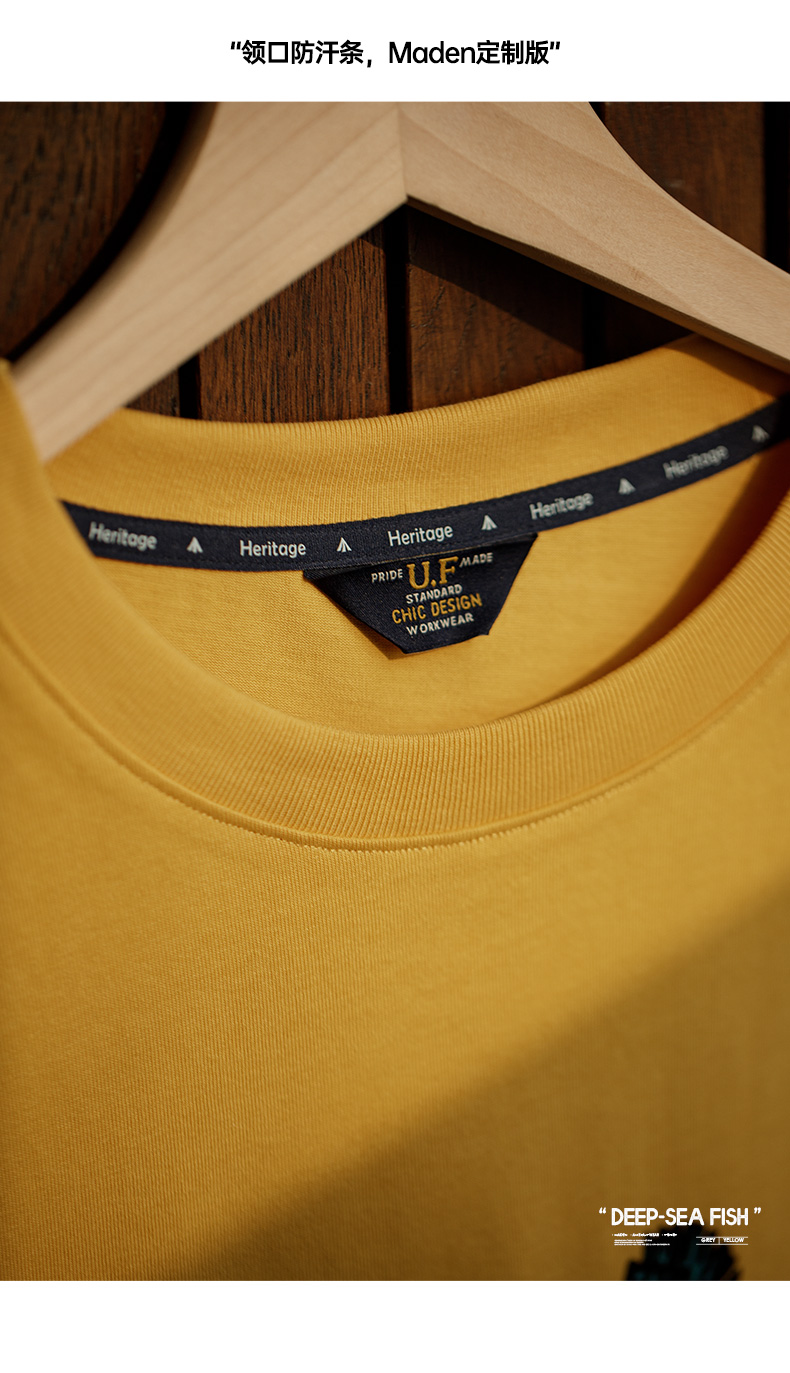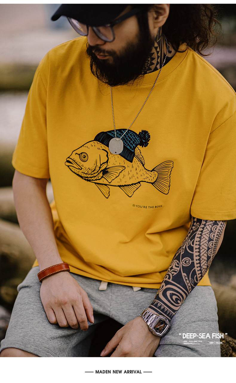 工装优选 美式复古深海鱼植绒印花T恤动物纯棉圆领短袖体恤男夏季
