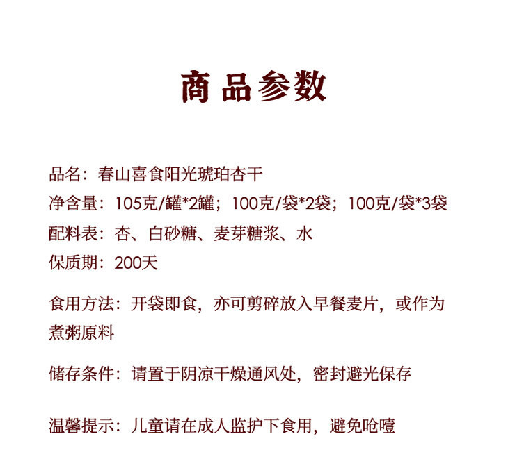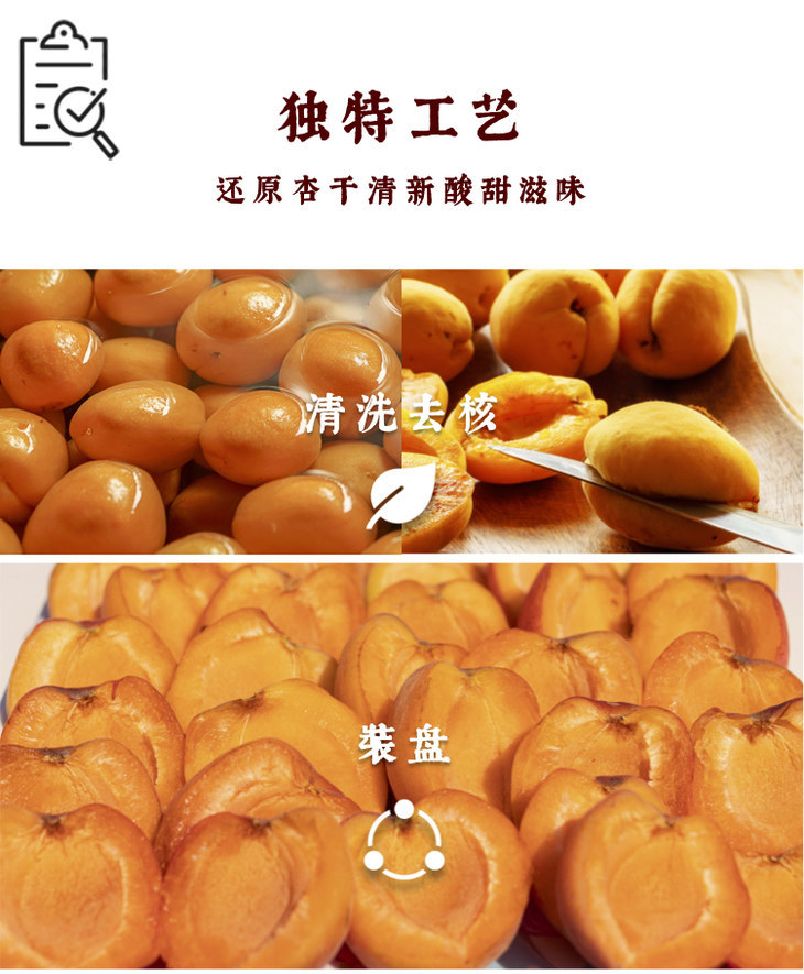 杏干甄选陕西渭南金太阳杏,因为光照够、雨水足,肉厚饱满不说,味道还特别醇正,先天条件已经超越很多同品类,通过手工清洗去核、恒温烘烤,制作过程只添加了天然“保鲜剂”麦芽糖,用适当的甜度中和了酸味,且能提升口感,没有添加防腐剂,让本身的果糖、氨基酸蛋白质自然发生聚合反应,杏干也更是自然健康。