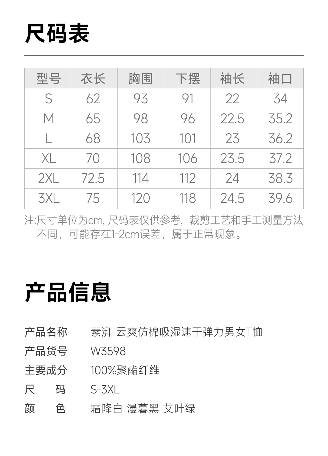 【吸湿速干干爽舒适】素湃云爽仿棉圆领吸湿速干T恤W3598弹力纤维自在无束缚