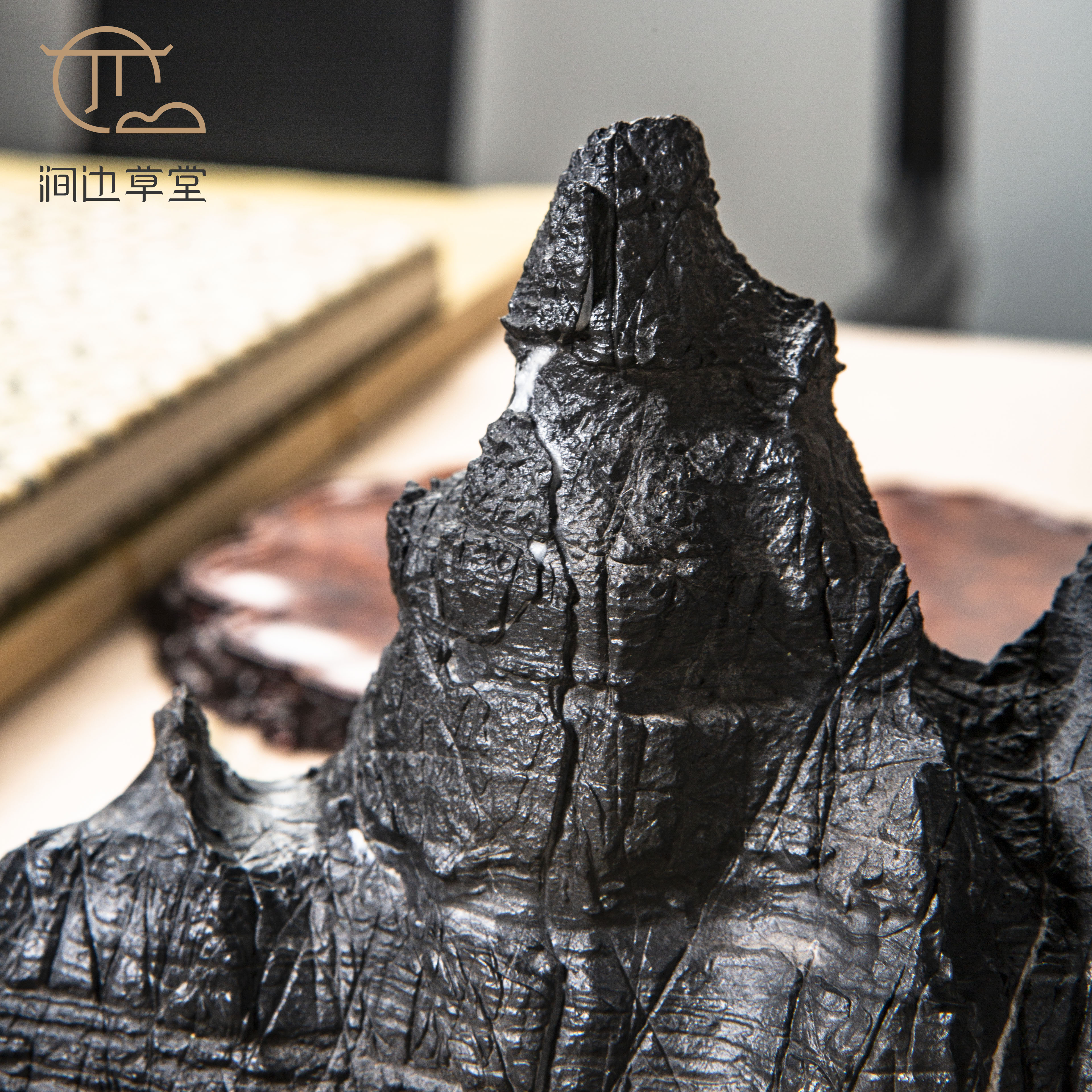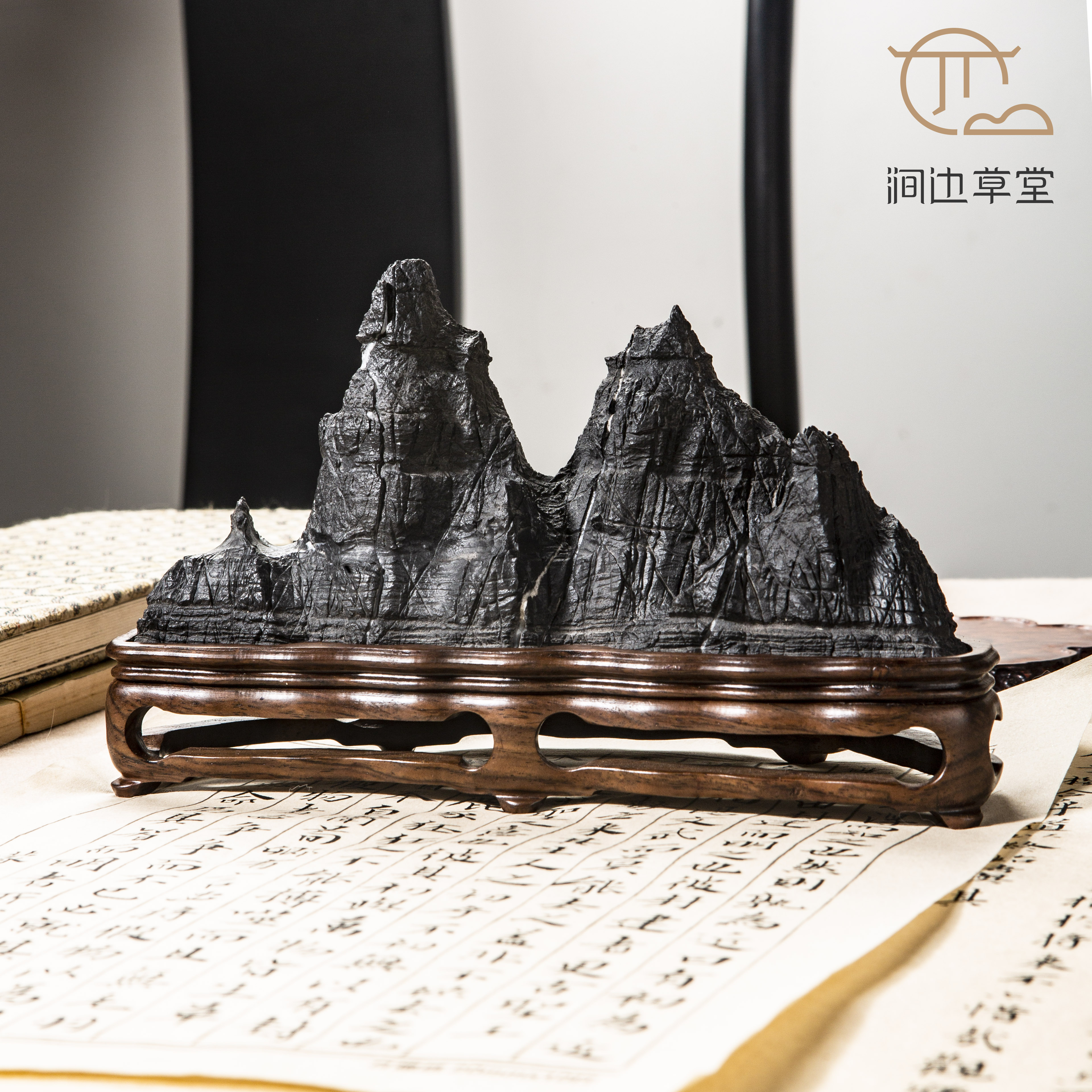 灵璧石群峰山子精品赏石,原石原底,未经任何人工修饰,配有专属底座。石纹褶皱缠结,肌理缜密,石表起伏跌宕,沟壑交错,造型妙趣天成,气韵苍古,可置放案几上别有一番雅致。