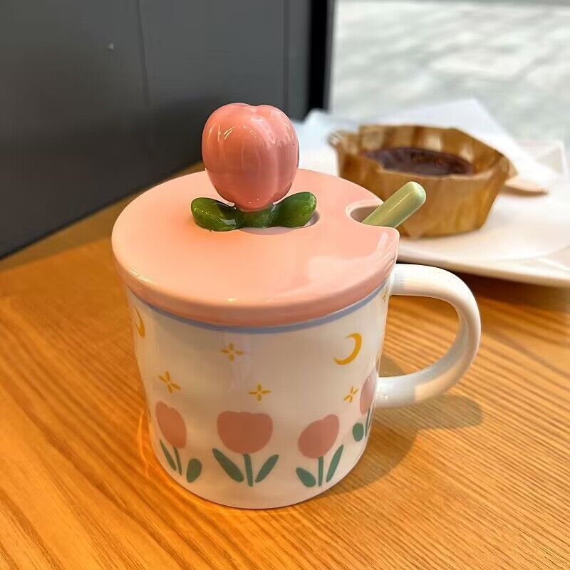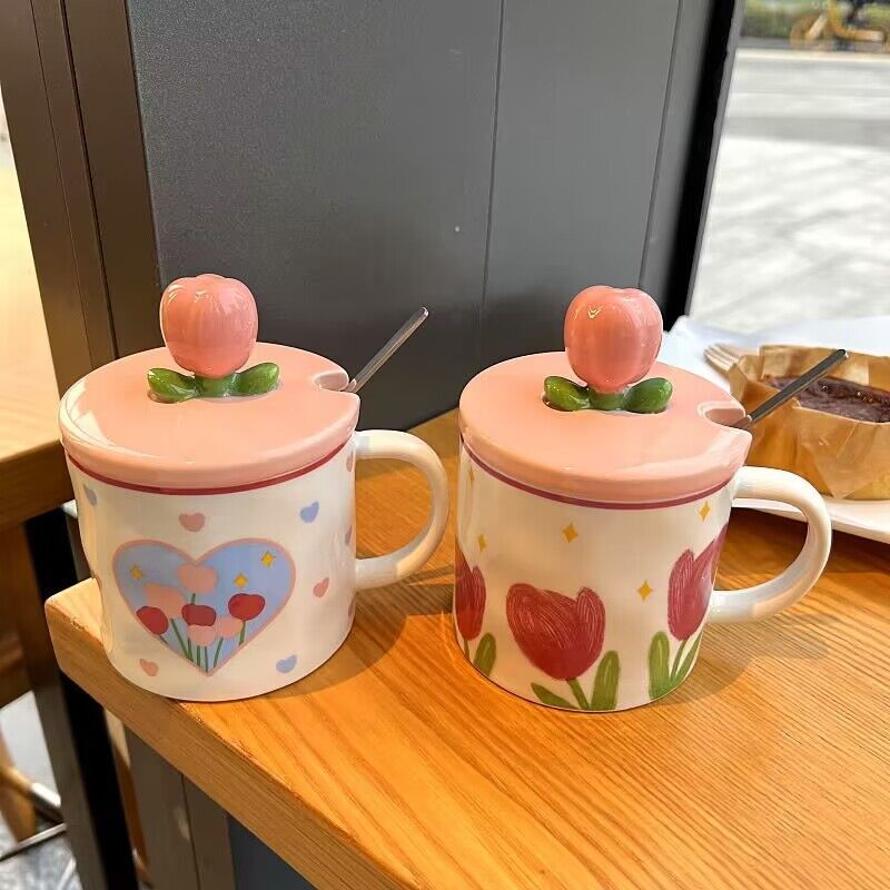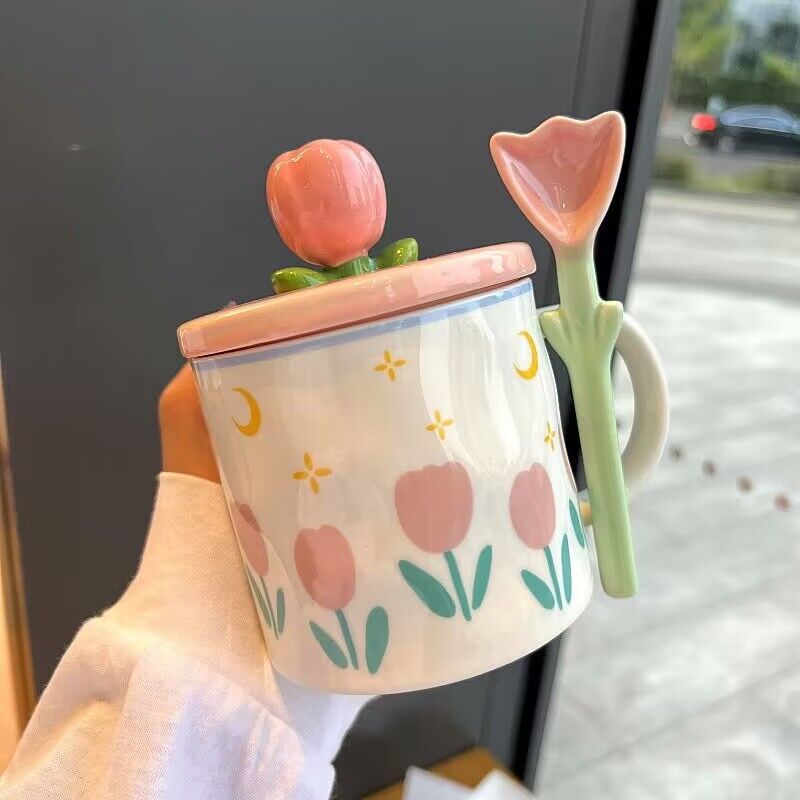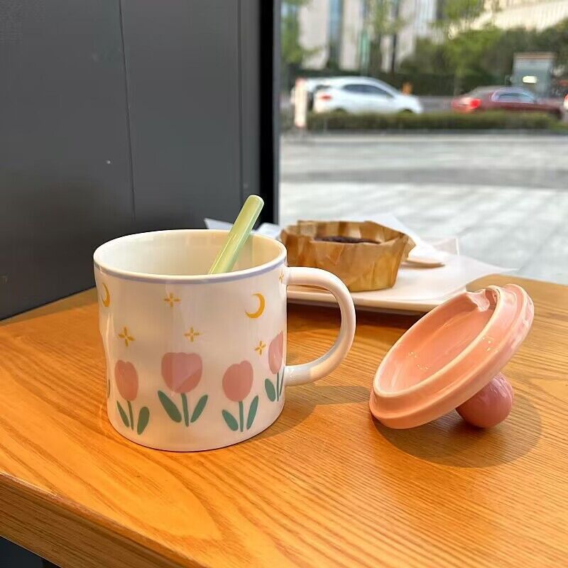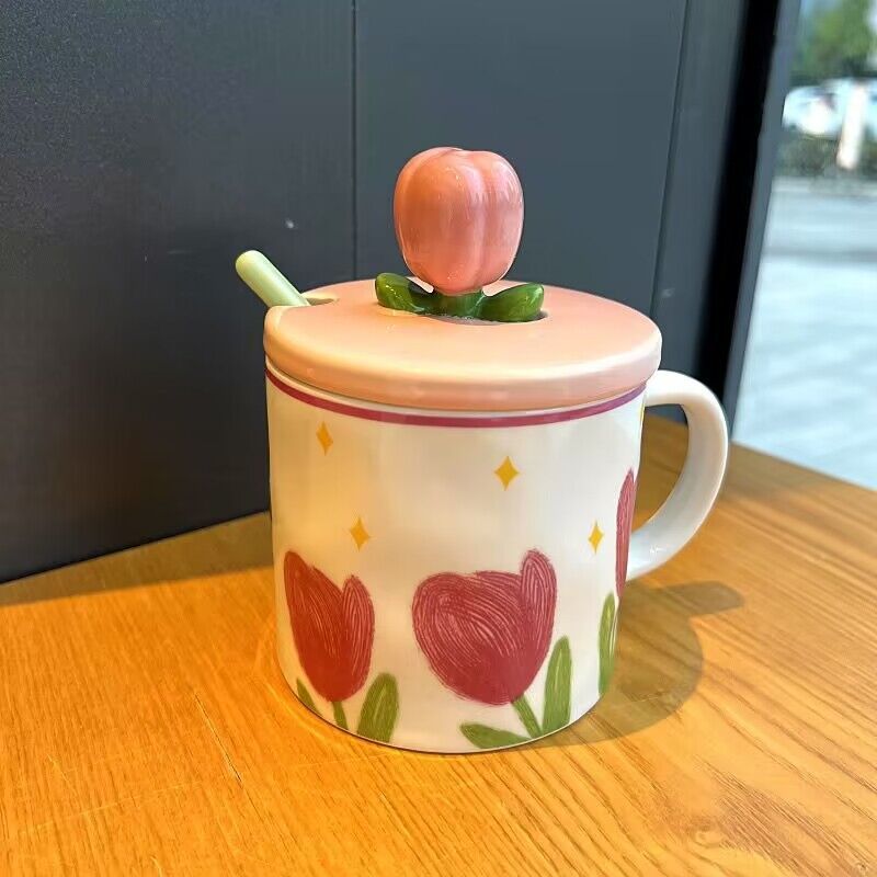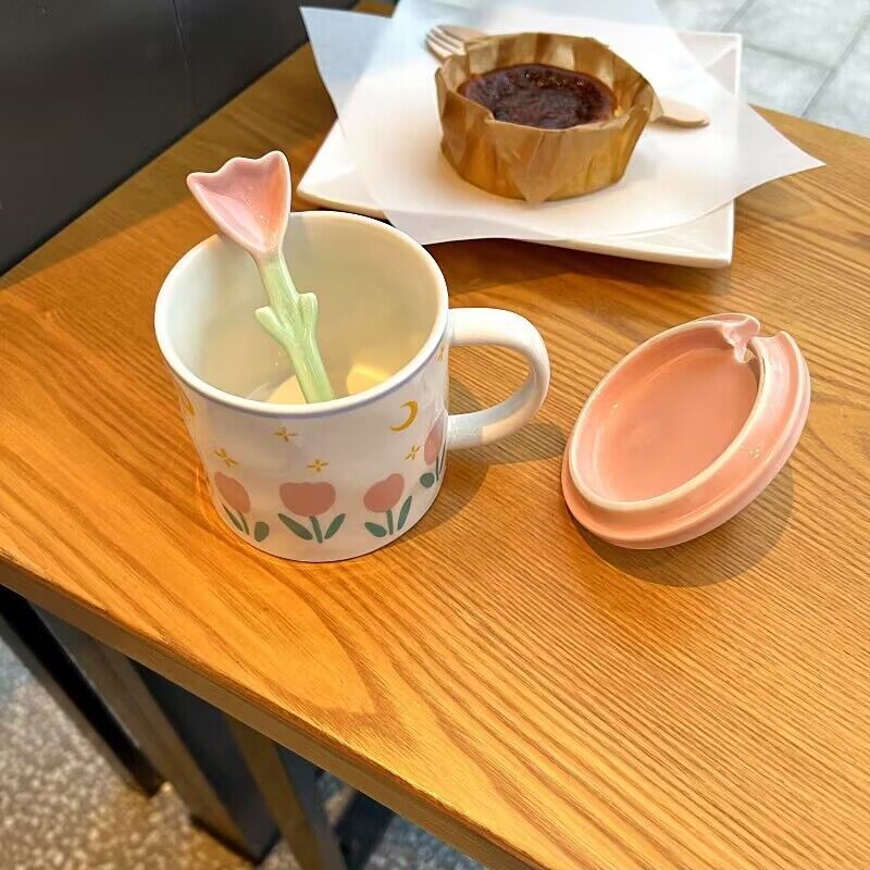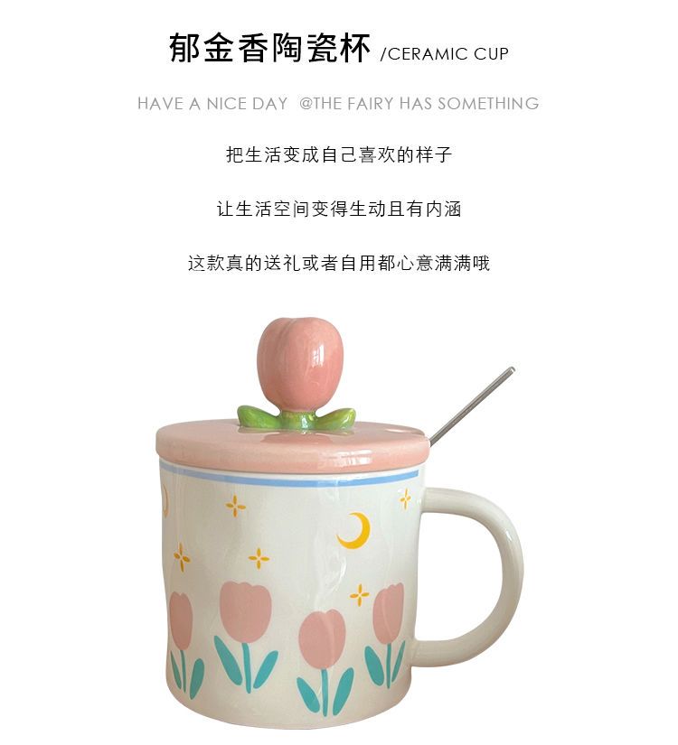少女心郁金香杯子有盖办公室ins风马克杯高颜值陶瓷水杯生日礼物