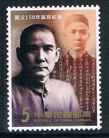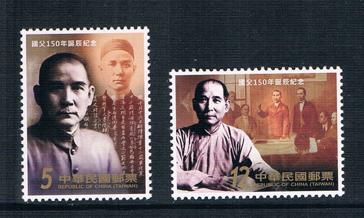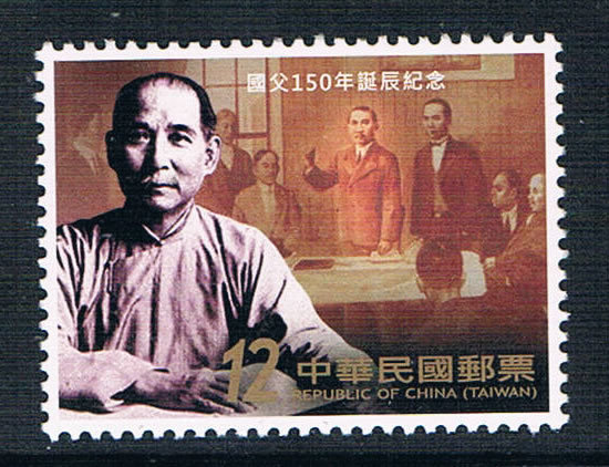 今年适逢孙中山先生诞辰150年,为表崇敬及缅怀之意,台湾中华邮政于去年11月12日发行了纪念邮票1套2枚。邮票图案简介如下: