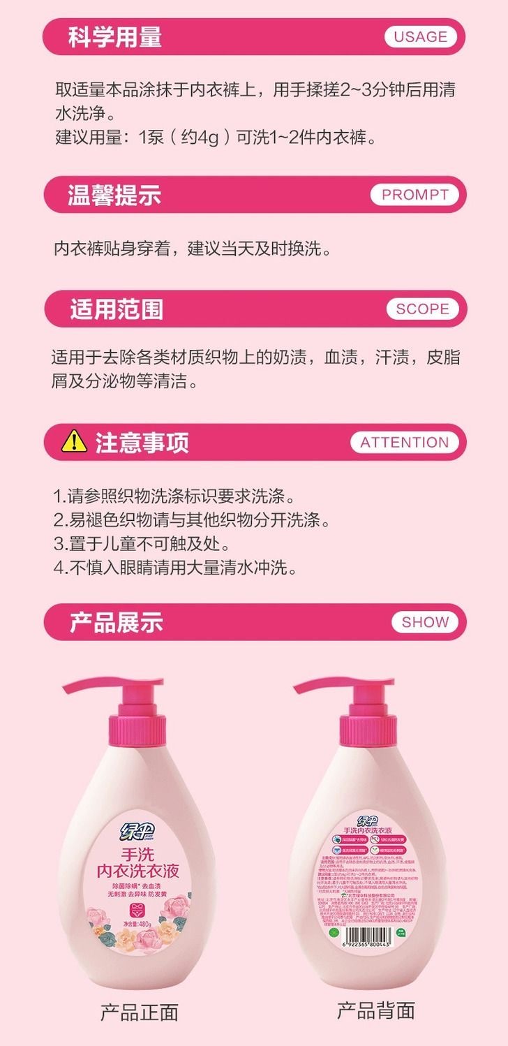 绿伞内衣专用洗衣液温和去渍除菌呵护私密健康