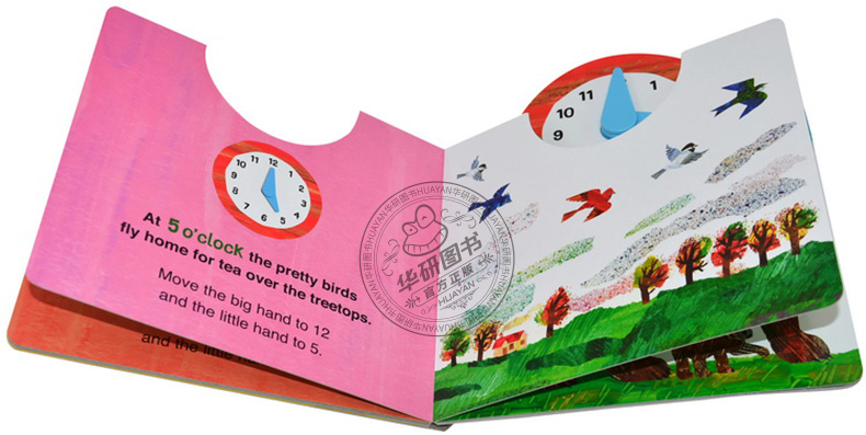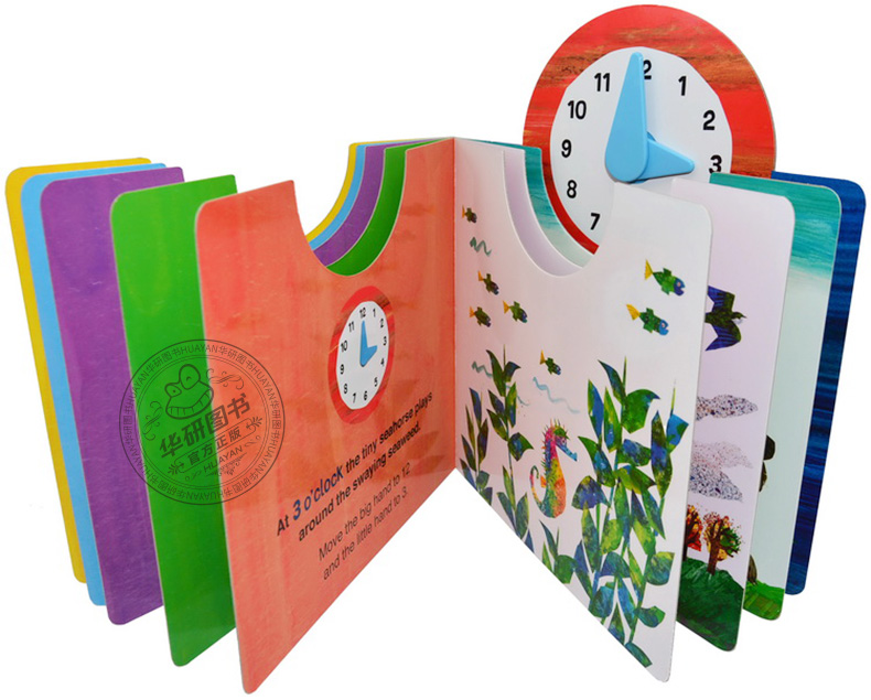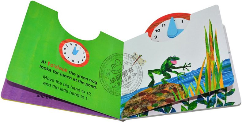 The World of Eric Carle: Whats the Time?艾瑞卡尔时钟书,利用小朋友喜爱的动物、熟悉的日常作息(从起床、吃早餐、睡觉),介绍时间的概念,并学着看时钟。长短针指示清楚,小朋友把长针拨到12,短针拨到1,就是1点啰!这是青蛙吃午餐的时间,那么你的呢?