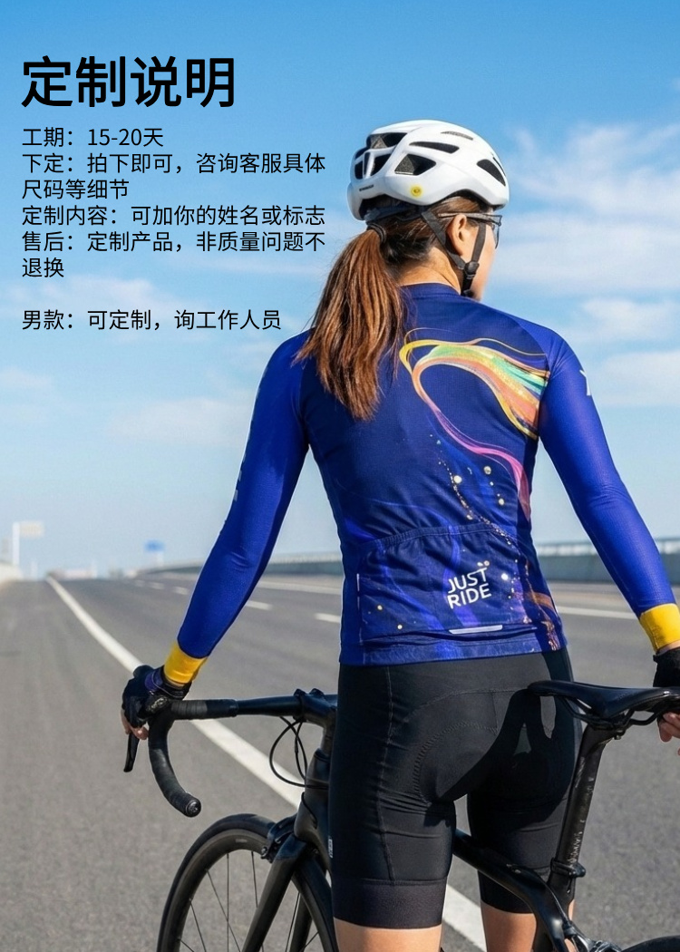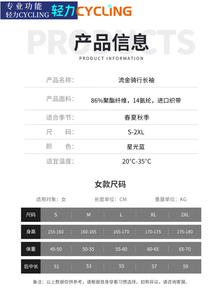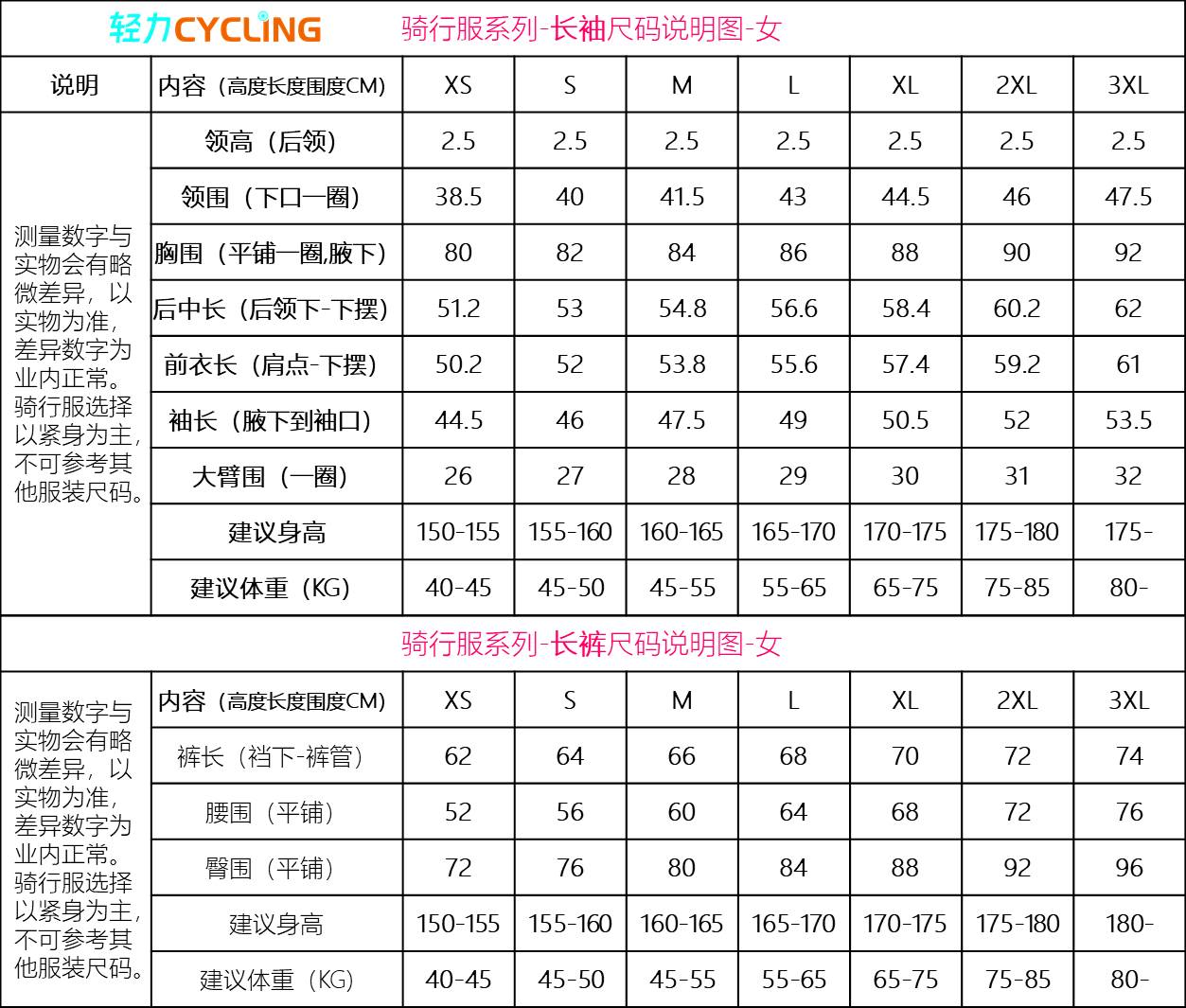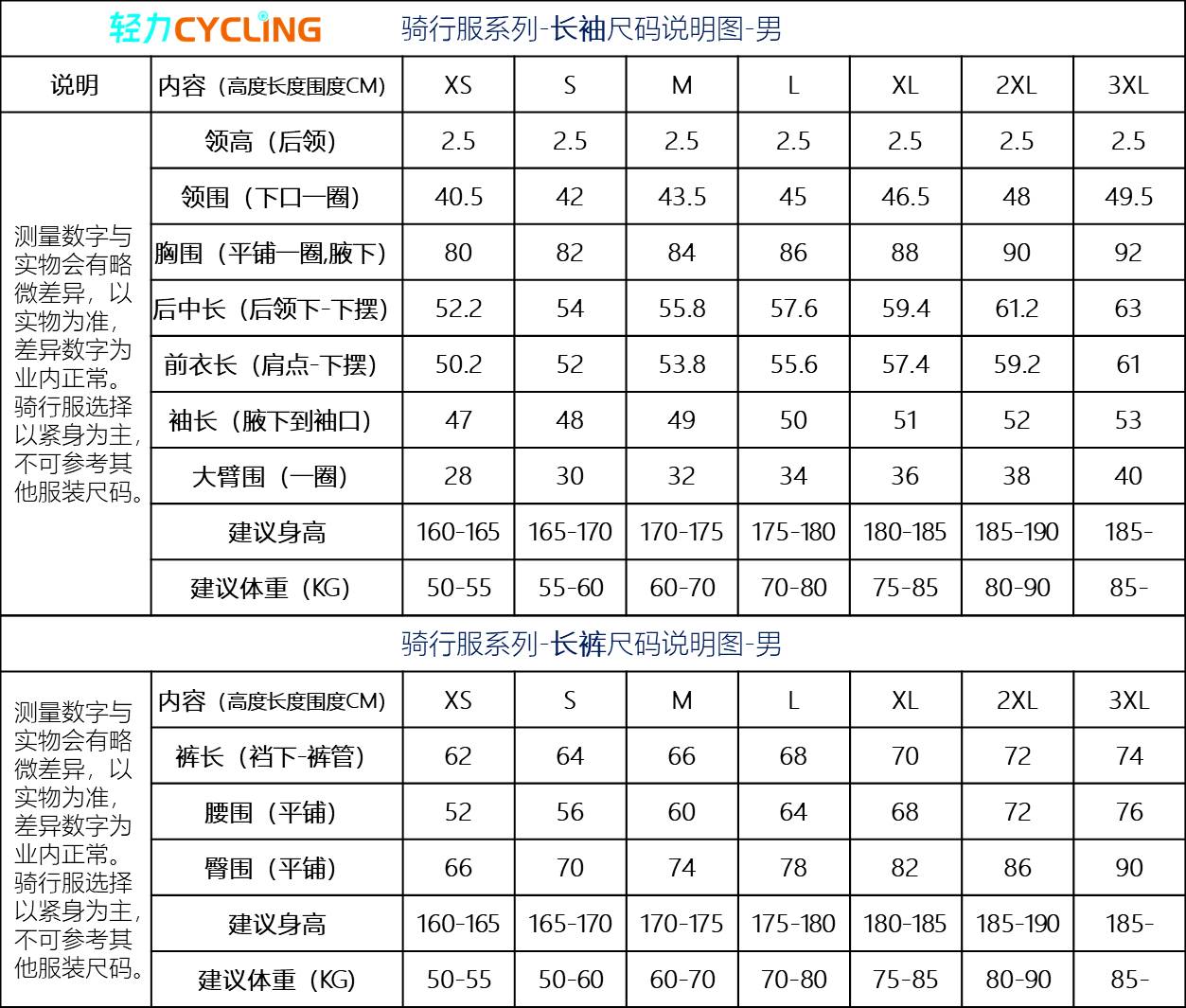 尺码表:如图,骑行服尺码须比正常服饰小1-2码;不清楚如何选尺码,务必报身高、胸围、腰围、体重等。