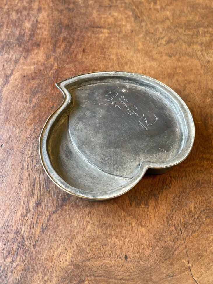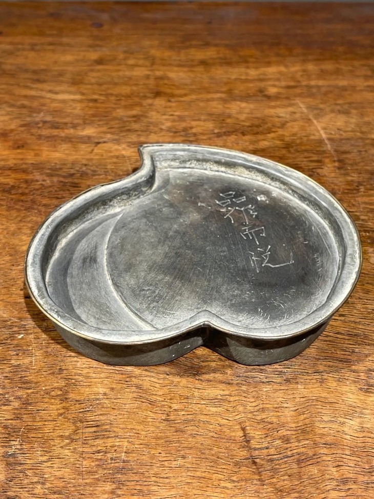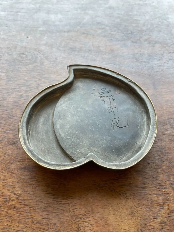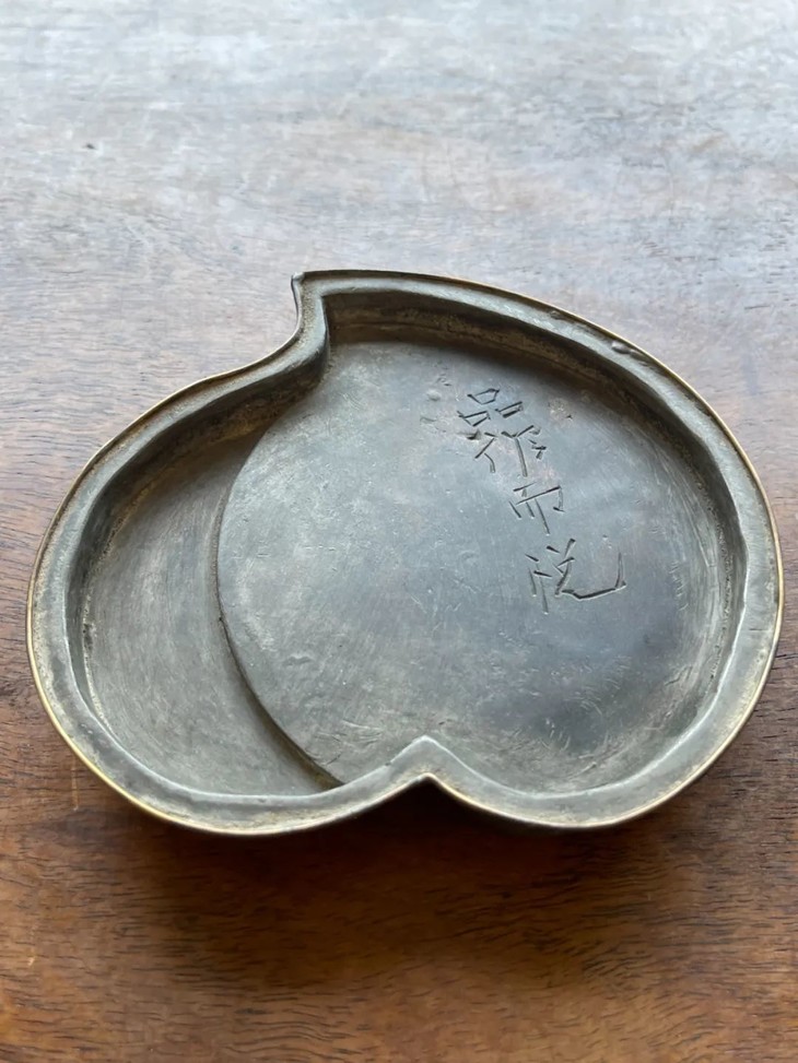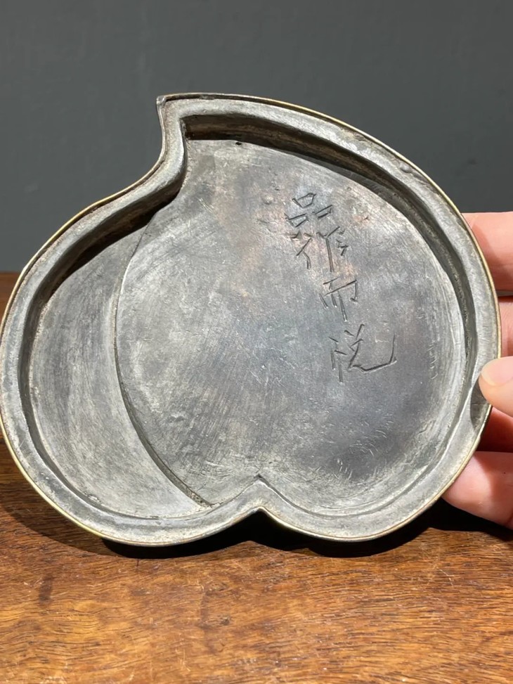 这是一只造型高雅大气,作工严谨细致的镶铜边锡质桃型笔舔洗,寿桃型浅盘分隔水盂及笔舔,边沿起线镶黄铜,细腻的成型与表面处理工艺,精良的早期锡镶黄铜工艺具画龙点晴效果,精致优美器型,整体设计独具一格,线条比例恰到好处、所有细节面面俱到、一丝不苟,内底刻楷书“品作而悦”,意思是说欣赏作品而愉悦,底部工坊章款““三合店記”。是难得一见之优雅民初文人书房用具。