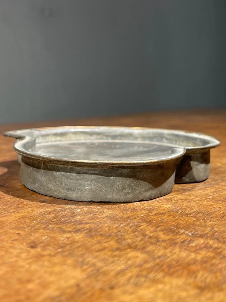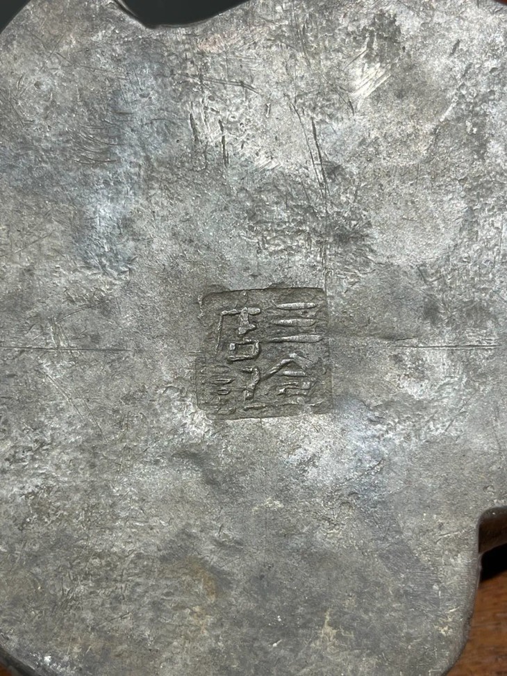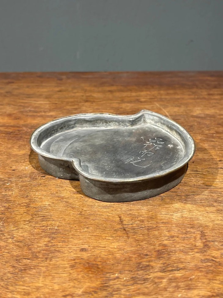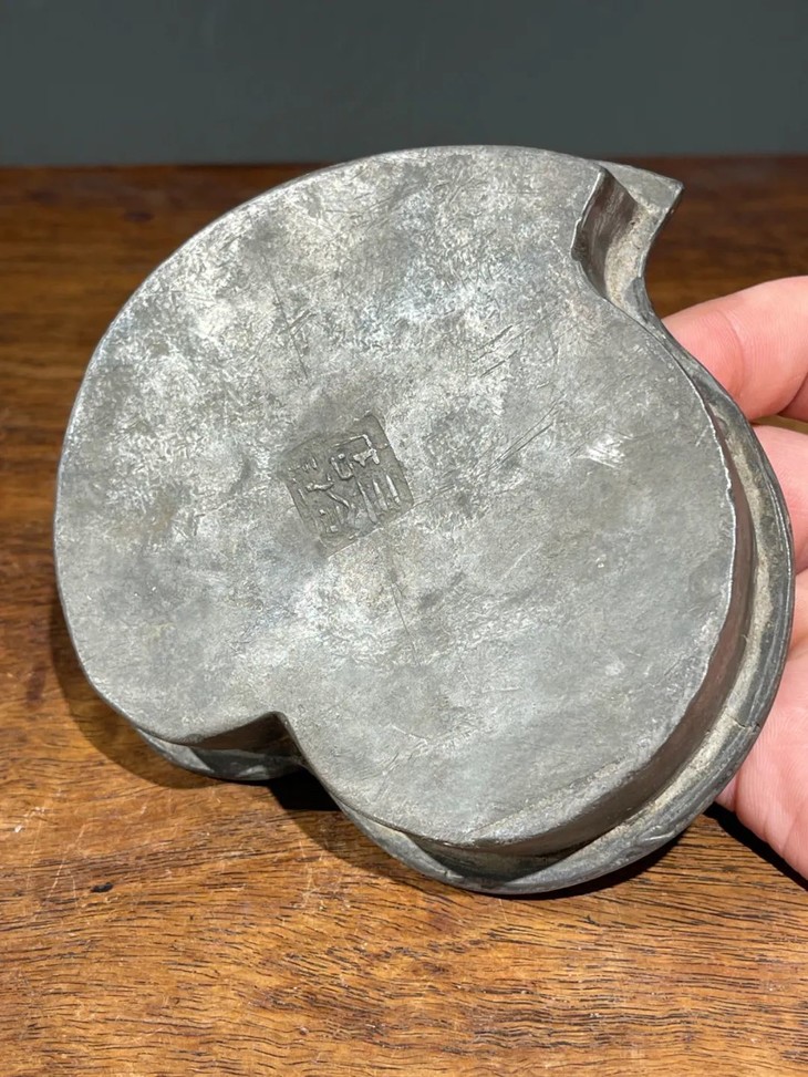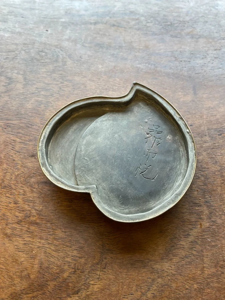 这是一只造型高雅大气,作工严谨细致的镶铜边锡质桃型笔舔洗,寿桃型浅盘分隔水盂及笔舔,边沿起线镶黄铜,细腻的成型与表面处理工艺,精良的早期锡镶黄铜工艺具画龙点晴效果,精致优美器型,整体设计独具一格,线条比例恰到好处、所有细节面面俱到、一丝不苟,内底刻楷书“品作而悦”,意思是说欣赏作品而愉悦,底部工坊章款““三合店記”。是难得一见之优雅民初文人书房用具。