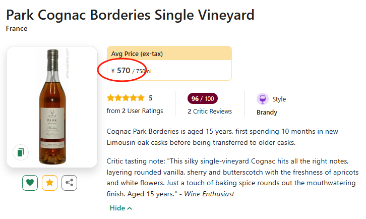 派克干邑:干邑百年酒厂旗下主打品牌,高分金奖无数;