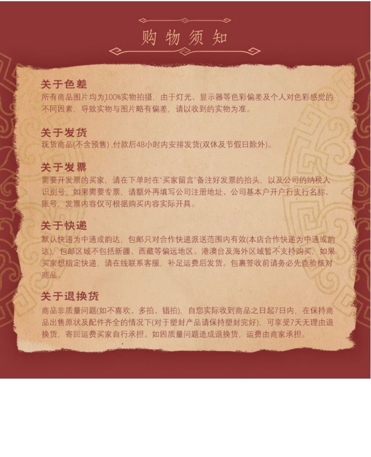 (2)运费说明:购买文化产品25元以上包邮(甘肃、新疆、内蒙古、青海、西藏、海南除外),25元以下产品统一采用中通或韵达快递全国统一标准收费,如您有任何疑问,欢迎咨询我们!