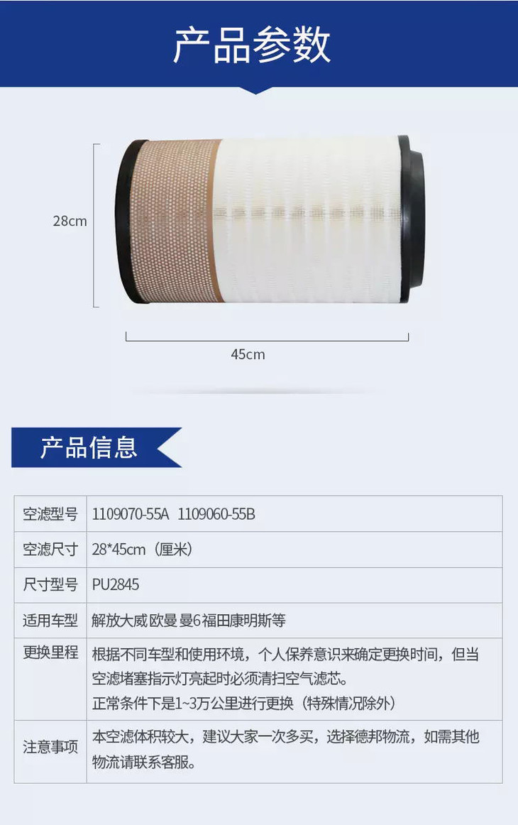 亿利芯动力PU2845 适用解放大威/欧曼国三等车型 1-3万公里空滤 卡车之家