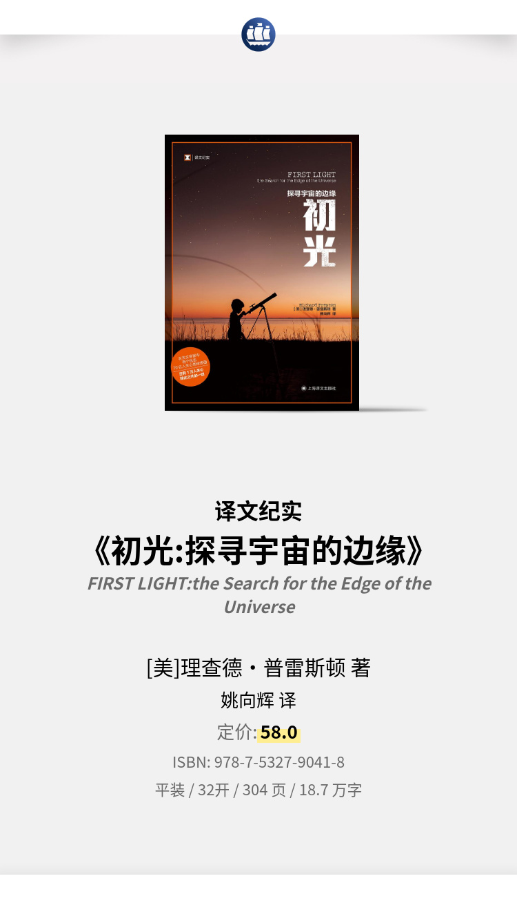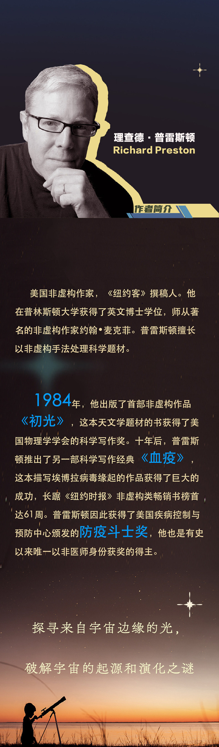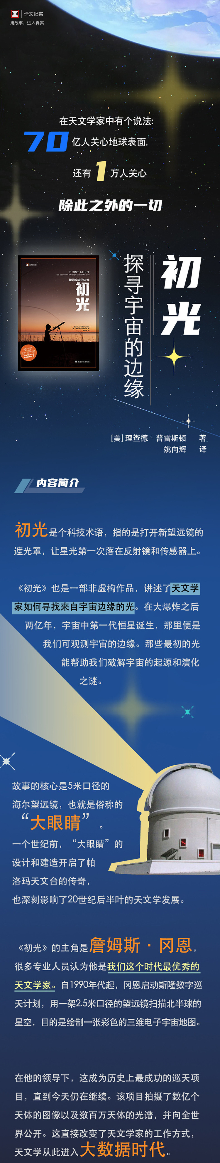 《初光》也是一部非虚构作品,讲述了天文学家如何寻找来自宇宙边缘的光。在大爆炸之后两亿年,宇宙中第一代恒星诞生,那里便是我们可观测宇宙的边缘。那些最初的光能帮助我们破解宇宙的起源和演化之谜。