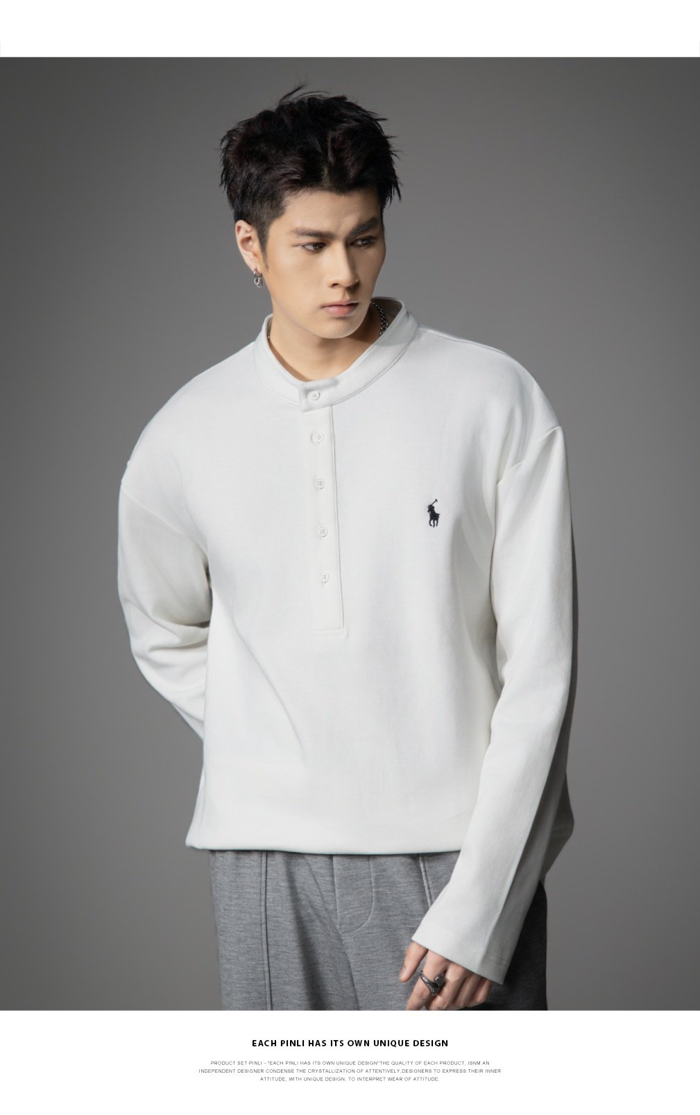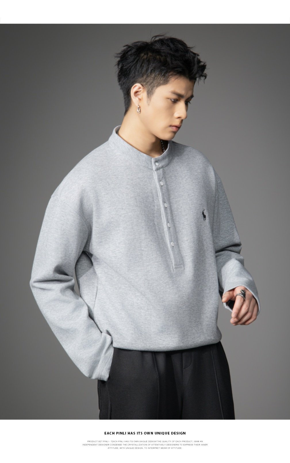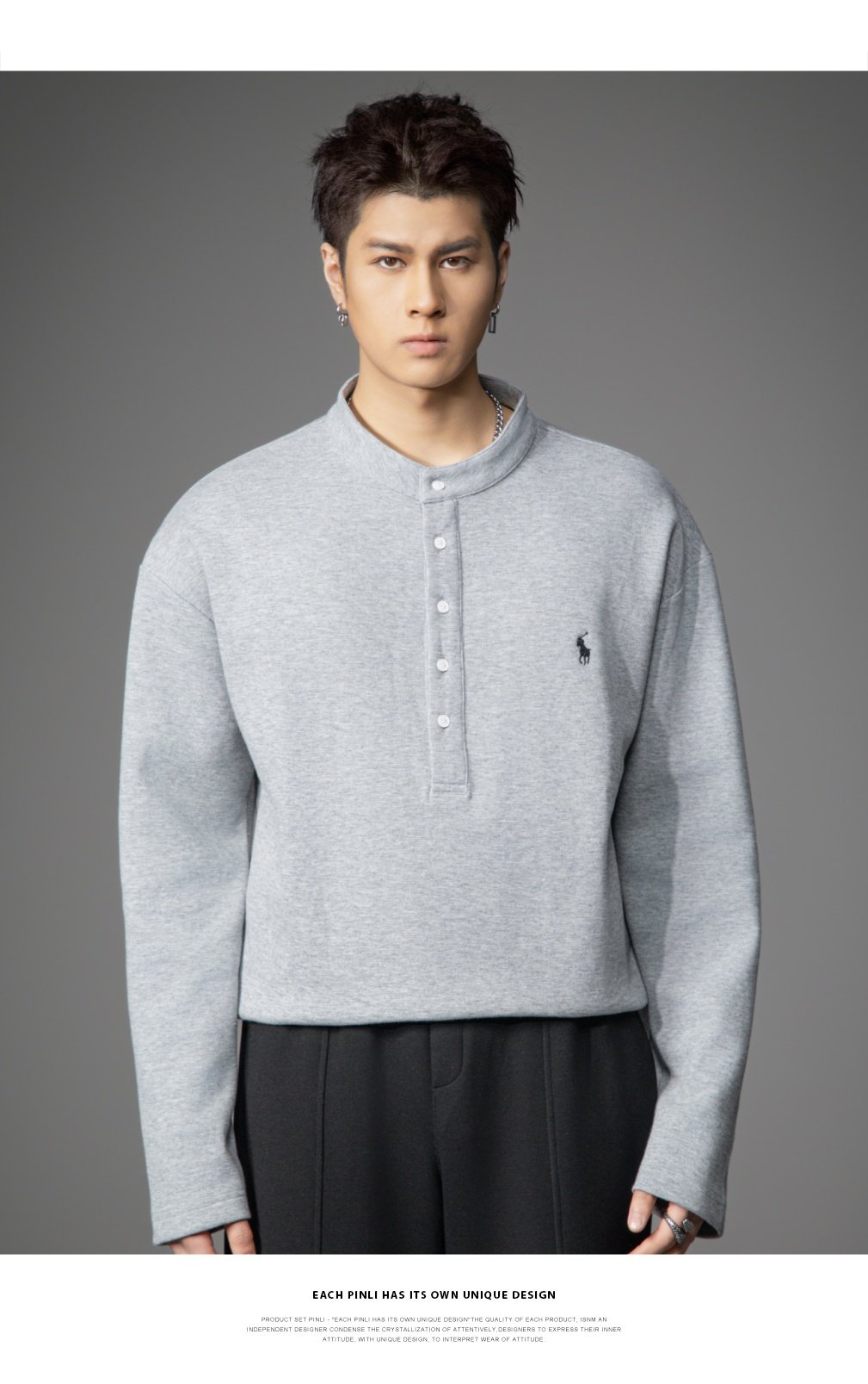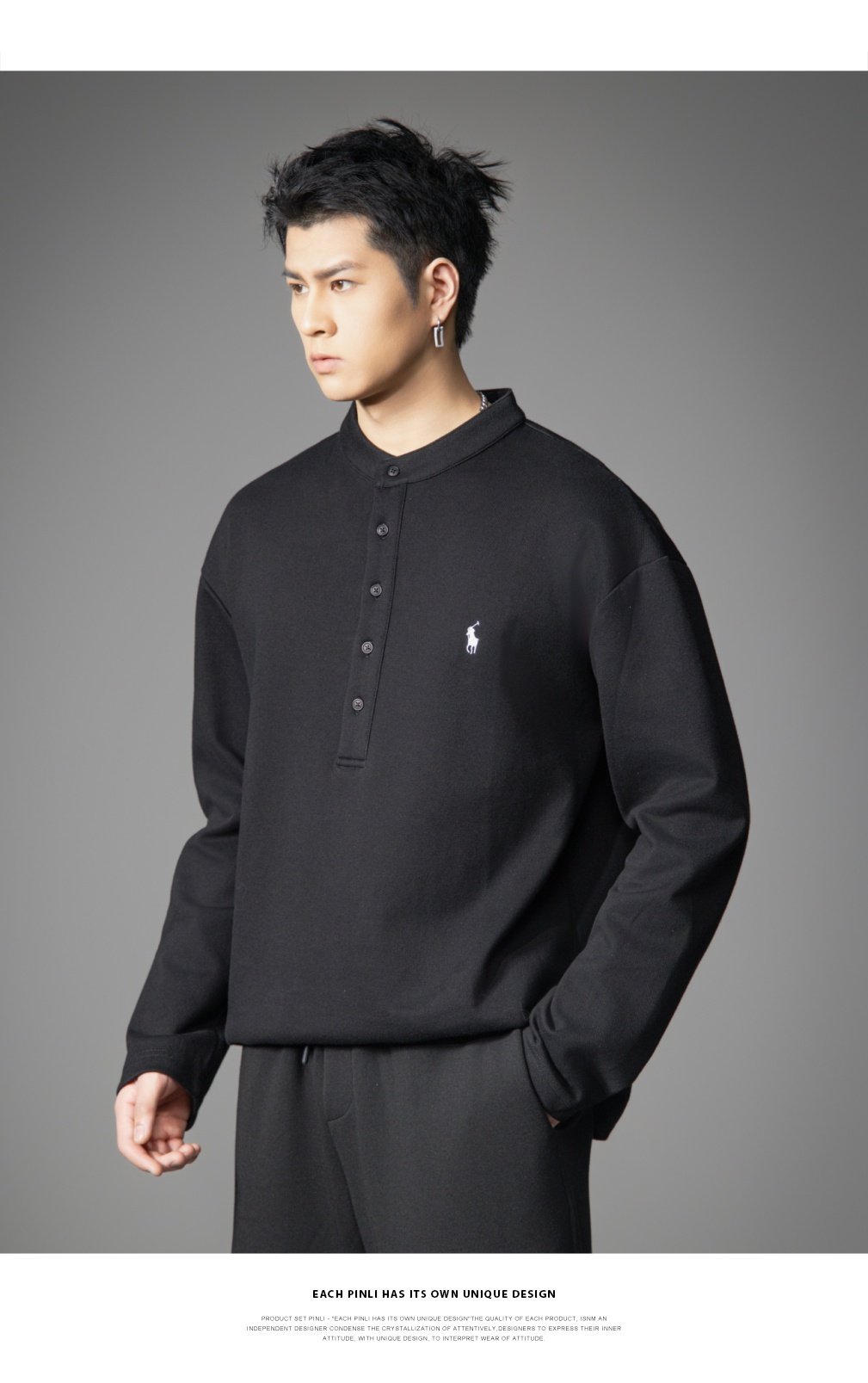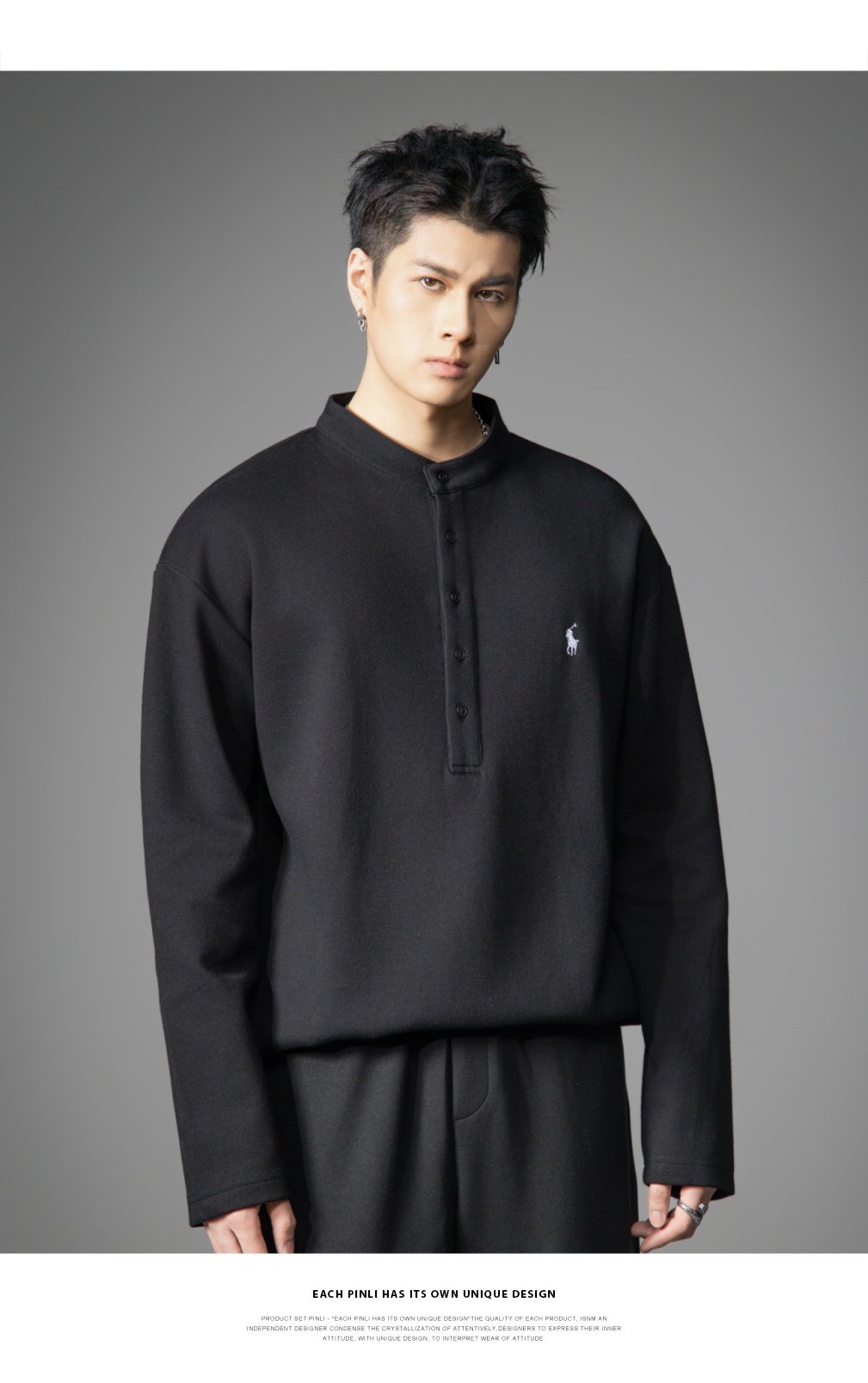 PINLI品立2026春季新款青年男士宽松立领落肩长袖T恤打底上衣潮牌GD262111006