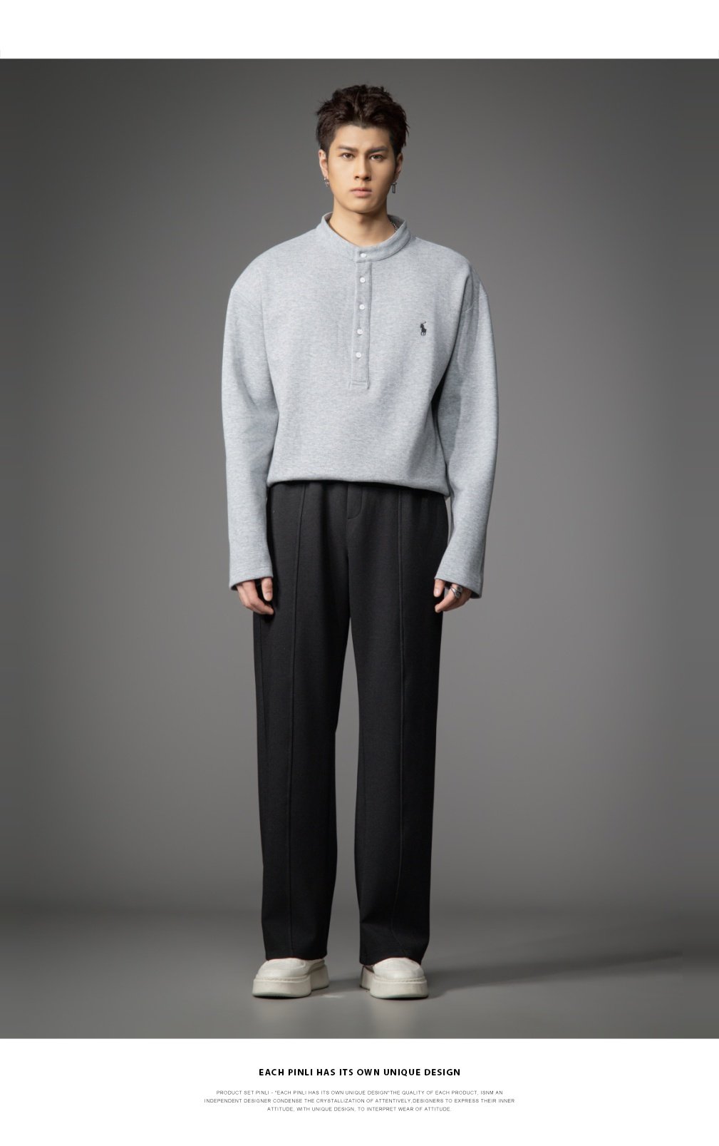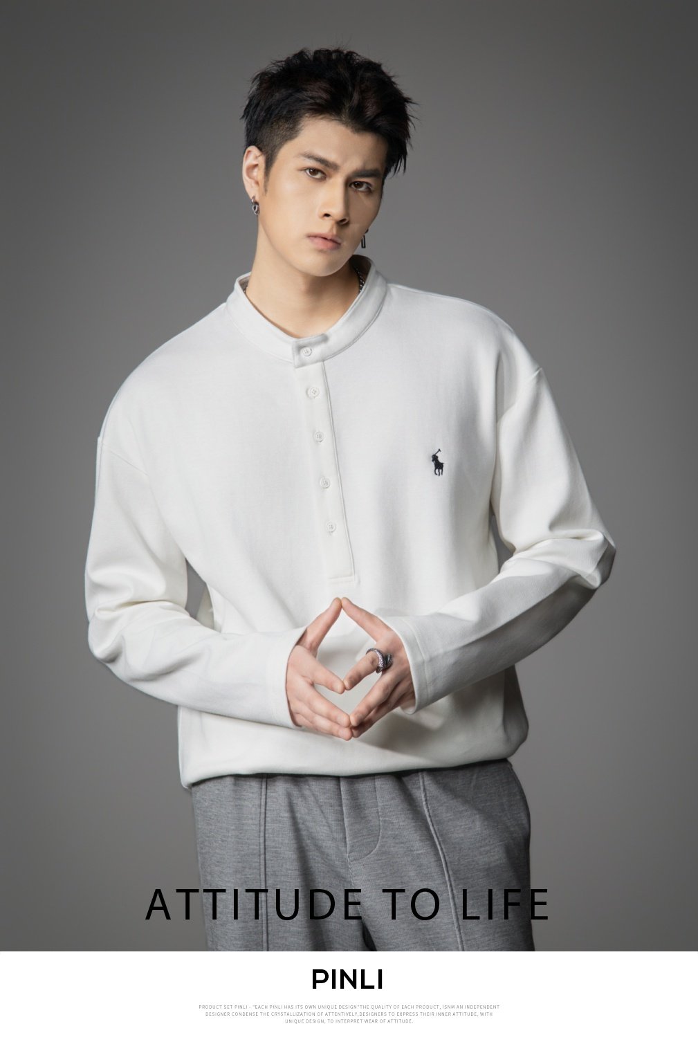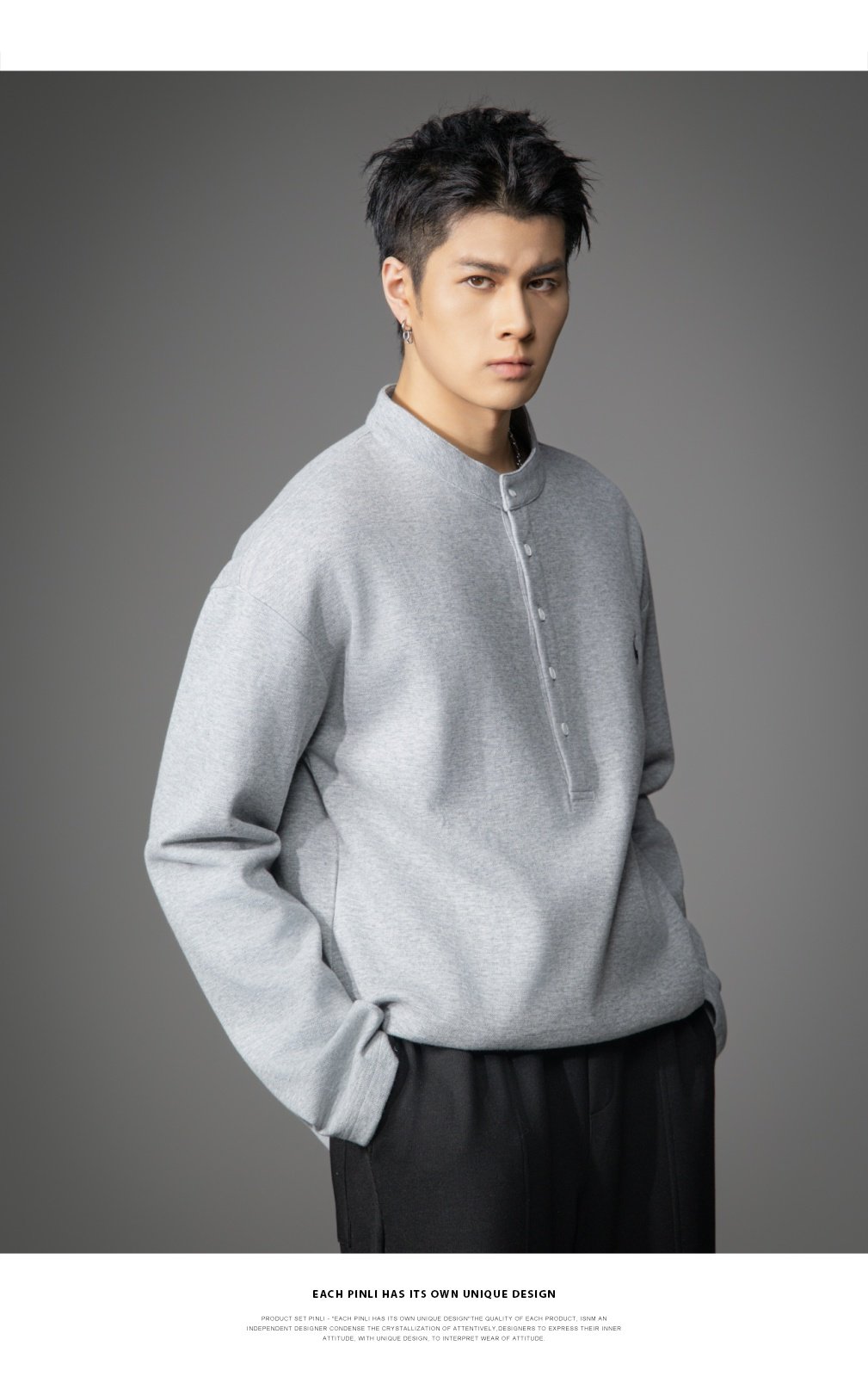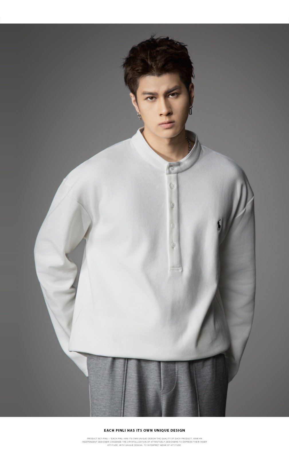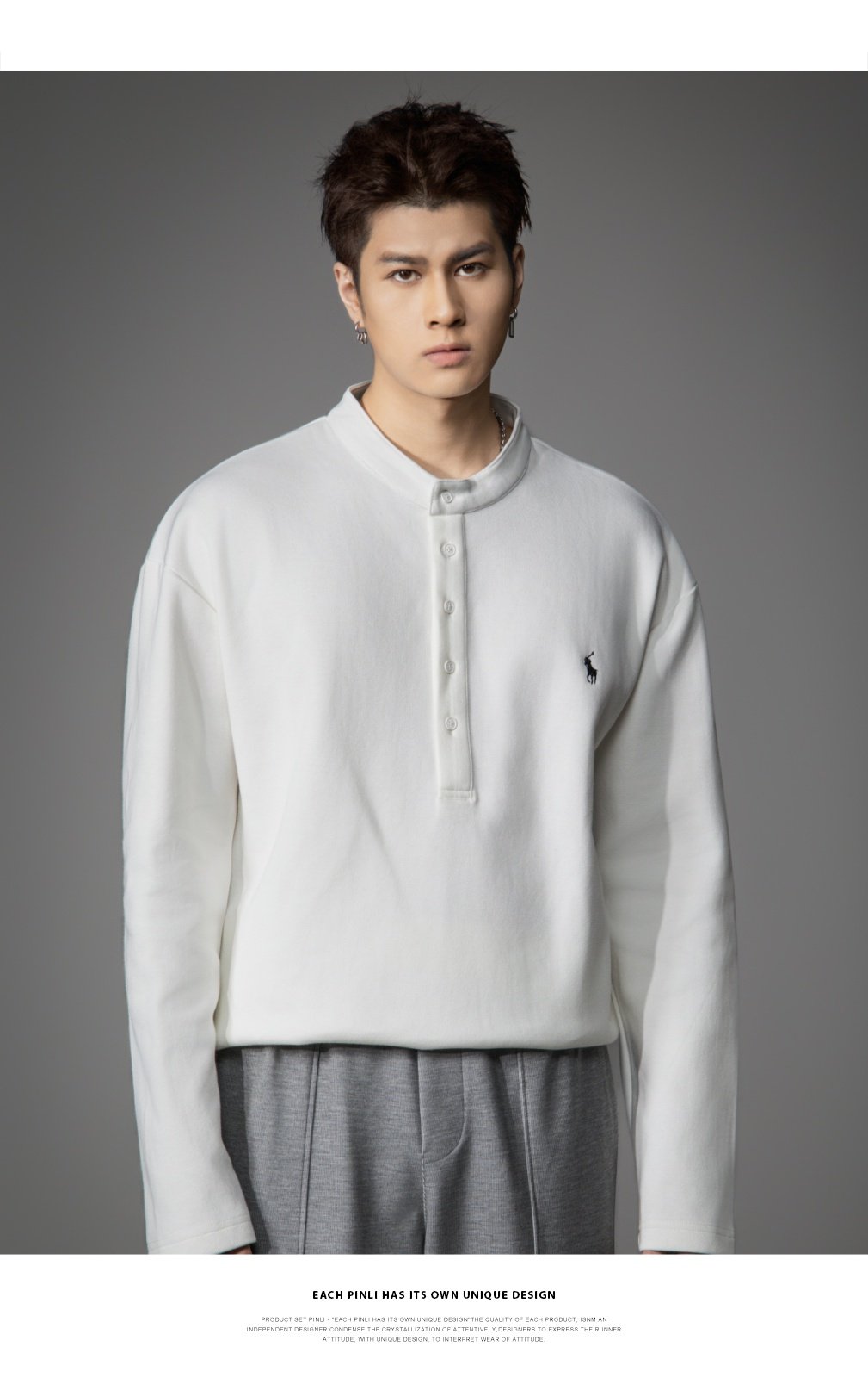 PINLI品立2026春季新款青年男士宽松立领落肩长袖T恤打底上衣潮牌GD262111006