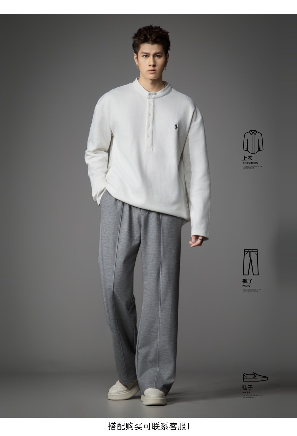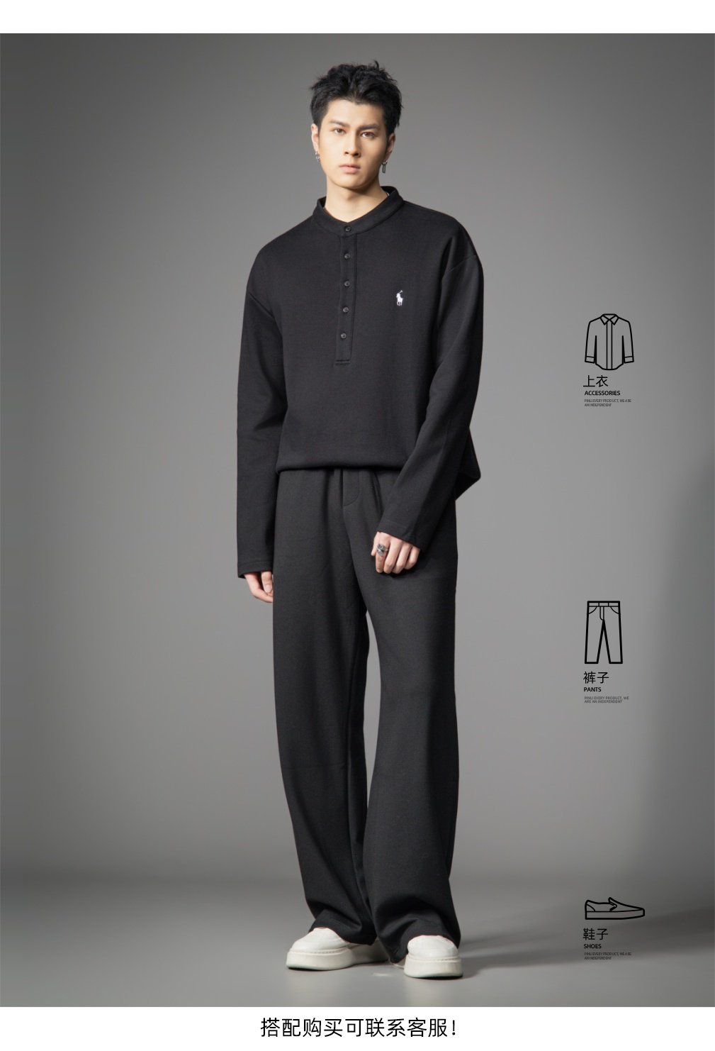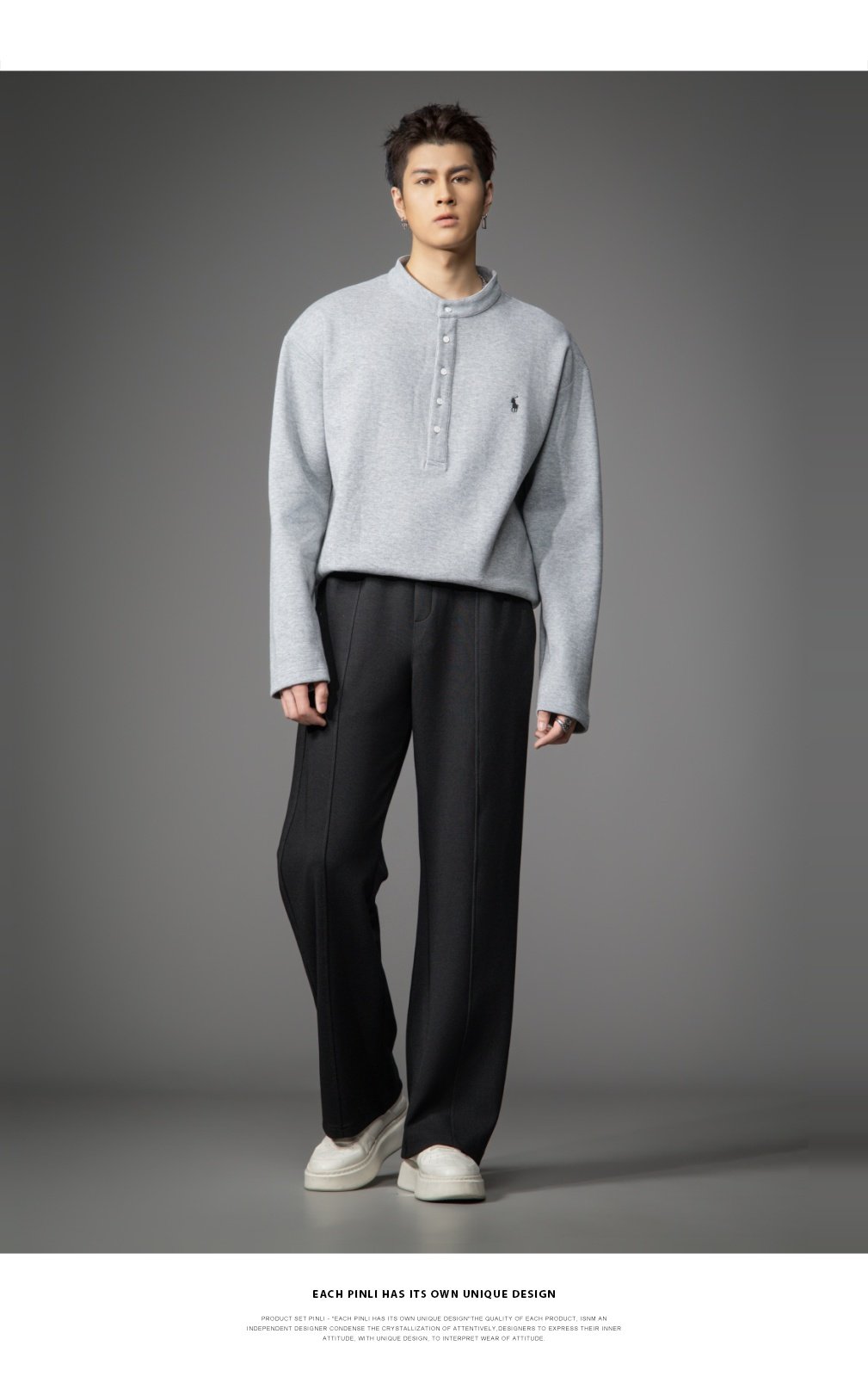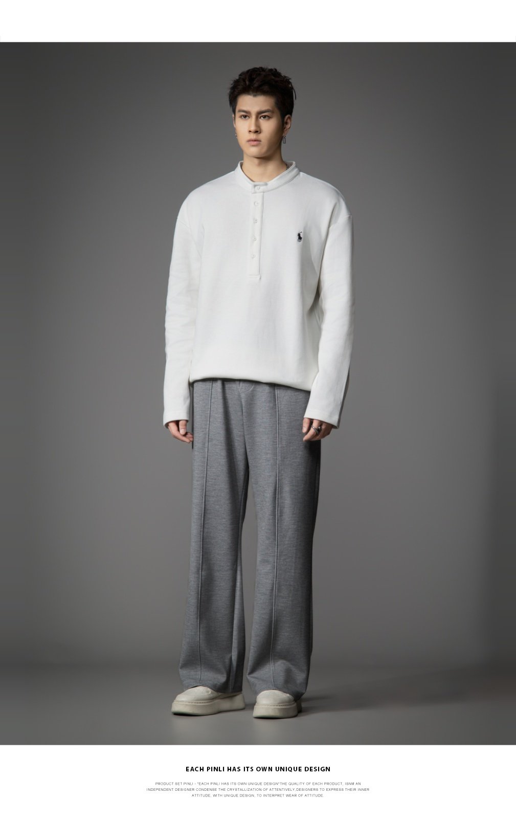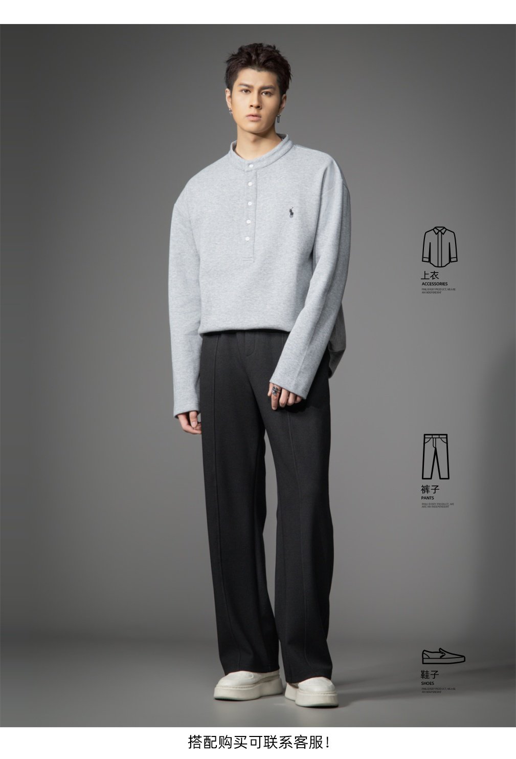 PINLI品立2026春季新款青年男士宽松立领落肩长袖T恤打底上衣潮牌GD262111006