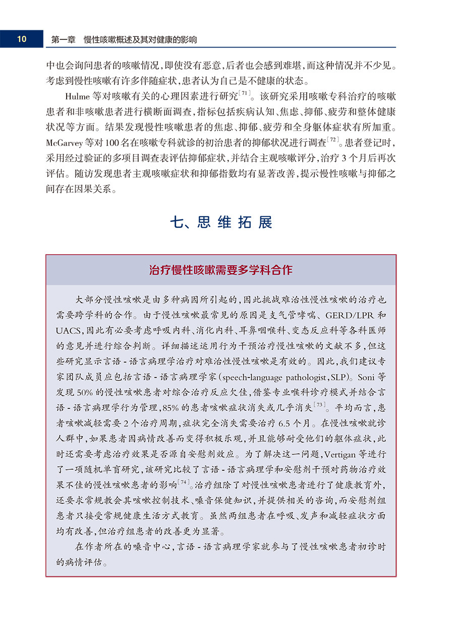 本书共有10章,第1章讲述慢性咳嗽综述及对健康的影响,第2章讲述咳嗽变异性哮喘及相关疾病,第3章讲述鼻部疾病以及过敏作为慢性咳嗽的病因,第4章讲述反流性疾病,第5章阐述咽喉反流性疾病的医学基础,第6章讲述神经性咳嗽,第7章讲述吞咽障碍与慢性咳嗽,第8章讲述咳嗽的管理-以言语及语言病理师为例,第9章难治性咳嗽的治疗案例,第10章展望慢性咳嗽未来的发展方向。本书不仅专业性强,而且融合了国际zuixin的研究进展及大量有效内容,将向临床一线医生提供有用的信息。
