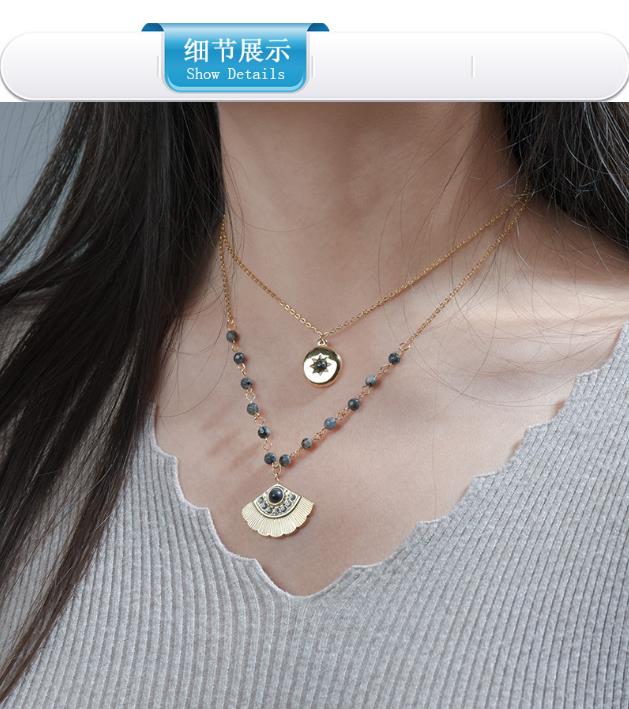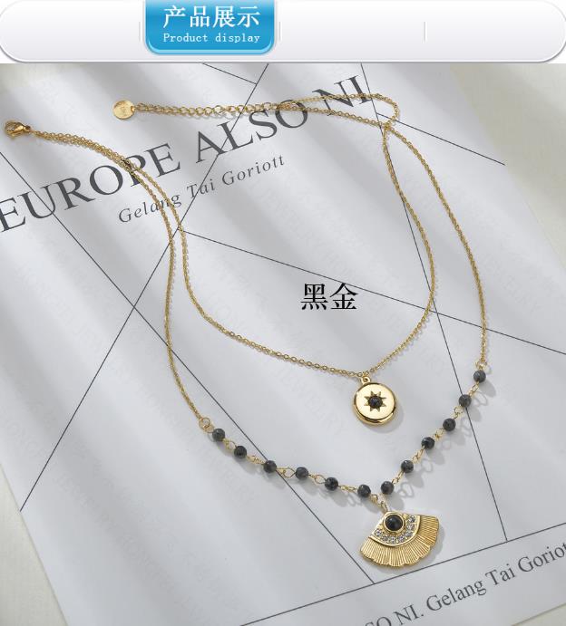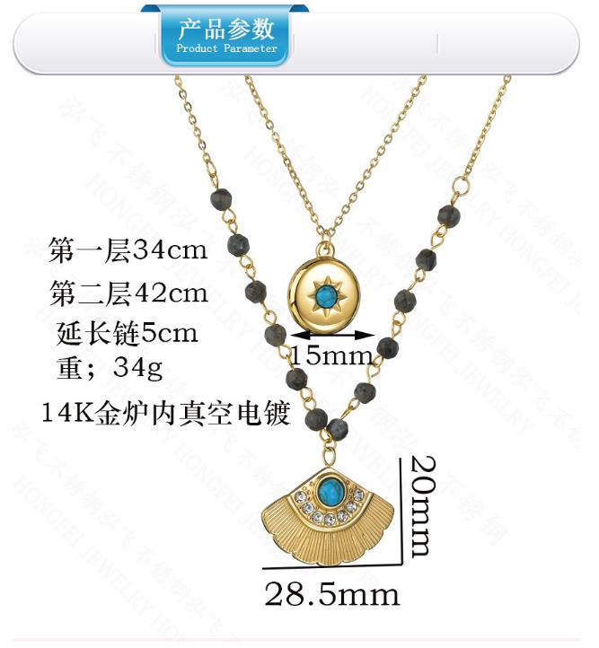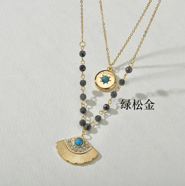 【项链】*双层绿松石镶钻扇形银杏叶项链 钛钢圆牌八芒星太阳项链