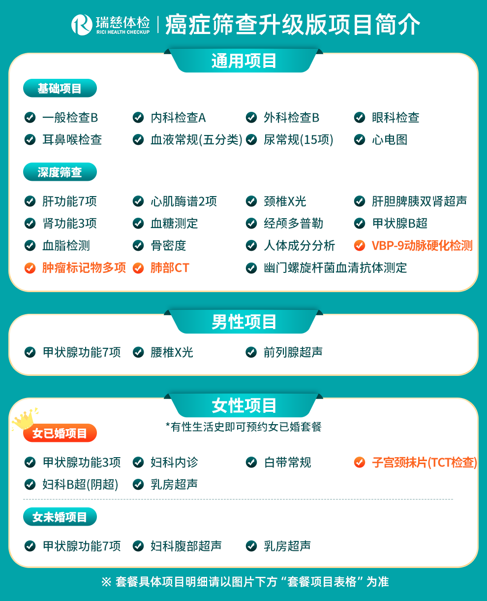 | 套餐名称:癌症筛查体检套餐升级版 | |||||