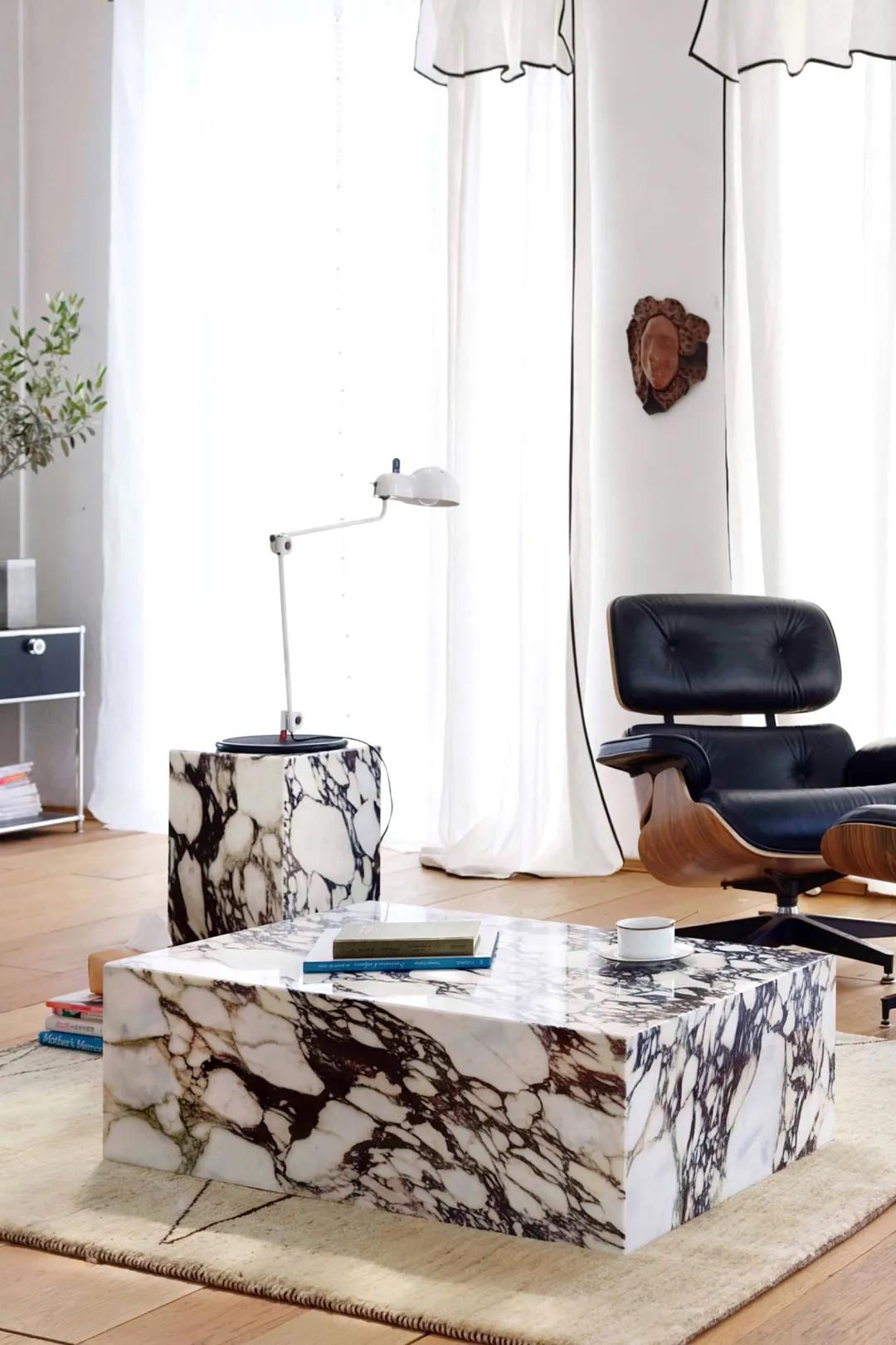 另一种是在出厂前,是使用树脂把大理石表面封起来。我们的两款大理石郁金香桌,出厂前都是没做处理的。我们不太喜欢很多品牌用的树脂大理石涂层,那样虽然能保护桌面,但会让桌面触感失去大理石应有的质感,很像塑料。而且,其实树脂涂层的耐久度也不好。这次的两款卡拉卡塔紫大理石茶几,也没做处理。