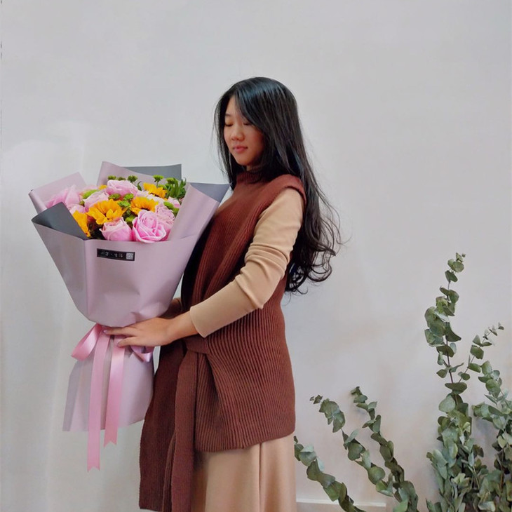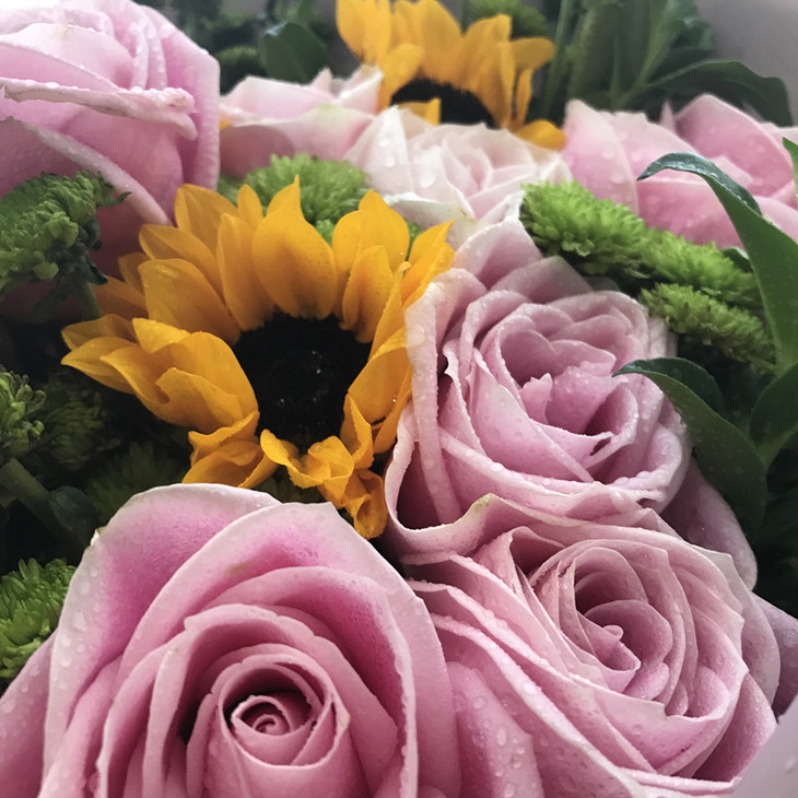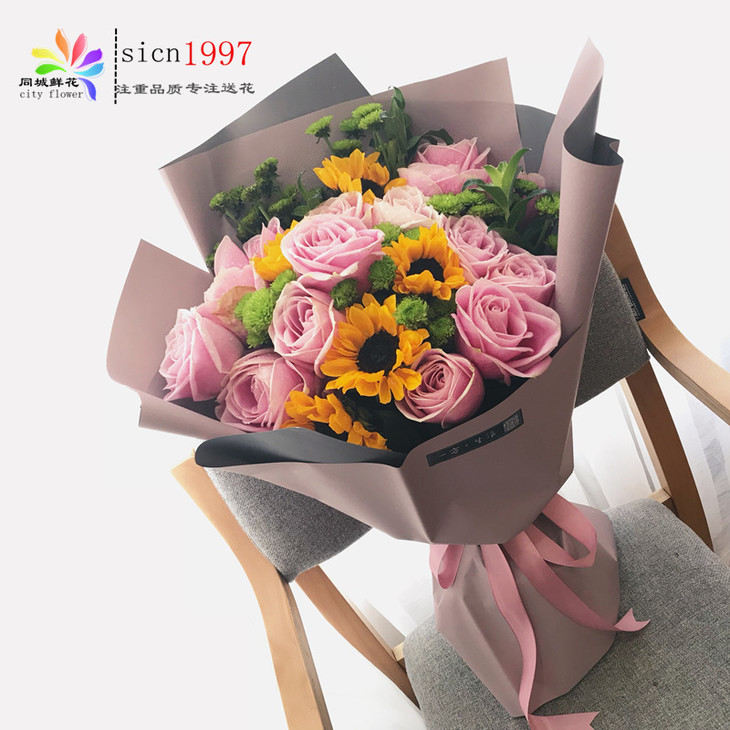 花材说明:15支粉佳人玫瑰 5支向日葵 绿菊搭配