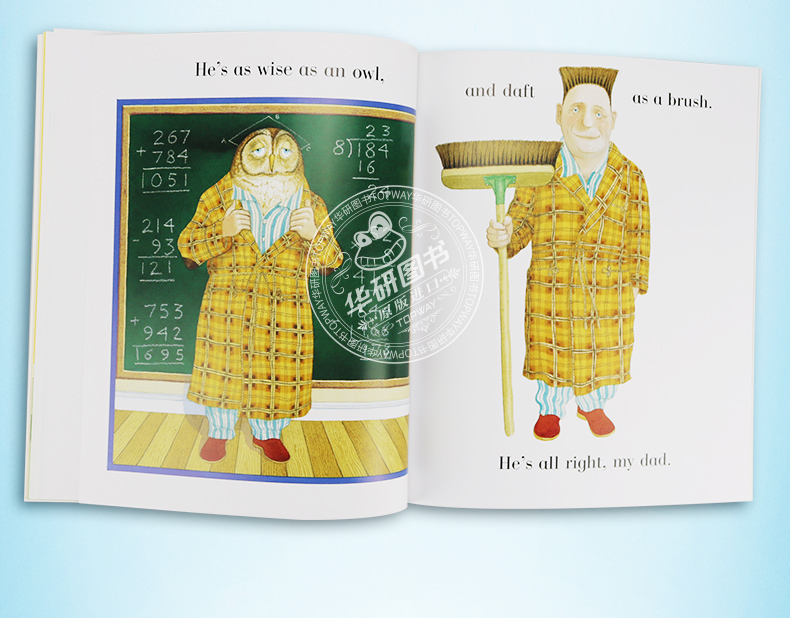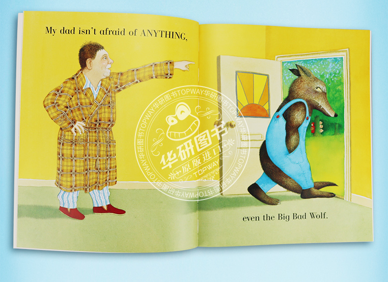 My Dad《我爸爸》可以说是作者对所有父亲的献礼,在这本幽默的图画书里,透过孩子夸张的幻想,塑造了一个让人笑破肚皮的爸爸形象:这个爸爸一天到晚穿着一件长长的睡衣,他不怕狼,一跳就可以跳过月亮,吃得像马一样多,游得像鱼一样灵活。