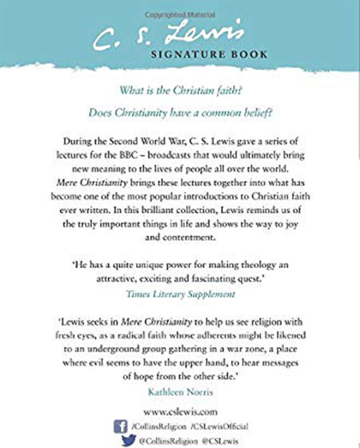 The book brings together C.S. Lewis’s legendary radio broadcasts during the war years, in which he set out simply to ‘explain and defend the belief that has been common to nearly all Christians at all times’.