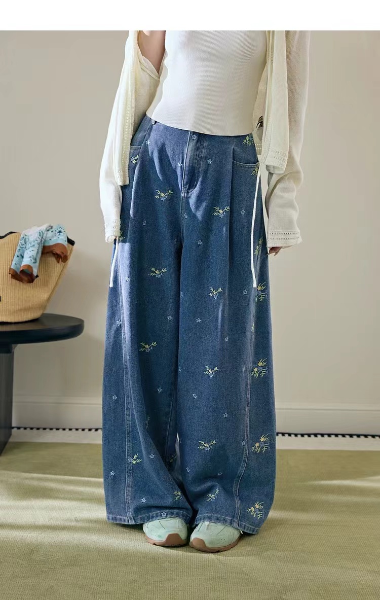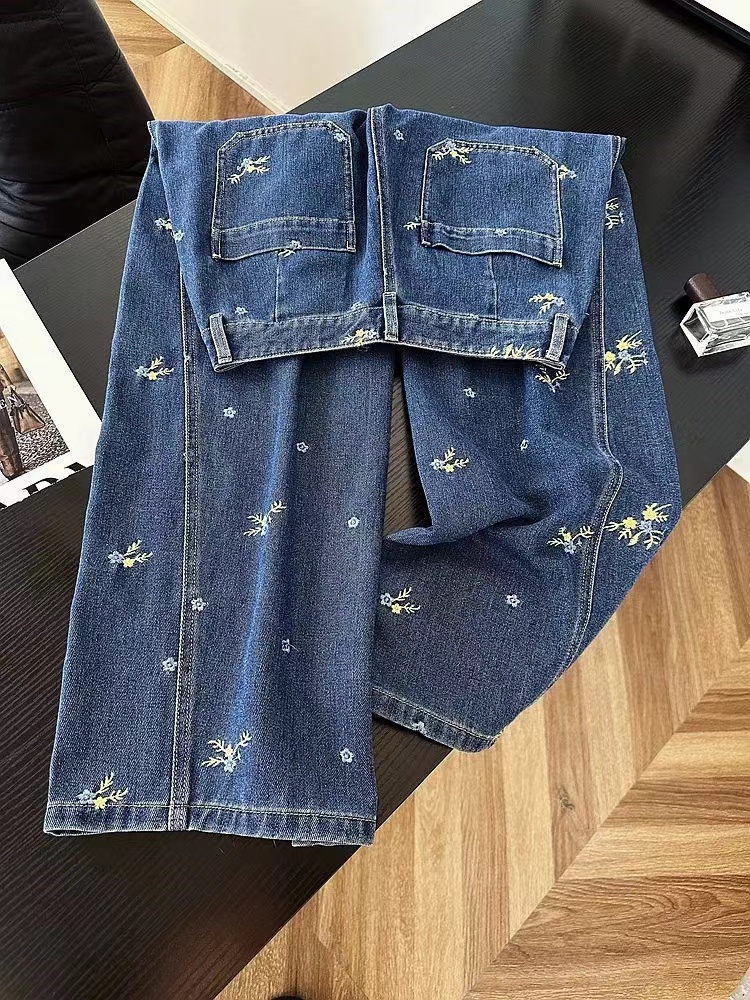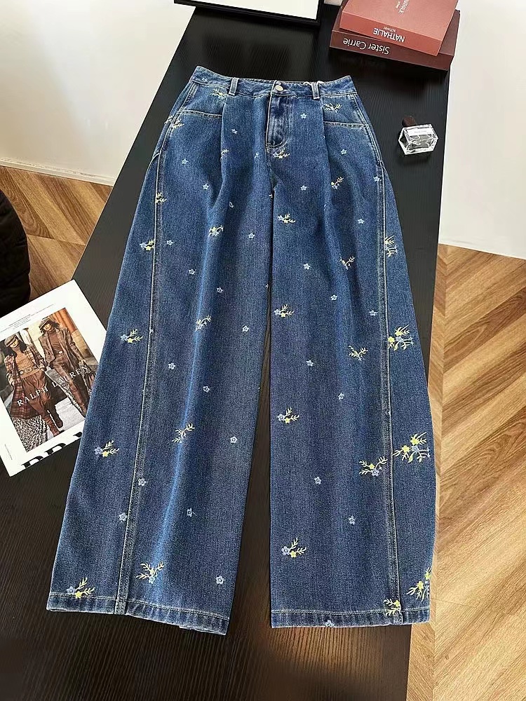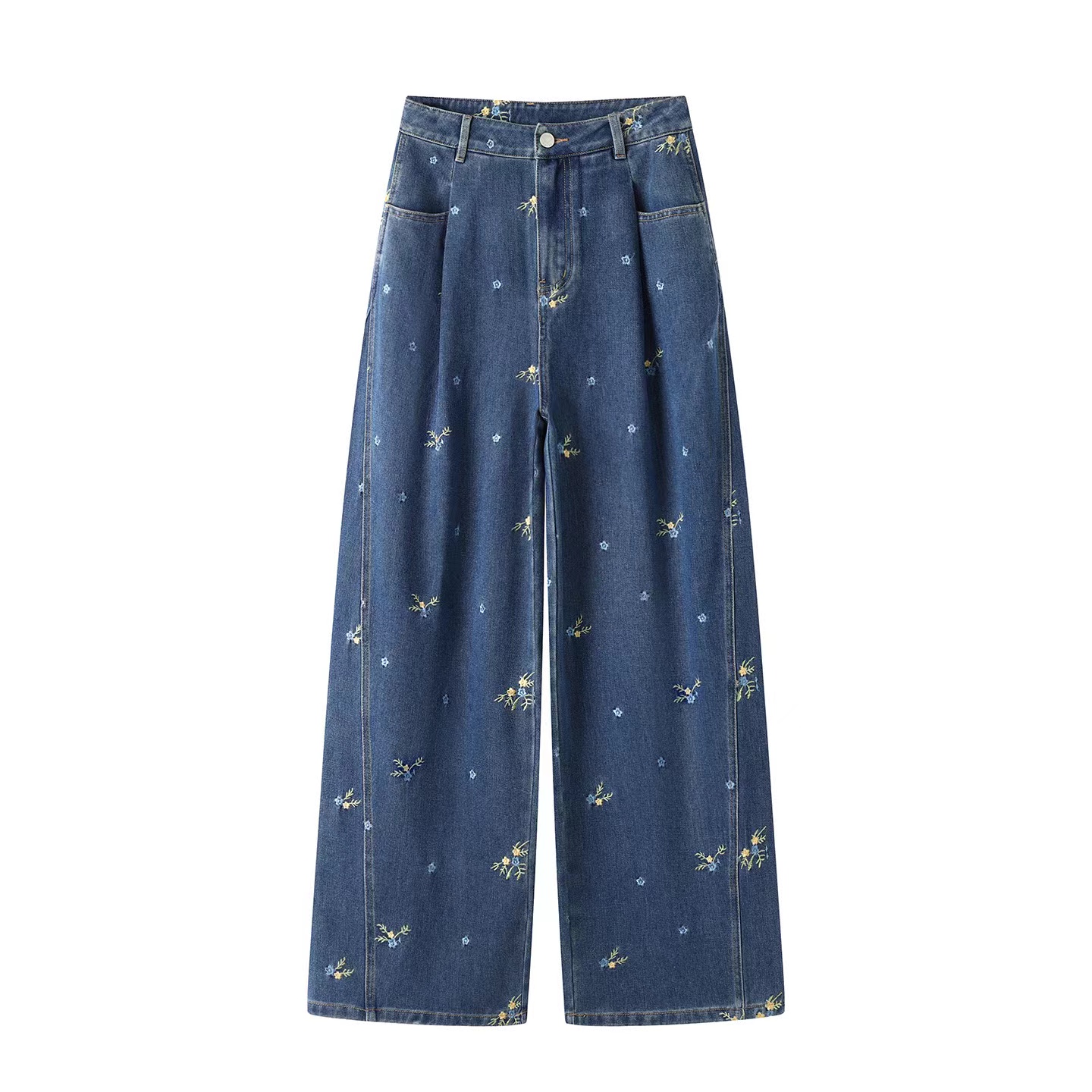 F031690蓝色刺绣碎花水洗牛仔裤子女2026春新款垂感拖地阔腿长裤