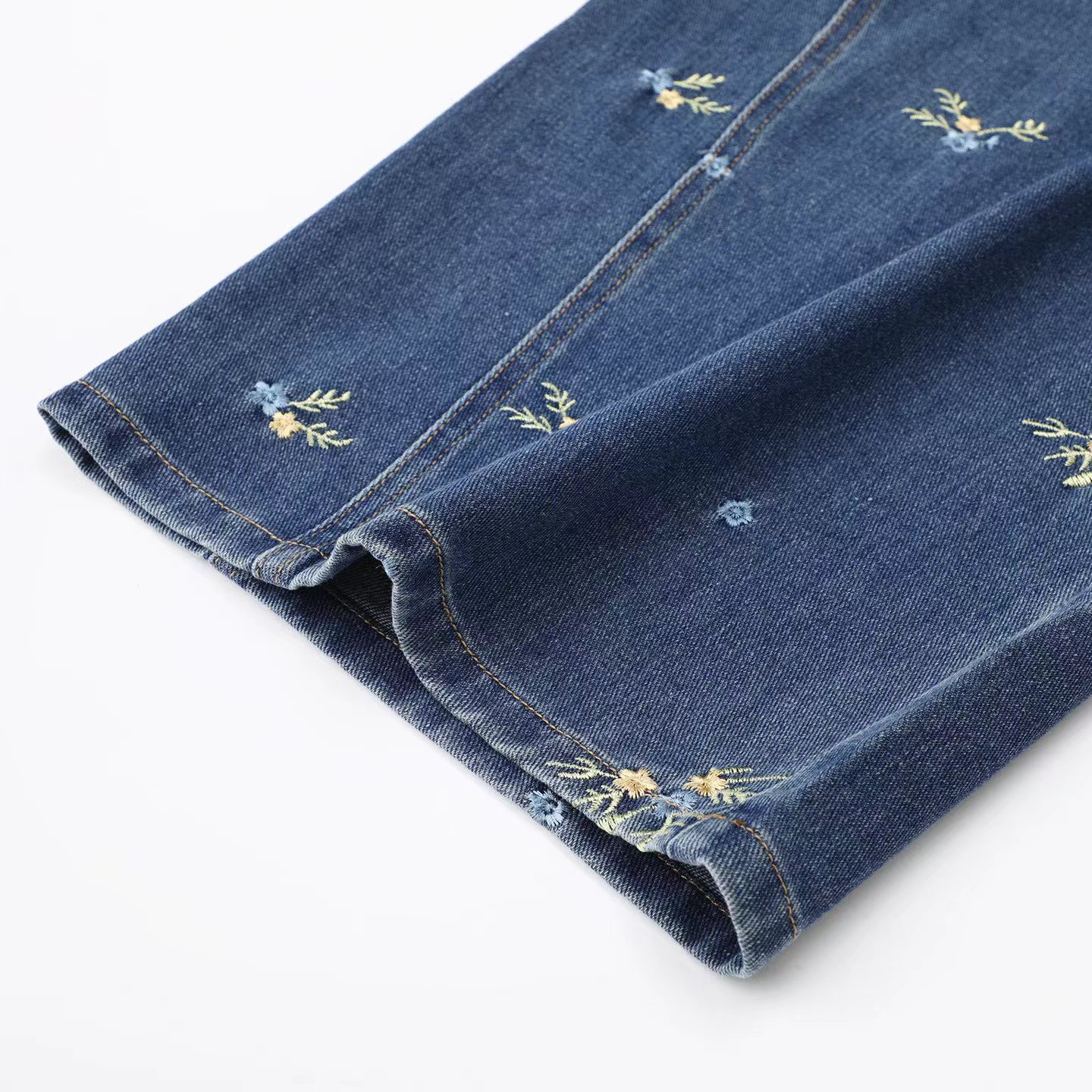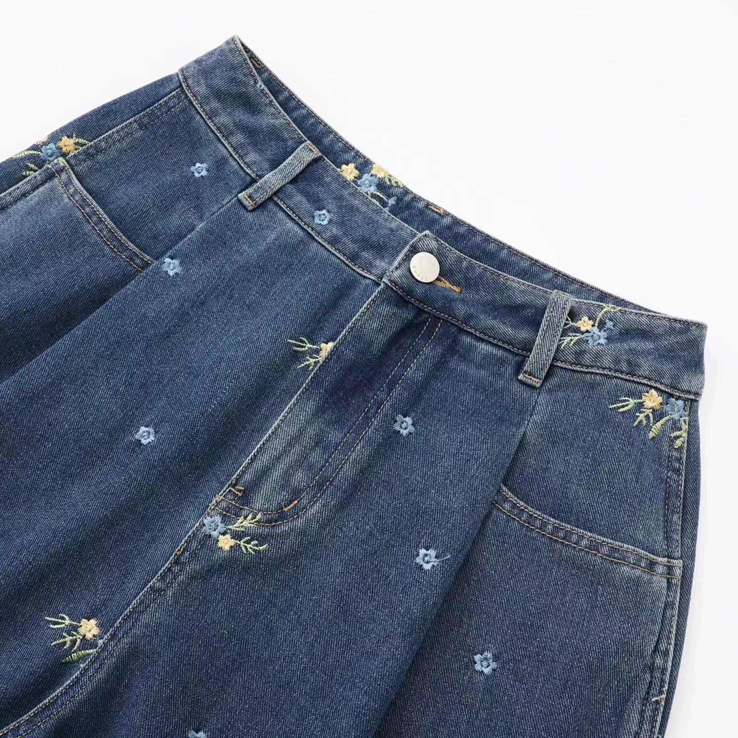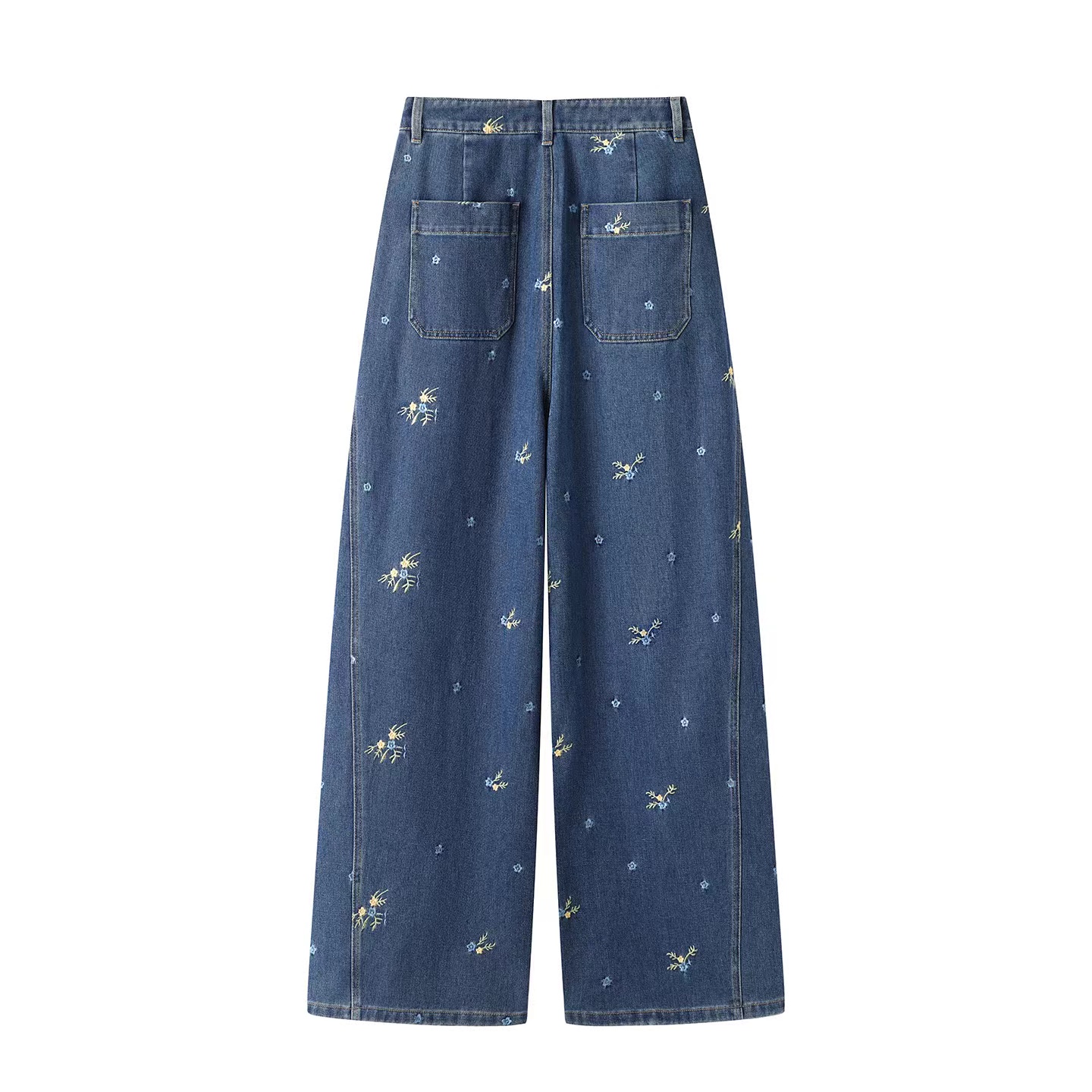 F031690蓝色刺绣碎花水洗牛仔裤子女2026春新款垂感拖地阔腿长裤