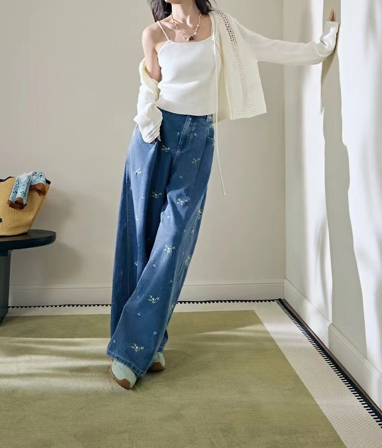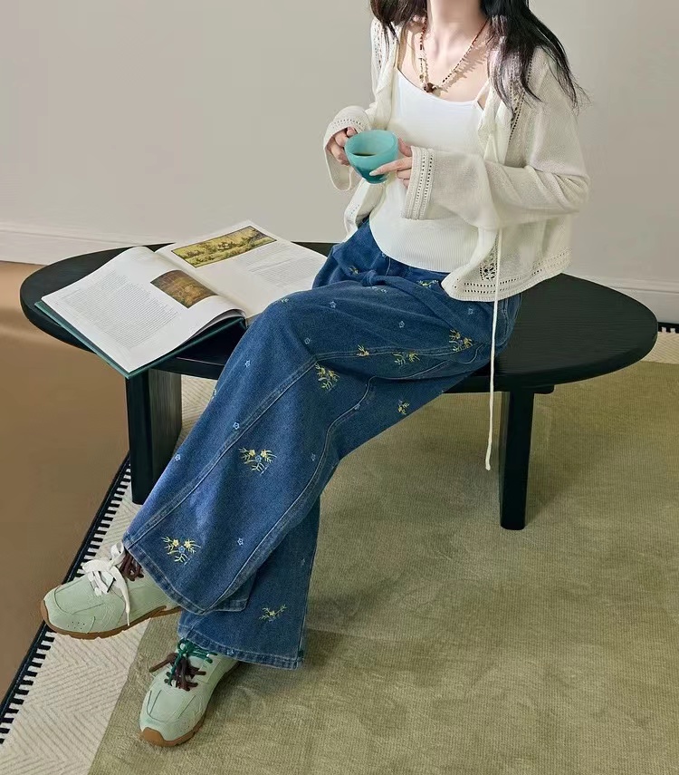 蓝色刺绣碎花水洗牛仔裤子女2026春新款垂感拖地阔腿长裤。「把春日野趣缝进裤脚」深蓝牛仔底布,像沉静的夜空 蓝黄碎花刺绣,是散落的星光与野花,阔腿剪裁裹住温柔,每一步都踩在春风里 不用刻意打扮,也能自带松弛的浪漫感,甜妹酷盖都能穿的神仙牛仔裤!满版碎花刺绣软乎乎,牛仔硬挺感又中和了甜腻,高腰+阔腿=秒变三七分身材,小个子也能轻松驾驭,搭T恤、开衫、小皮鞋都好看,春天出街回头率爆表