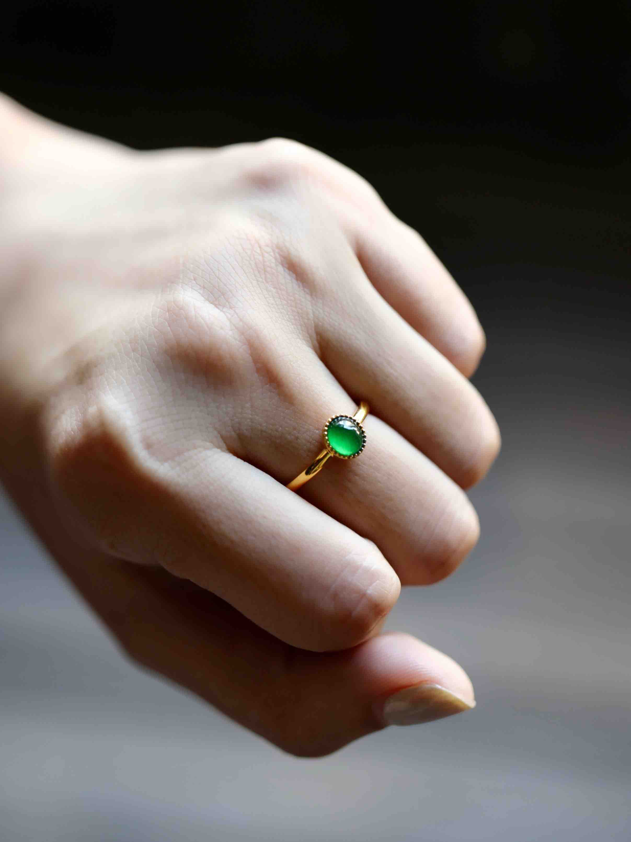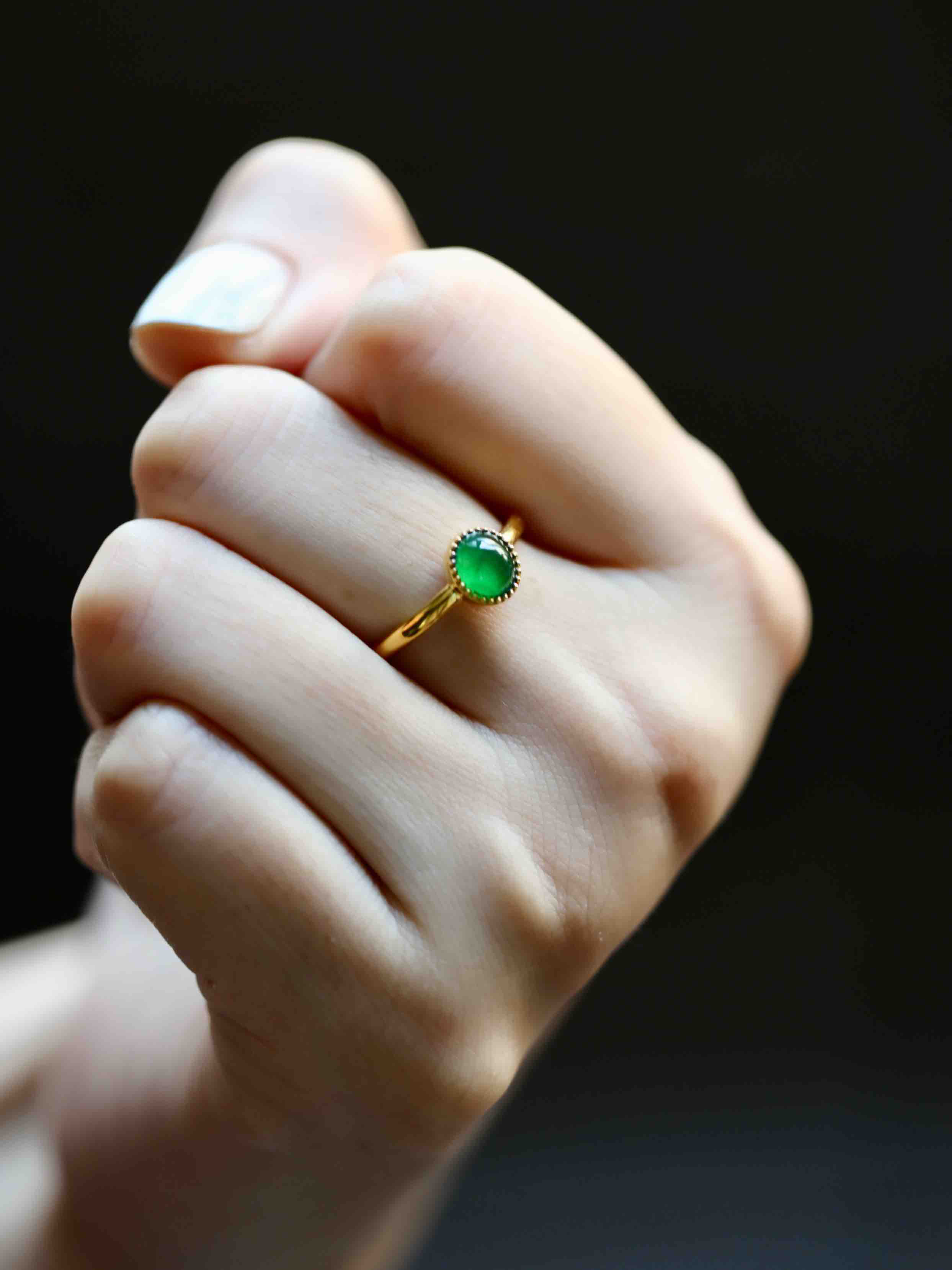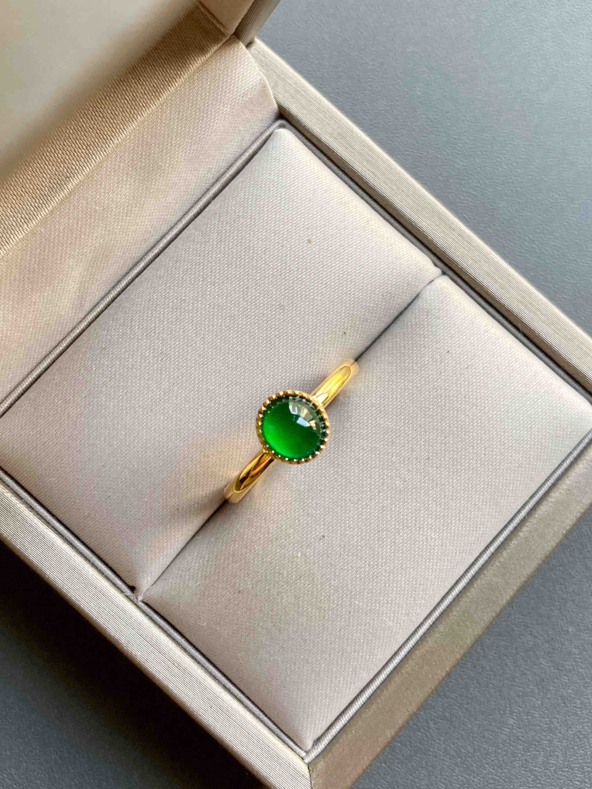 高冰种阳绿翡翠蛋面戒指18k黄金镶嵌