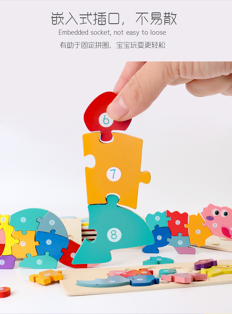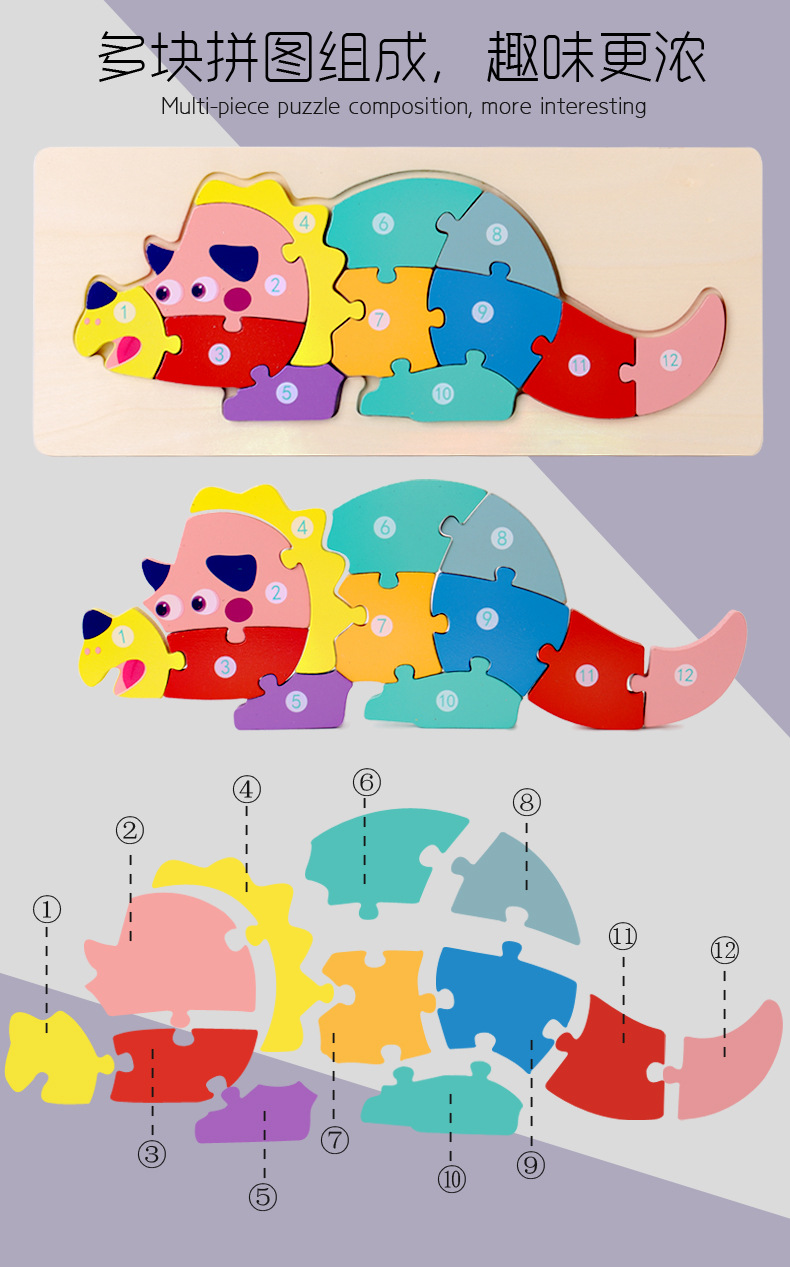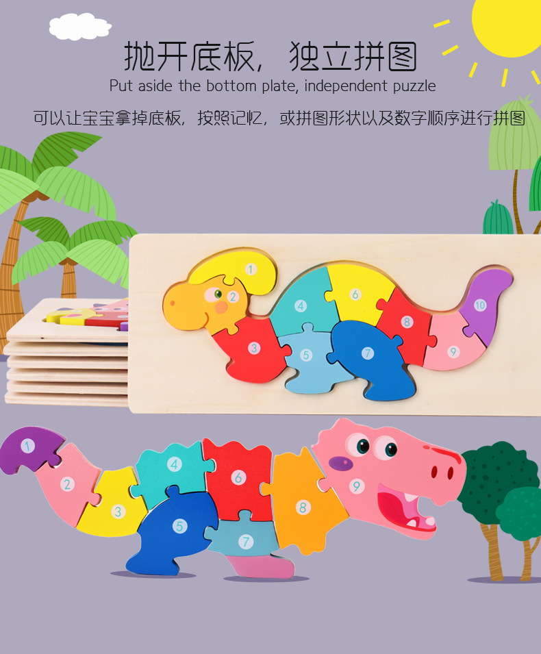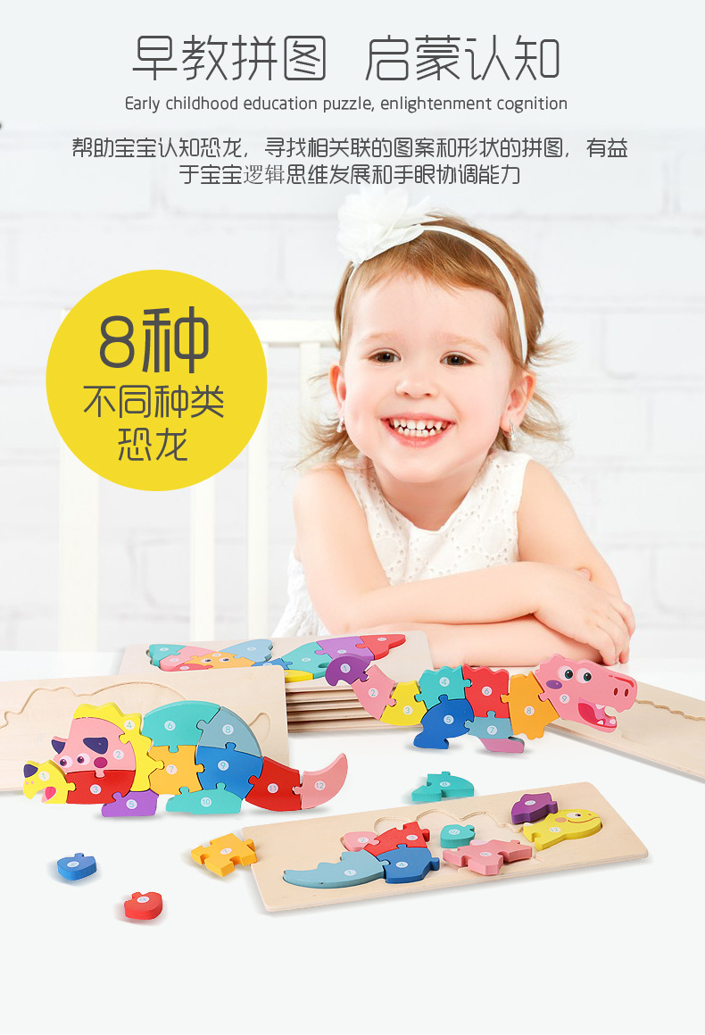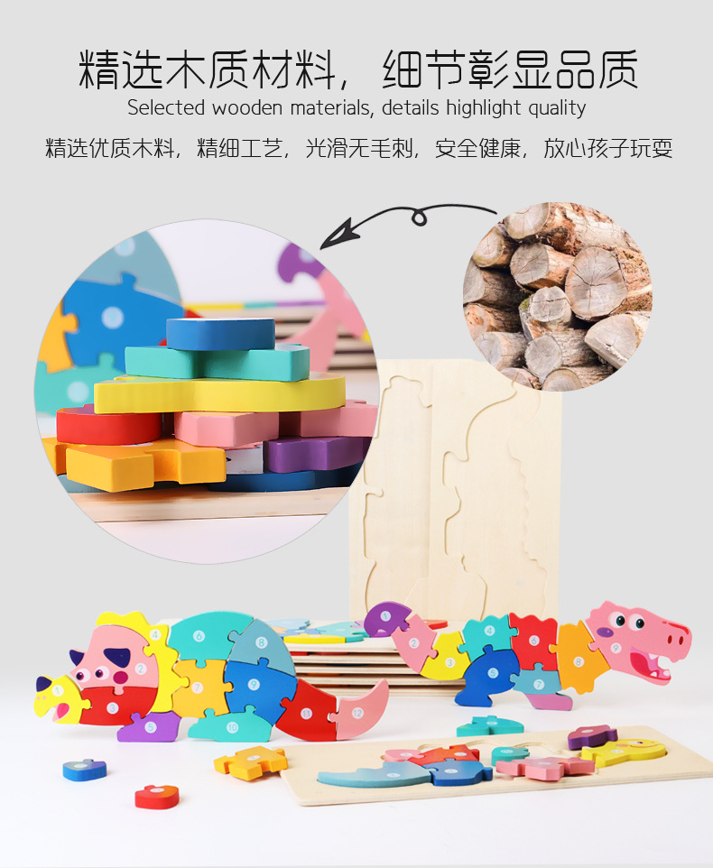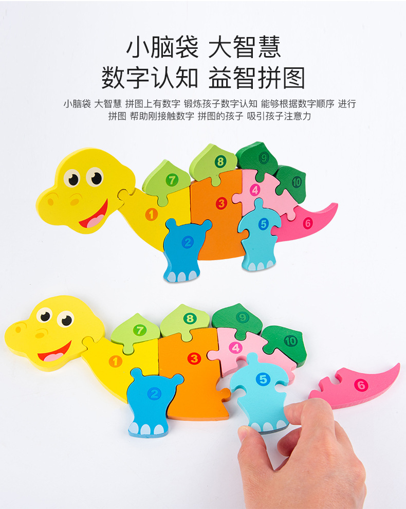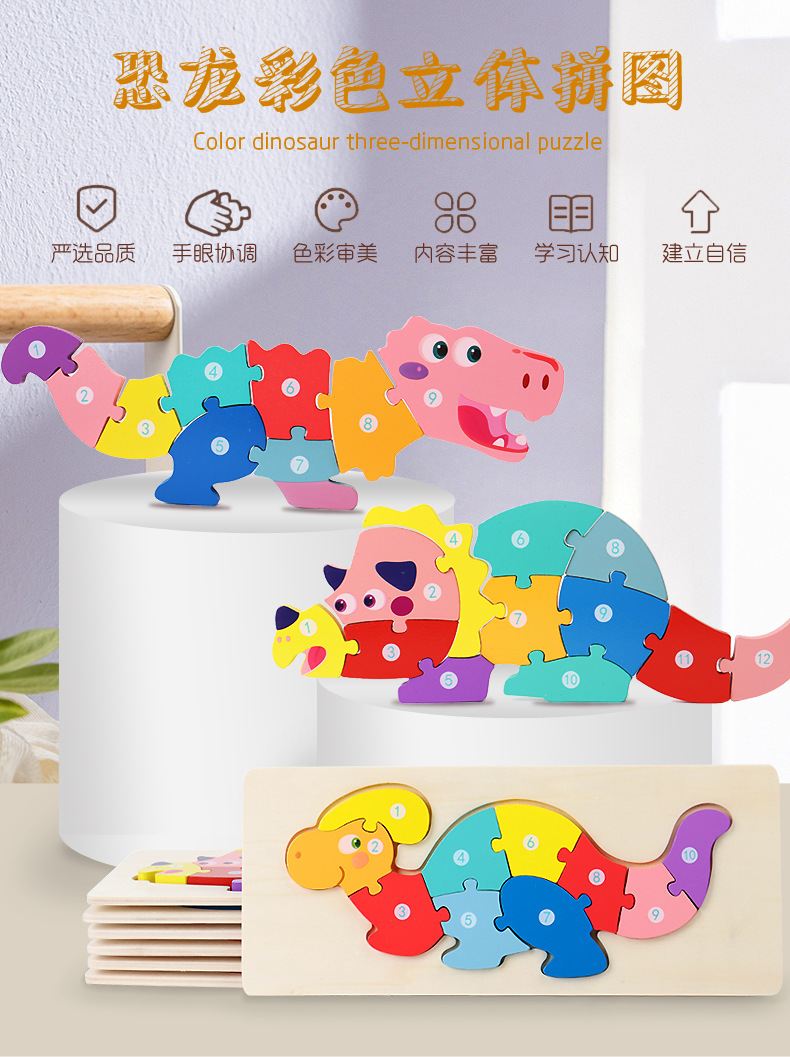 【趣味立体卡通拼图】大号恐龙卡扣3d立体拼图木制玩具幼儿童益智早教木质宝宝积木