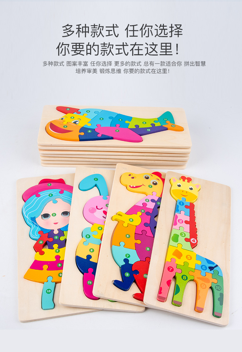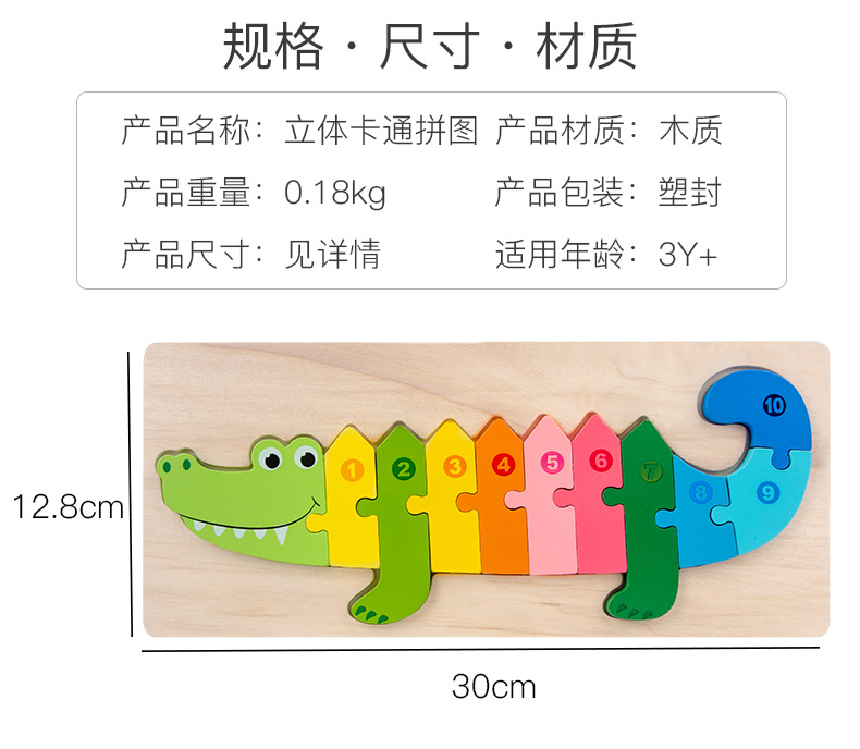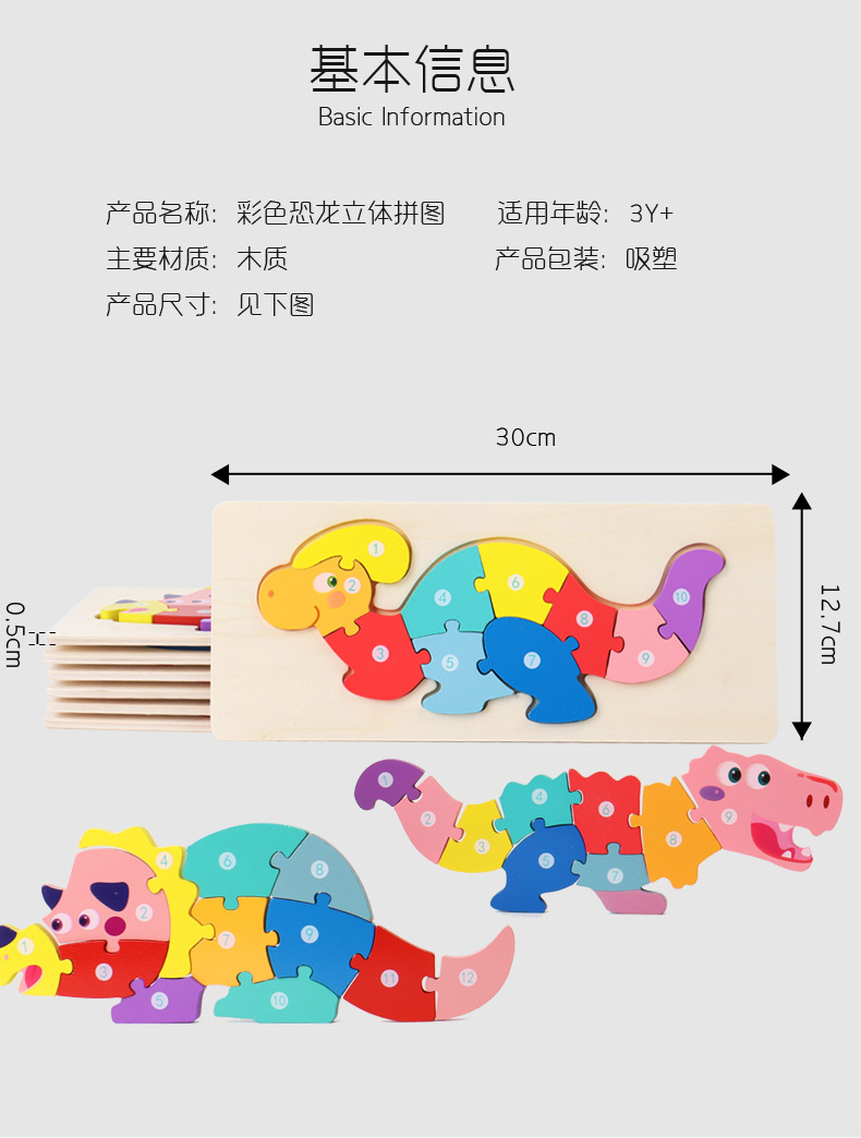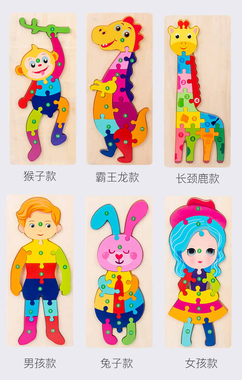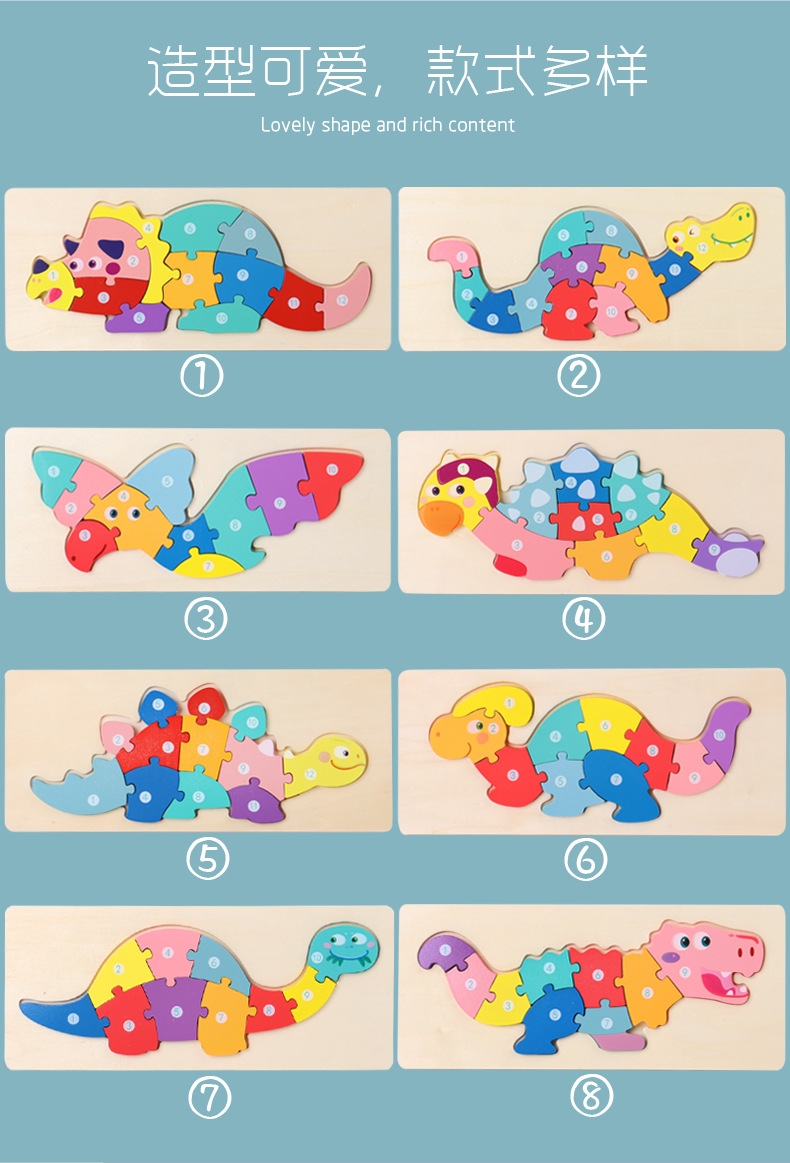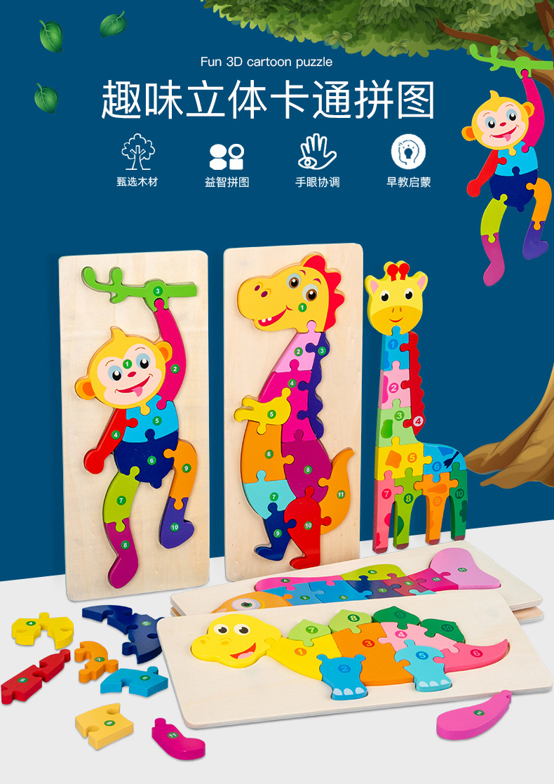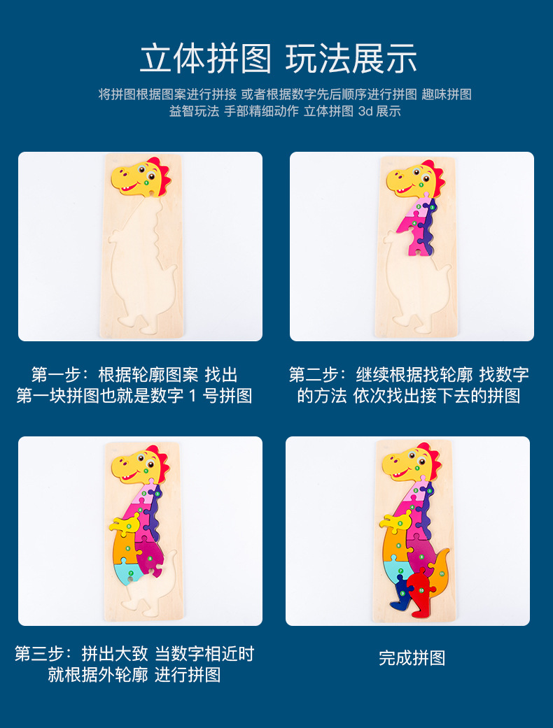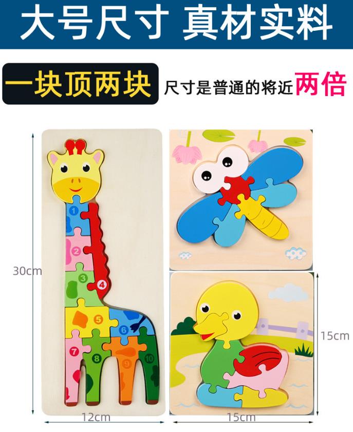 【趣味立体卡通拼图】大号恐龙卡扣3d立体拼图木制玩具幼儿童益智早教木质宝宝积木