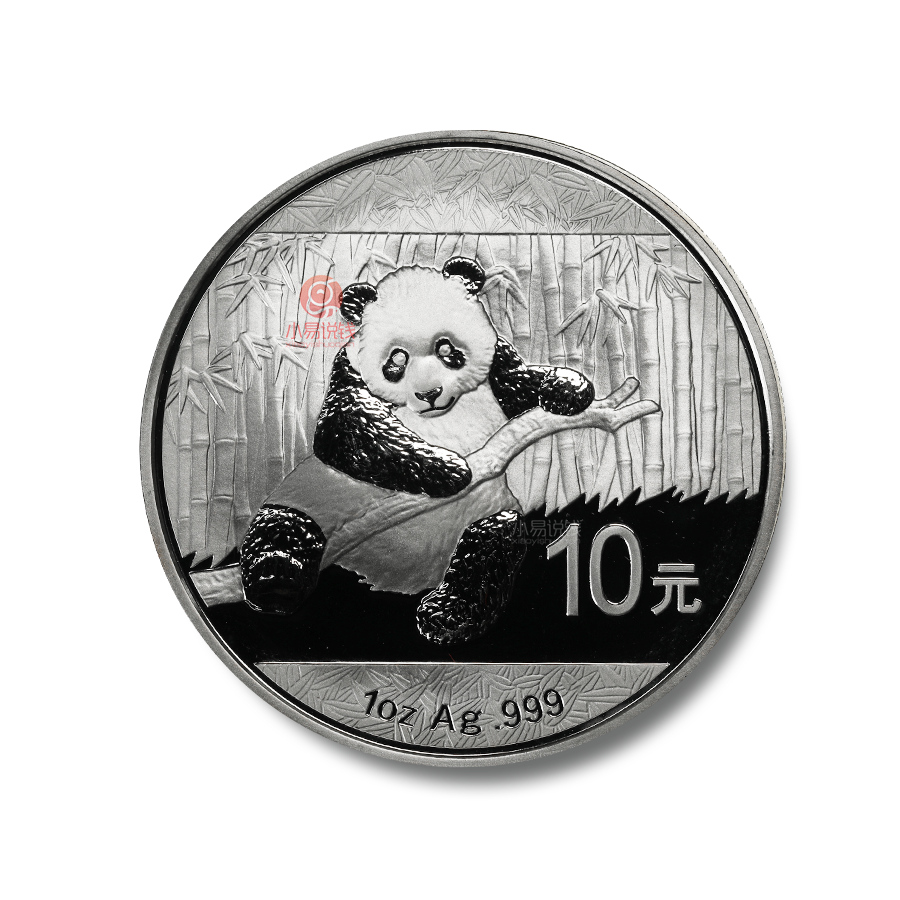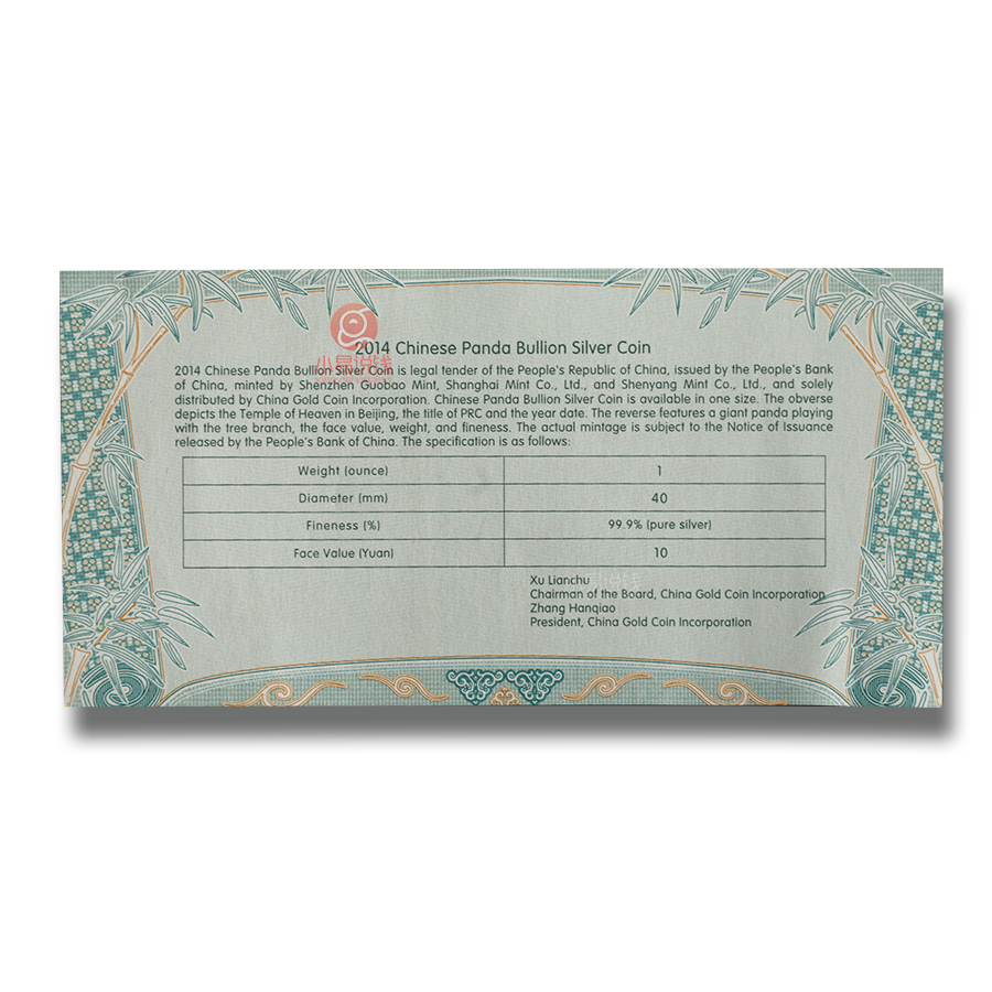 14年熊猫银币,含金总说明书。最大发行量800万枚。