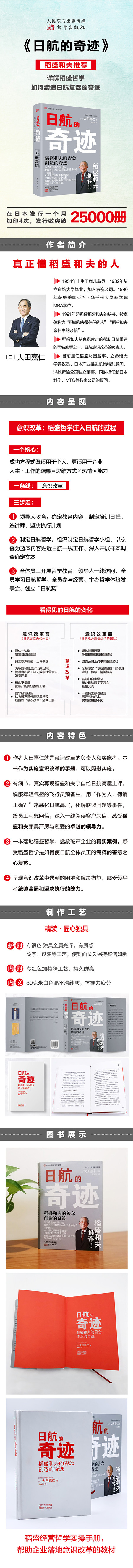《京瓷哲学:人生与经营的原点》的核心内容就是“作为人,何谓正确?”稻盛和夫认为,如果以这种生活态度来度过人生,每个人的人生都会幸福,以这个准则来经营企业,公司也都会繁荣发展。初次接触稻盛和夫哲学的读者也许会认为:“那么简单的东西就可以把企业经营好吗?” “照这样做,人生就会变美好吗?”“这些不就是从小就已经知道的老生常谈吗?”而正是这套质朴的京瓷哲学,让稻盛和夫引领所创办的京瓷与KDDI两家企业晋身世界500强行列、引领盛和塾中许多原本经营不善的日本中小公司转亏为盈,更以短短两年多时间,就让负债超过两兆日元、破产下市的日航起死回生,而且来年甚至创下日航史上最高利润,创下V型反转轰动全球业界的奇迹。