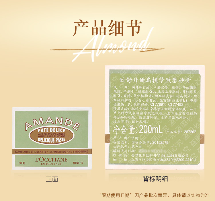 【精选包邮】正品欧舒丹200ml 磨砂甜扁桃紧致磨砂膏 杏仁全身温和补水保湿滋润去角质#