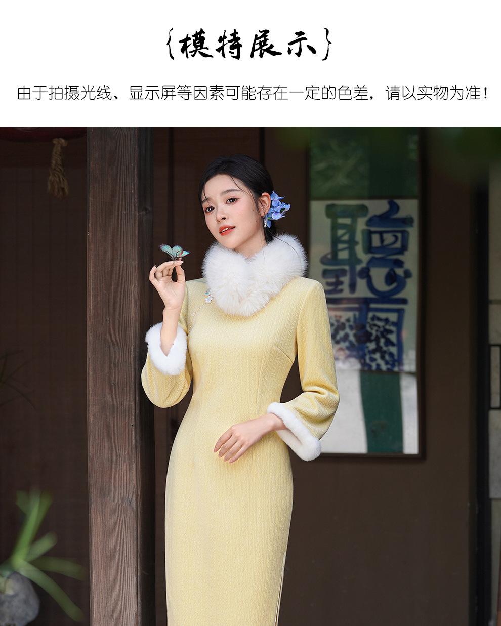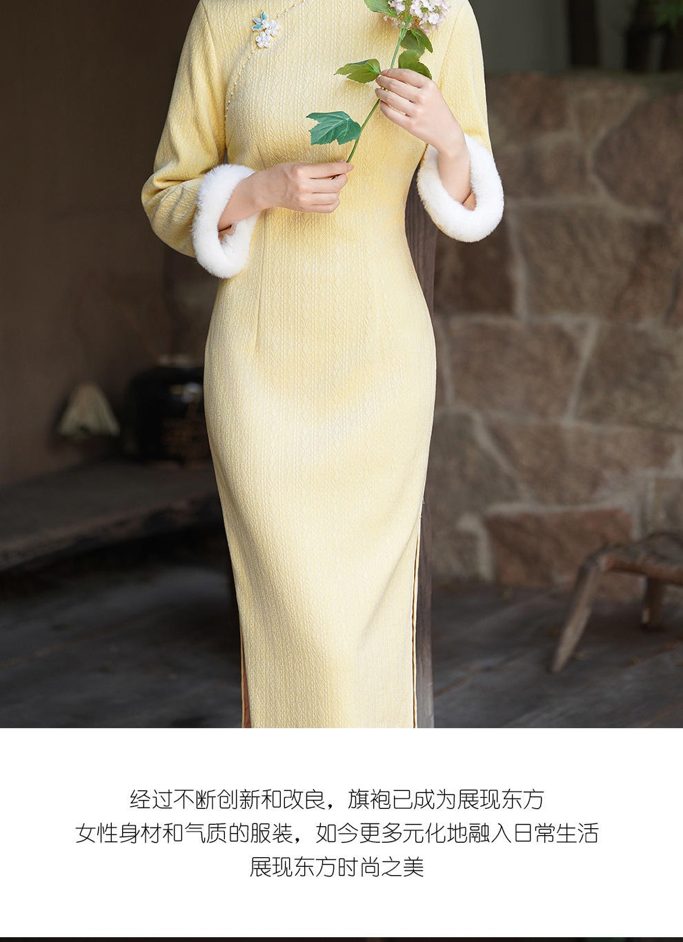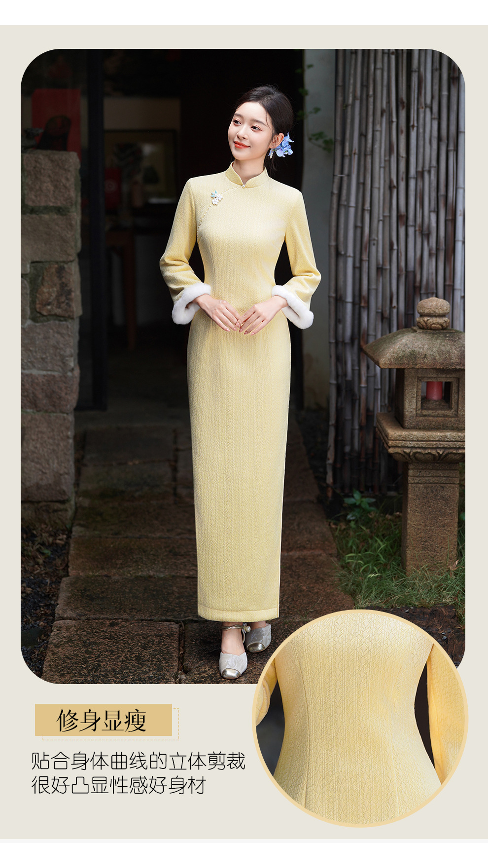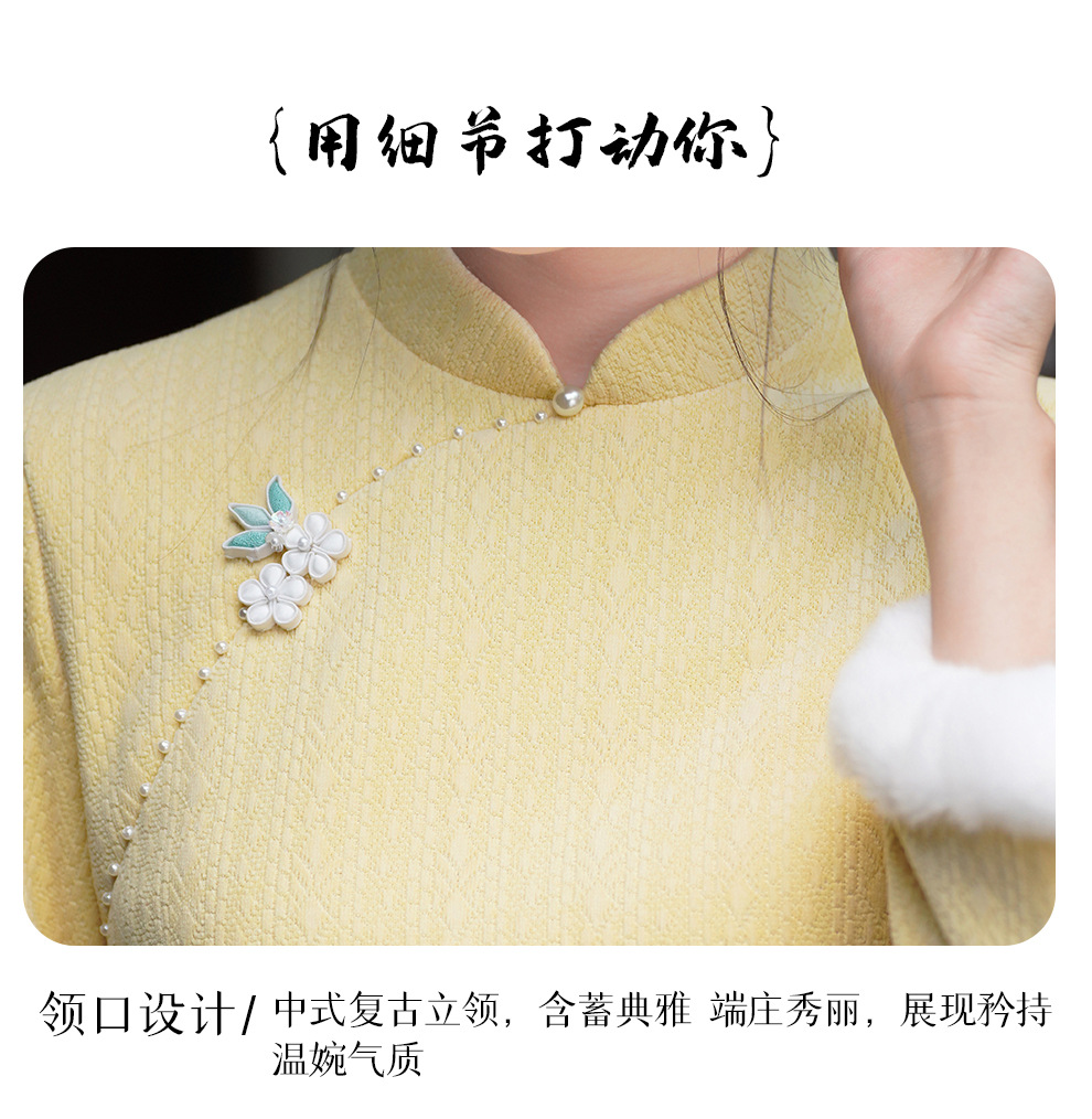 XLY25162复古黄色加绒秋冬国风中式旗袍长袖女2025高端连衣裙年轻新款收腰