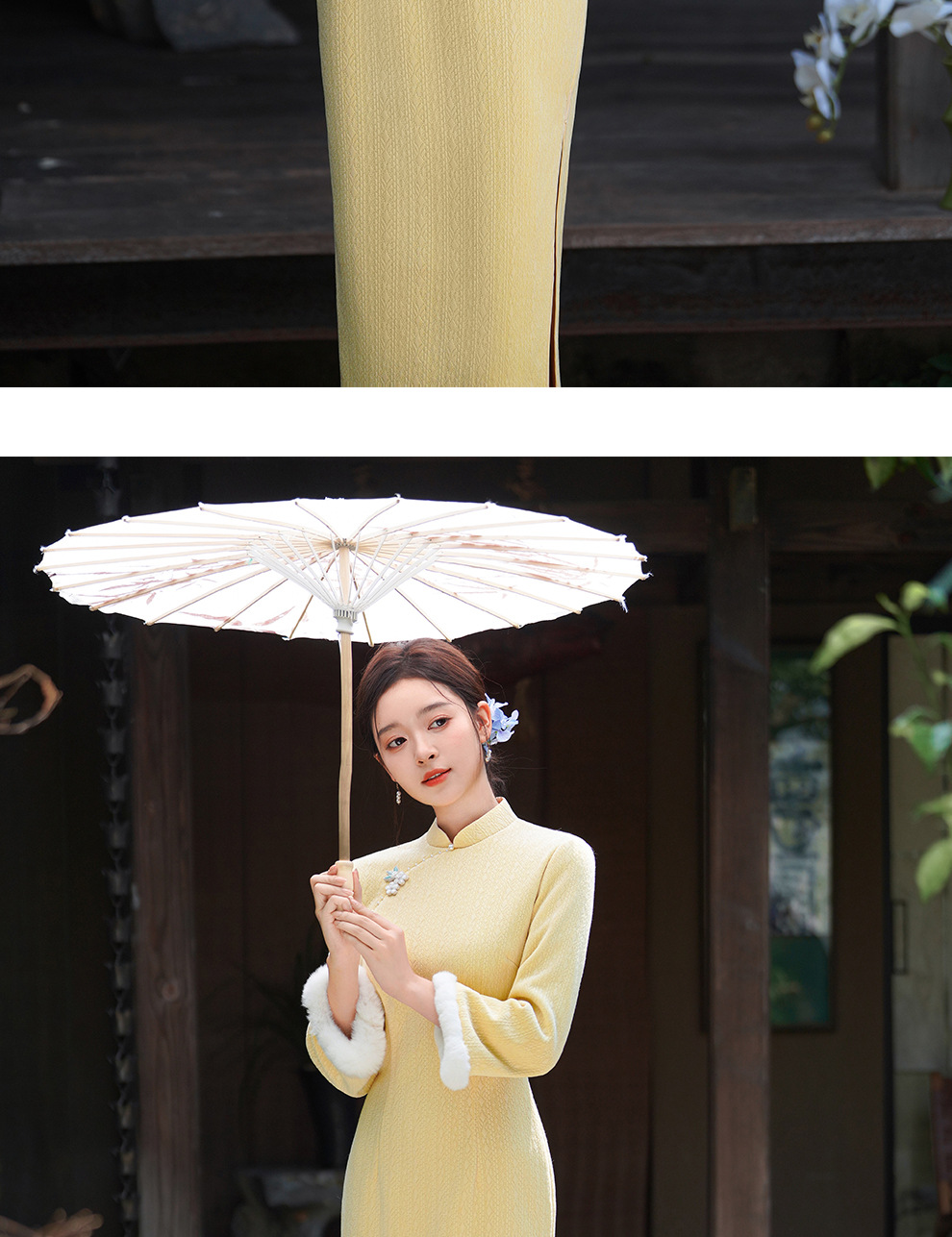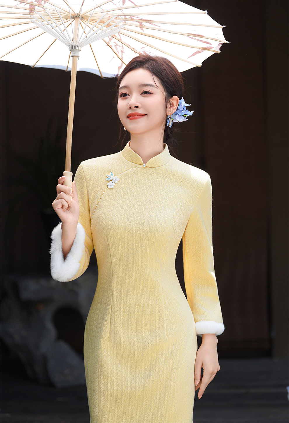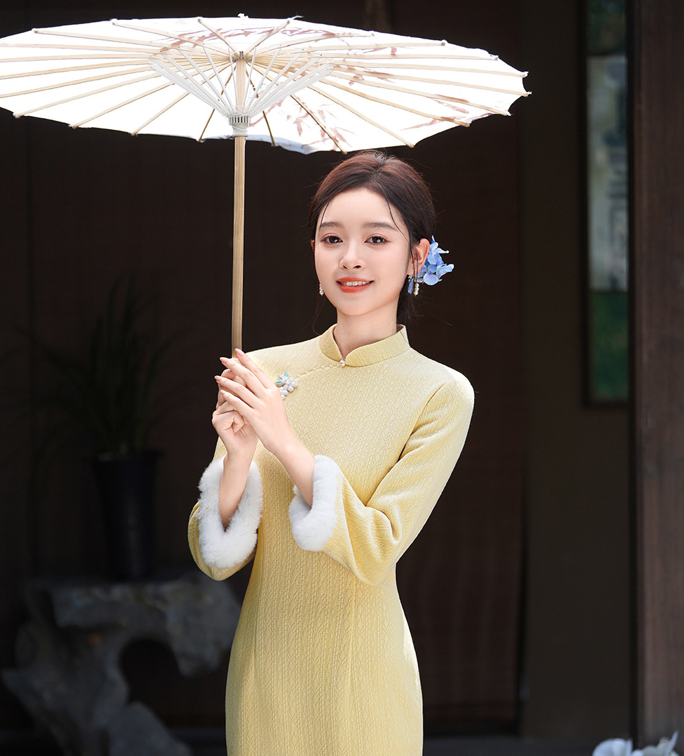 XLY25162复古黄色加绒秋冬国风中式旗袍长袖女2025高端连衣裙年轻新款收腰
