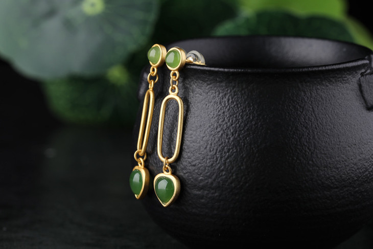 JX03060406宫廷复古925银镀金镶和田碧玉耳坠
