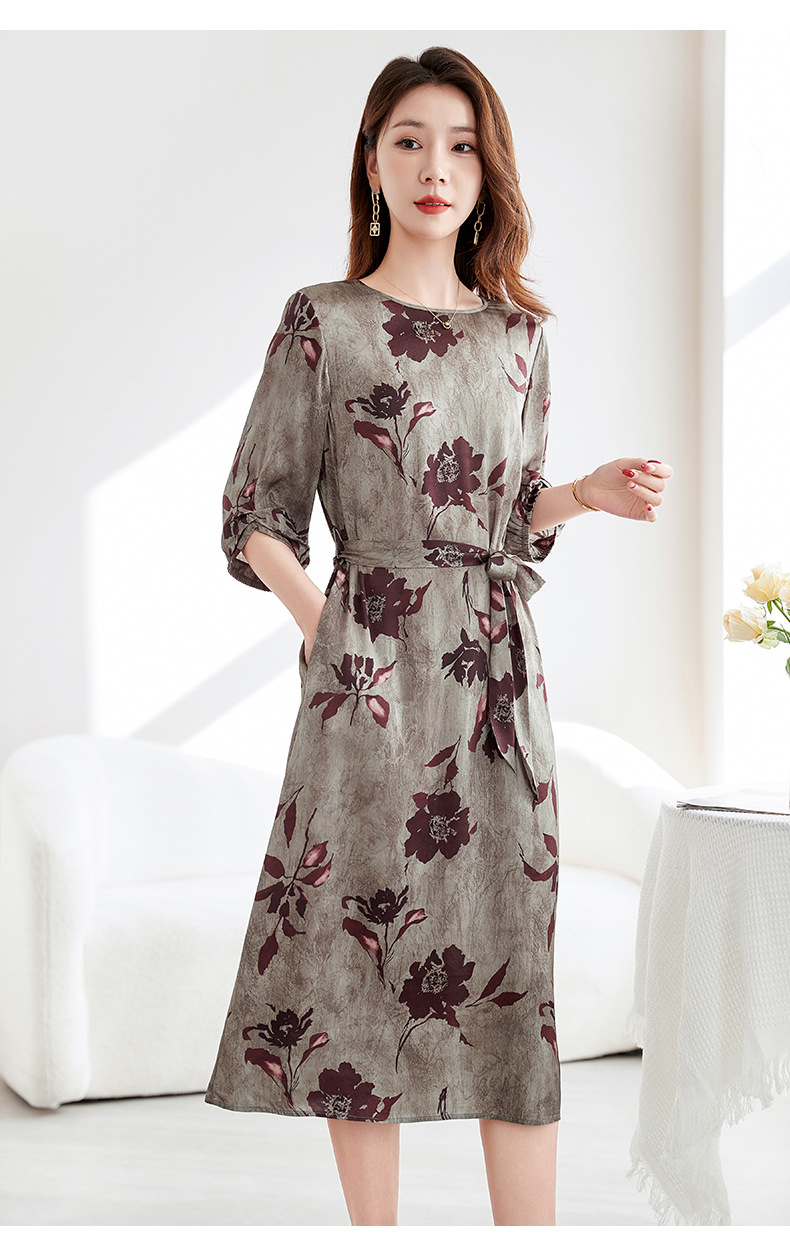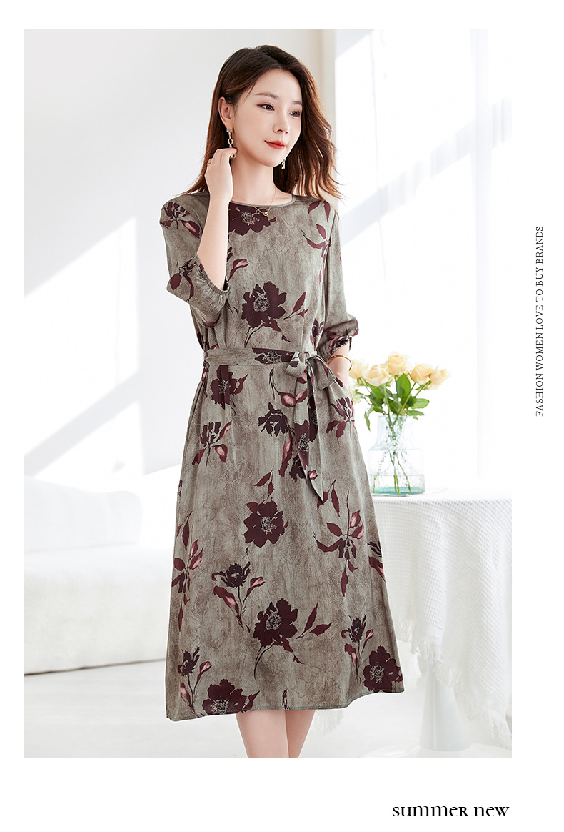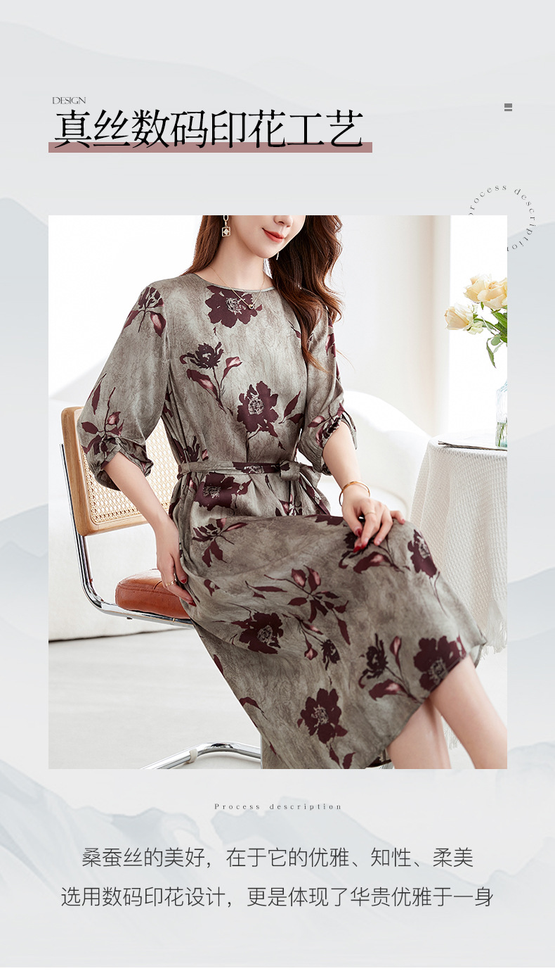 QS-82599190丝绣未央原创国风真丝缎面连衣裙圆领短袖印花桑蚕丝中长裙女9190